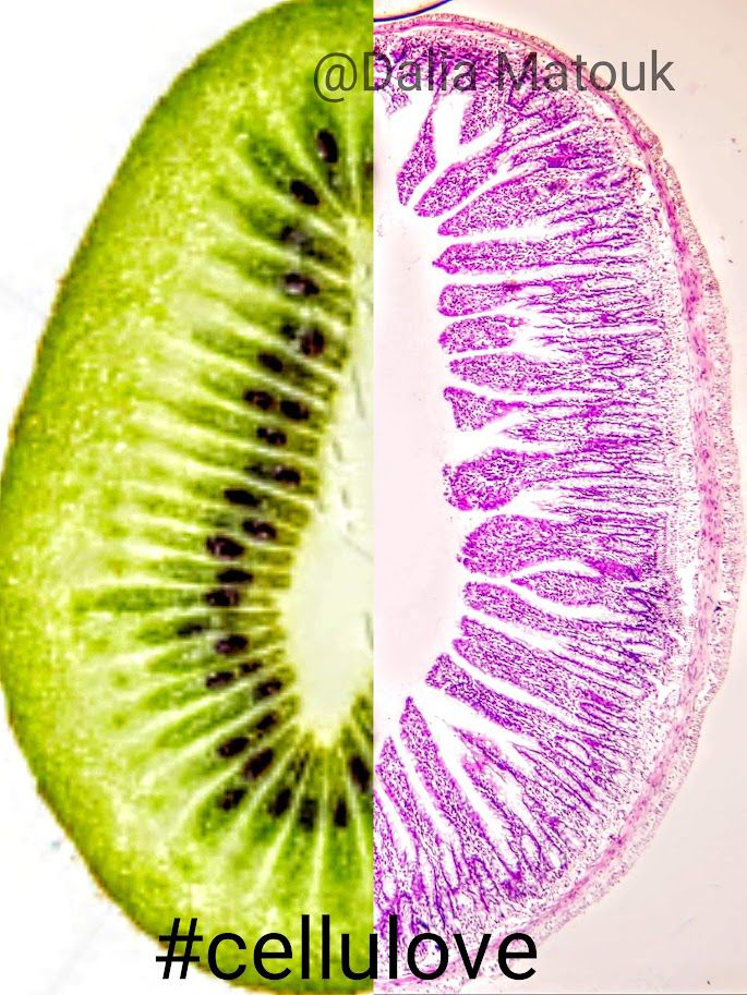 The Kiwi like Jejunum by Dalia Ahmed Yousef Yehia, Lecturer of Medical Histology and Cell Biology, Faculty of Medicine at Ain Shams University, Cairo, Egypt. Jejunum H&E x40. The patterns under the microscope are everywhere around us. Half jejunum, half kiwi. Notice the finger like projections/villi of this part of the small intestine.
