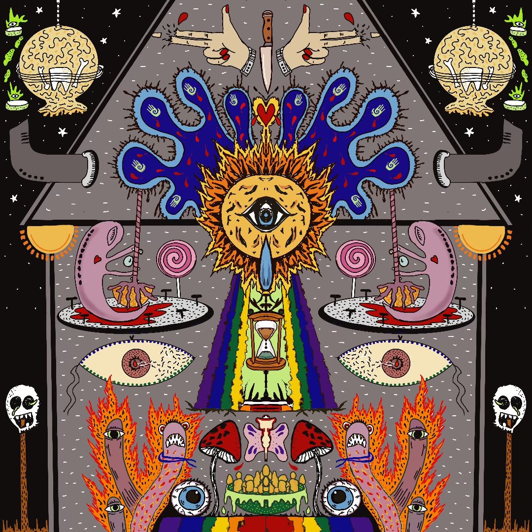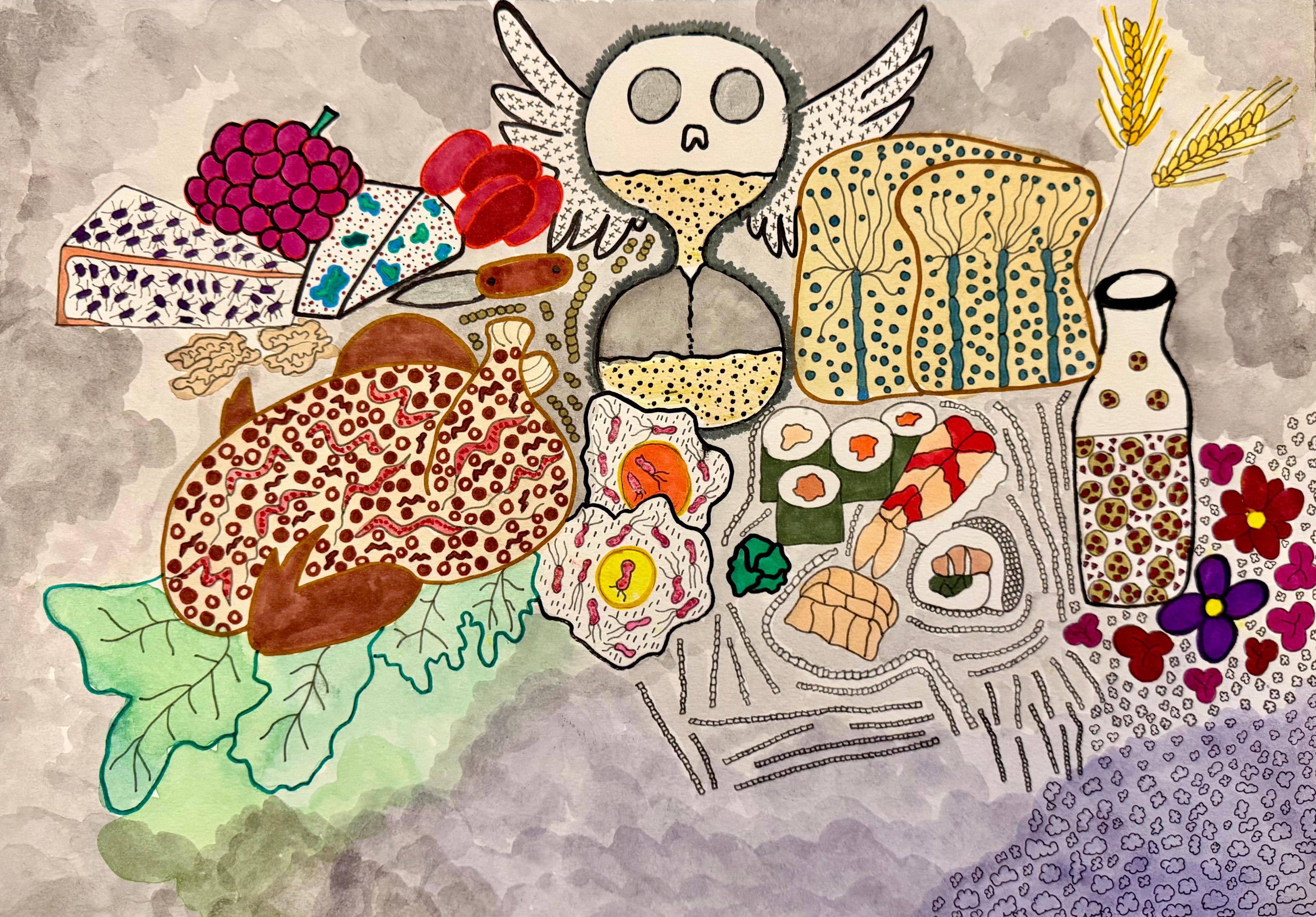 The Last Supper by Fatima Dakroub, Research Associate, American University of Beirut, Hamra, Lebanon. This painting invites us to look more closely at what we eat. Hidden among the food are unseen threats – Aspergillus colonizing bread and tapeworms in raw fish. At its center, an hourglass filled with consequences suggests that what seems harmless at consumption may carry delayed, sometimes serious effects. The Last Supper is not about fear, but awareness – questioning how much trust we place in what we cannot see.