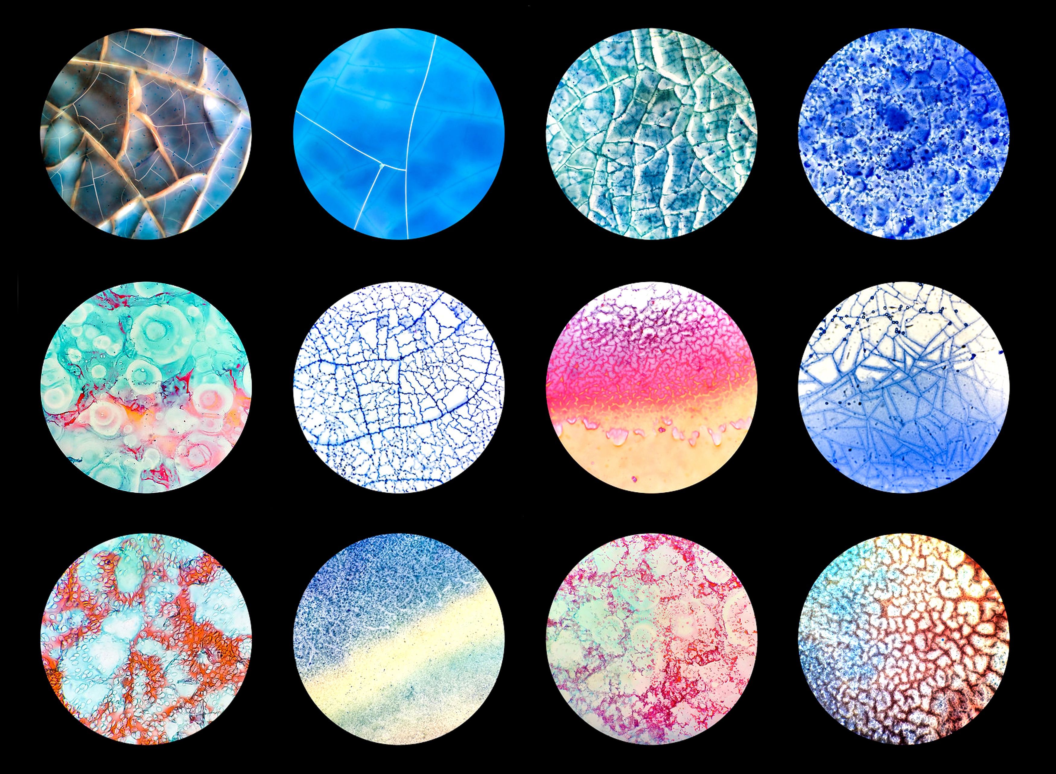 Colors of Colloid by Ziad El-Zaatari, Houston Methodist Hospital, Houston, Texas USA. This image shows the colorful patterns of colloid from thyroid fine-needle aspiration (FNA) samples. Mixed with blood and Papanicolaou stain, the colloid forms striking swirls, cracks, and varied textures. Abundant colloid in thyroid FNA samples is typically a reassuring sign that the biopsied nodule is benign – good news identified through the trained eye of a cytopathologist.