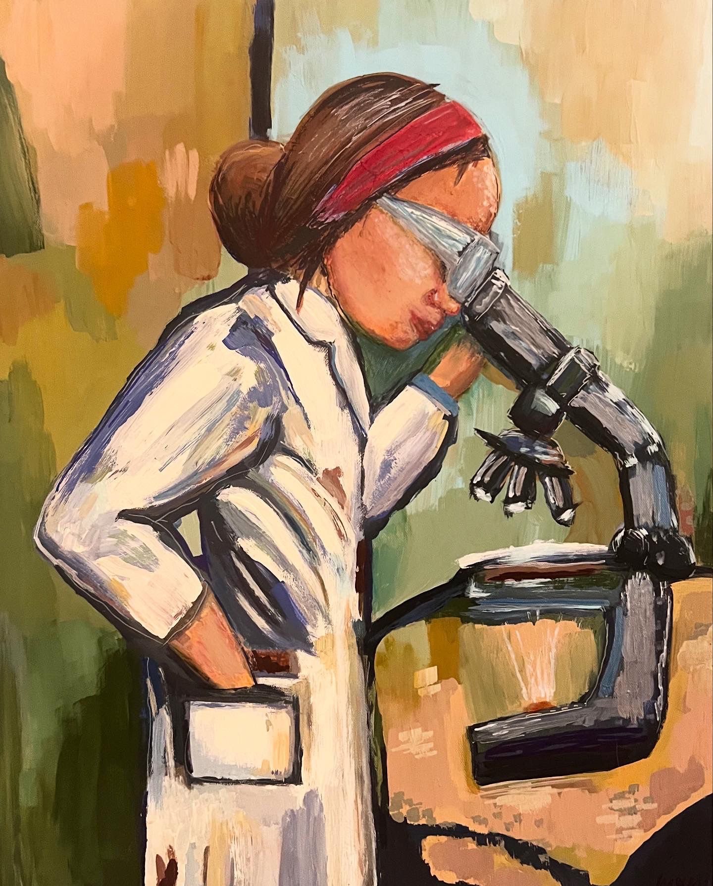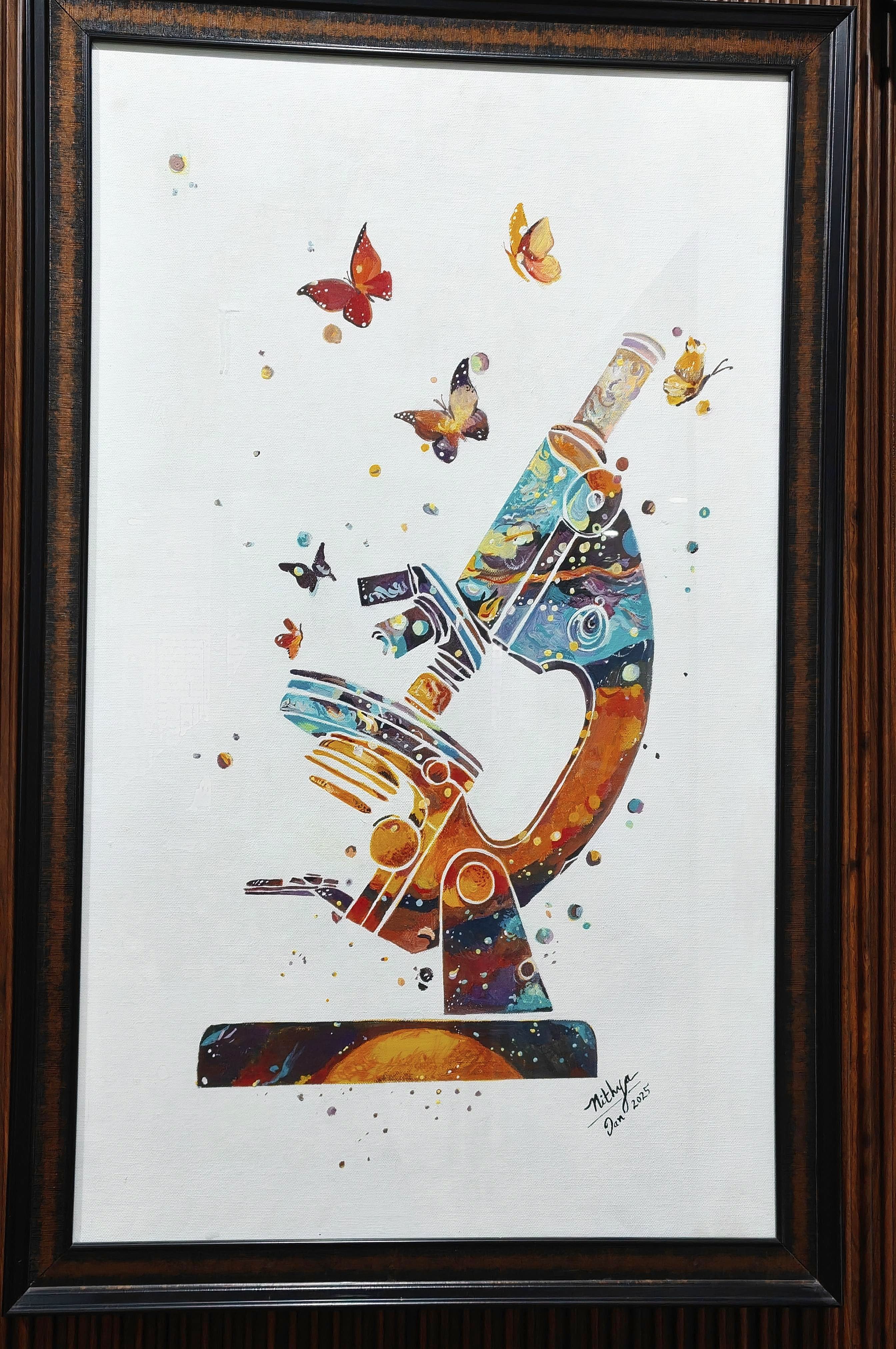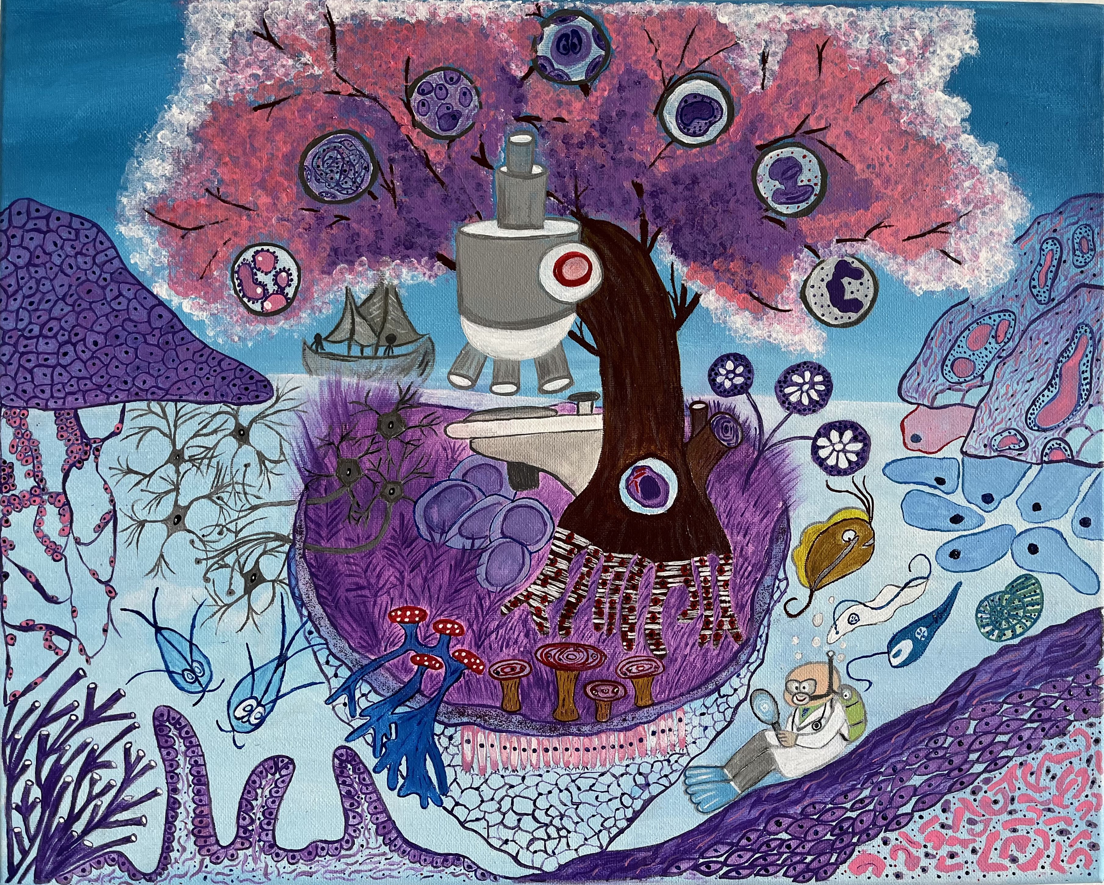 Under the Microscope, Curiosity Grows Wings by Nithya Jayakumar, Pathologist at Bettadur Diagnostics, Raichur, Karnataka, India. Original handmade painting in acrylic medium on canvas.