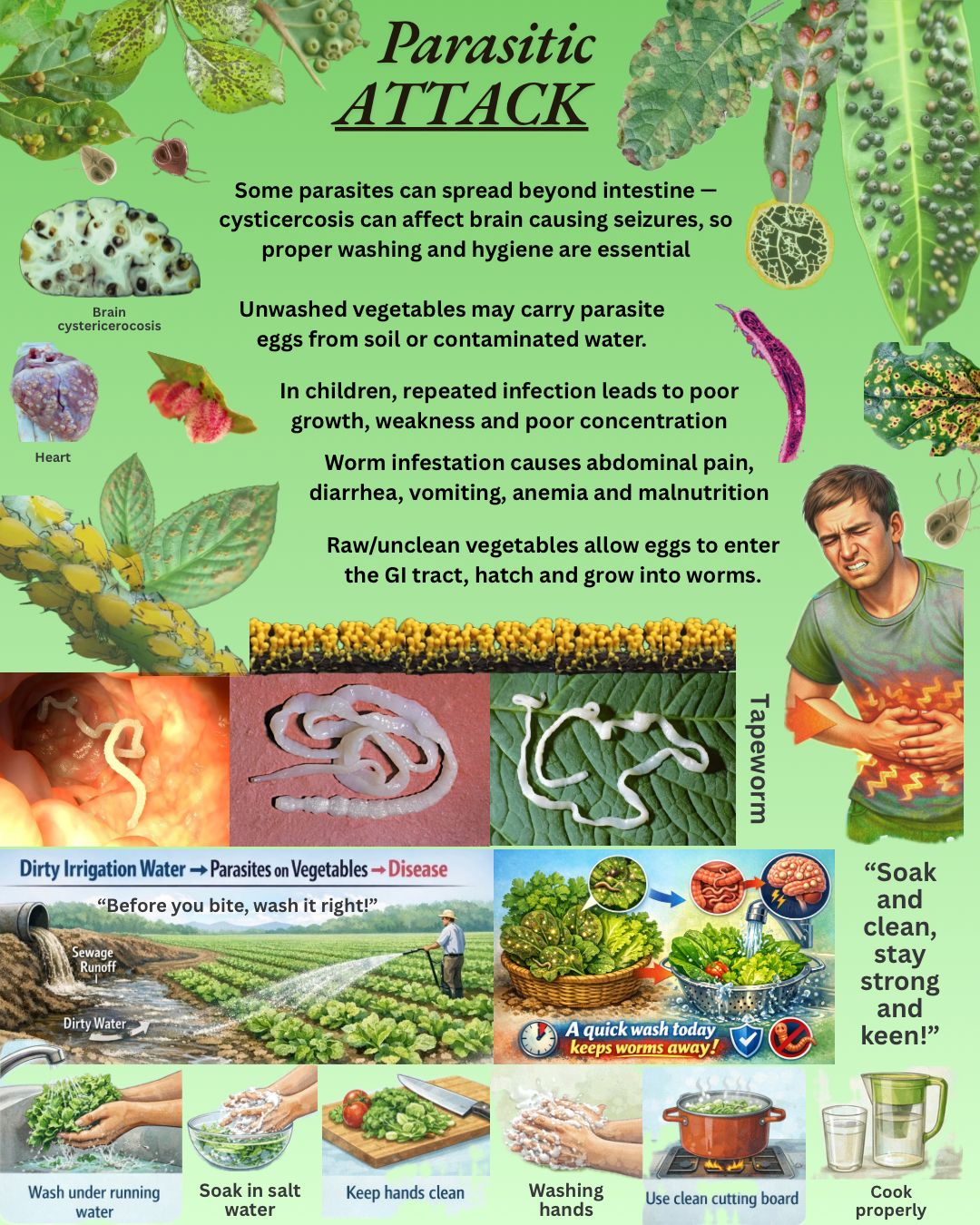 Parasitic Attack by Anuradha Sujitkumar Pal, Second-year MBBS student, SMBT Institute of Medical Sciences and Research Centre, Nashik, India. Fresh vegetables are vital for health, but inadequate washing can turn them into a source of dangerous parasites. Vegetables grown in soil or irrigated with contaminated water may carry microscopic worm eggs that cling to leafy produce such as spinach, coriander, lettuce, and cabbage. When eaten raw or poorly cleaned, these eggs can cause intestinal infections leading to abdominal pain, diarrhea, anemia, and malnutrition, particularly affecting children’s growth and development. In some cases, parasites can spread beyond the intestine – for example, cysticercosis, in which pork tapeworm eggs form cysts in organs, including the brain, causing seizures and neurological complications. Simple food-safety practices such as thorough washing, soaking in salt water, good hand hygiene, and using clean water can prevent serious illness – just a few minutes of care can avert months of disease.