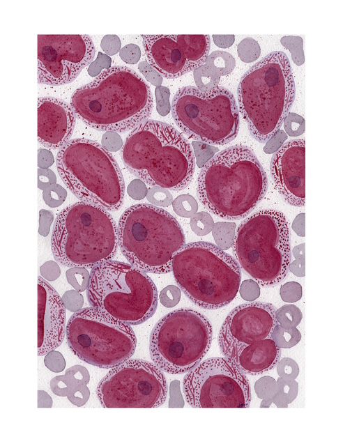 Acute Promyelocytic Leukemia by Virginia Fernandez, Pathology Resident, Department of Pathology and Laboratory Medicine, University of Miami Health System/Jackson Memorial Hospital, USA. Abnormal promyelocytes fill the field, with folded nuclei and dense cytoplasmic granules. Slender Auer rods hint at the dangerous coagulopathy that makes this leukemia a true hematologic emergency. Watercolor illustration.