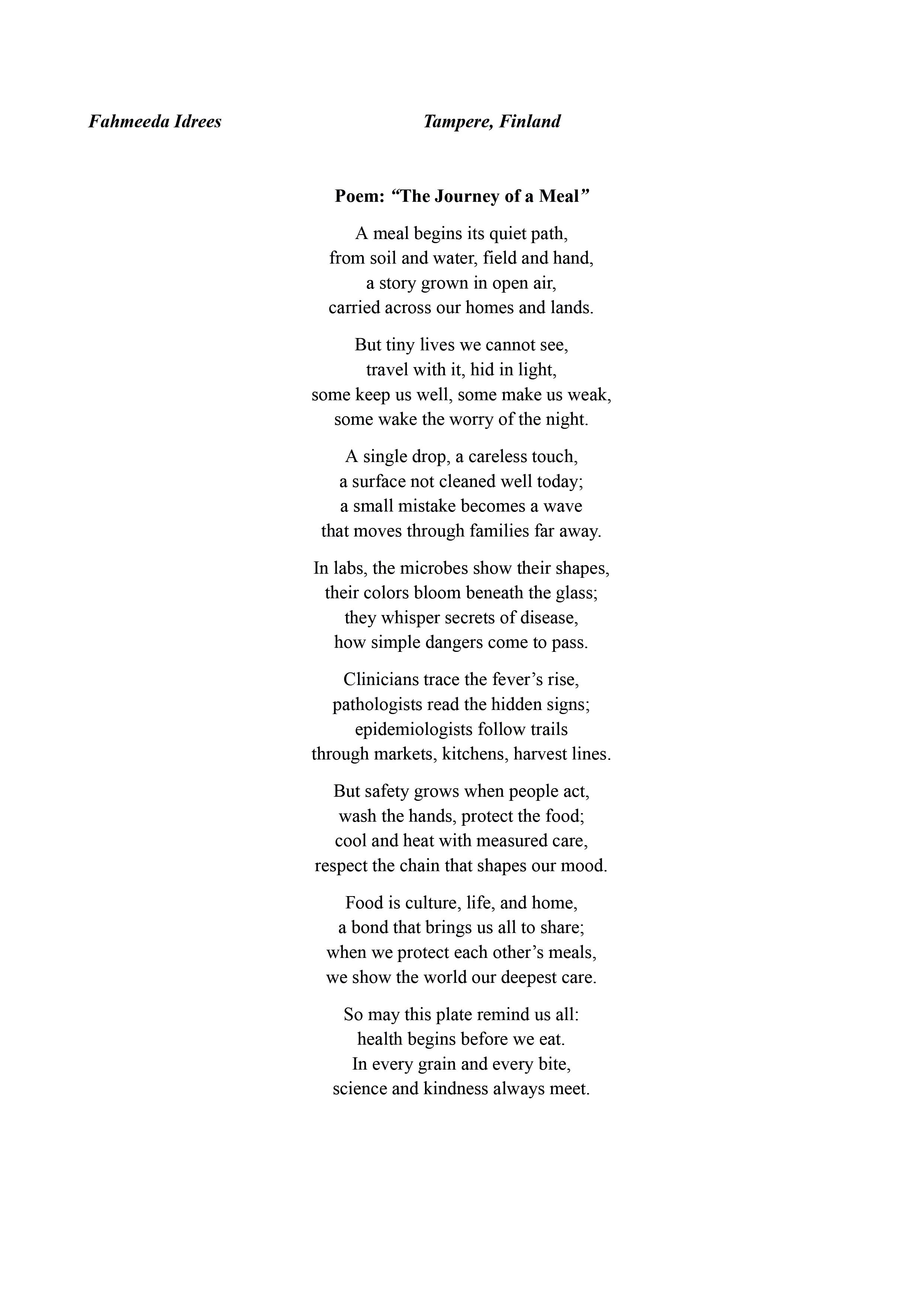 The Journey of a Meal by Fahmeeda Idrees, Researcher, Tampere University, Finland. The Journey of a Meal explores how food travels from source to table, and how unseen microbes travel with it. Through simple, relatable language, it reflects on hygiene, contamination, and prevention. Drawing on my work in public health, the poem highlights how small everyday actions protect communities. I hope it encourages readers to see food safety as both personal responsibility and shared care.