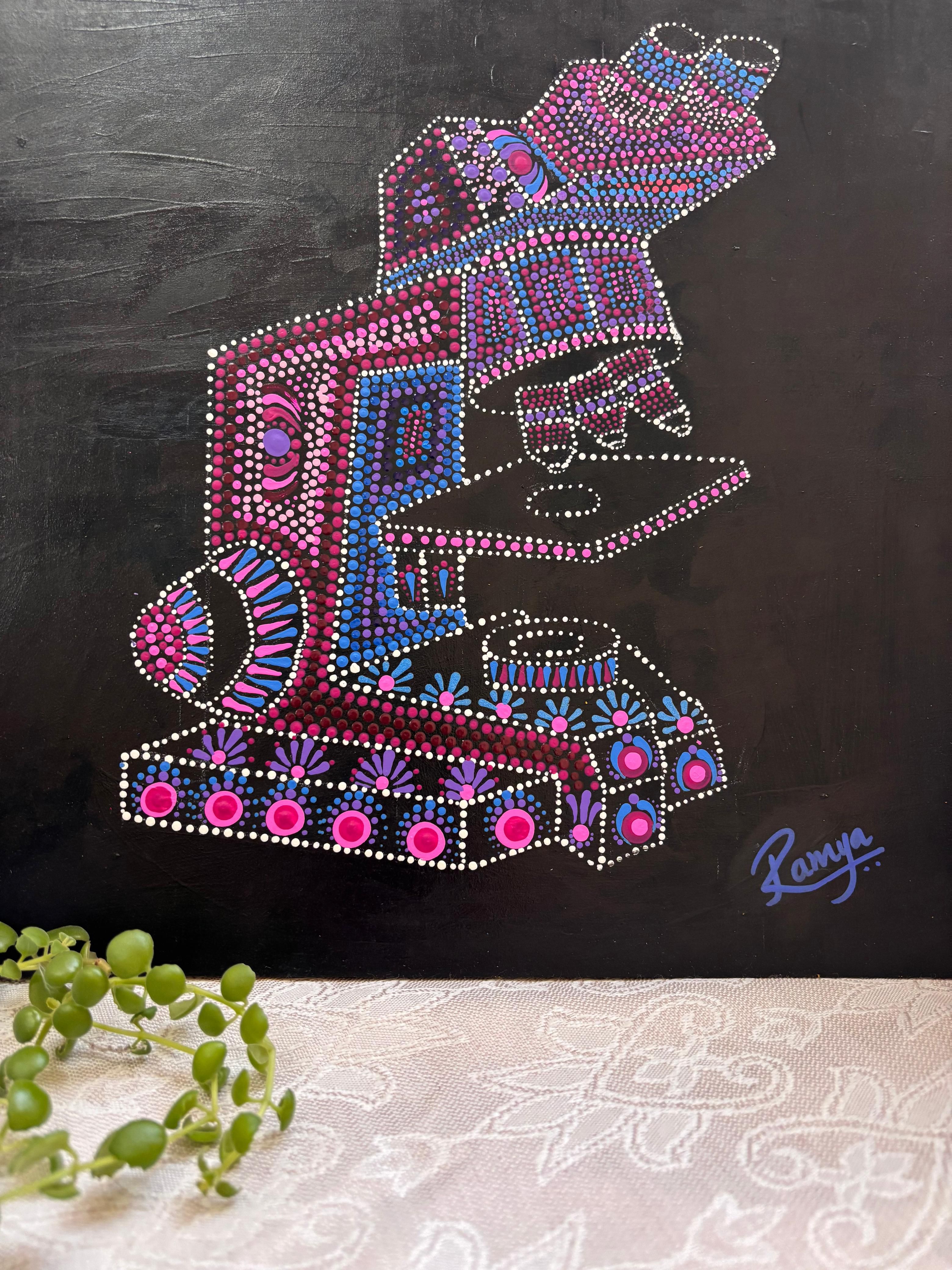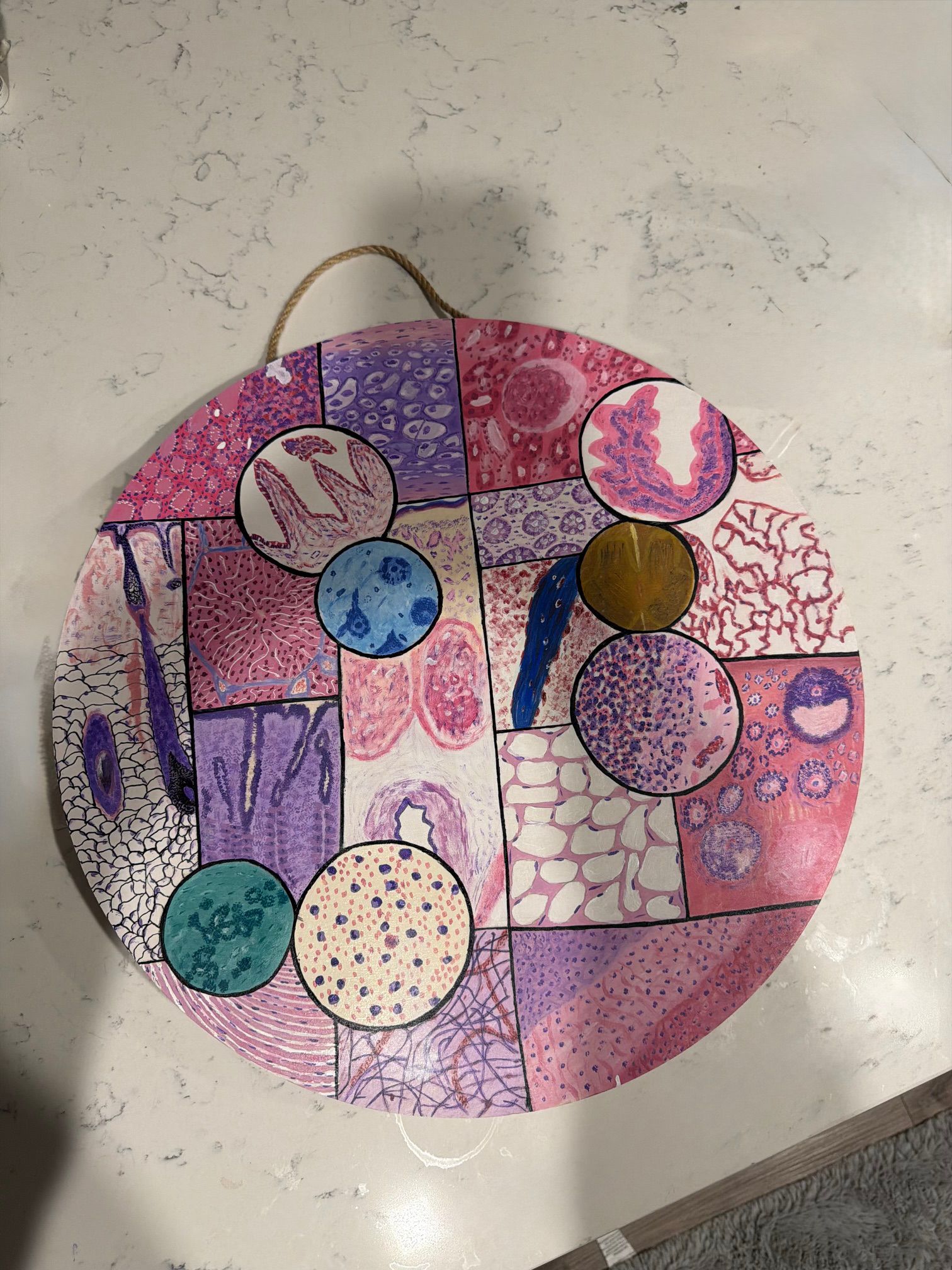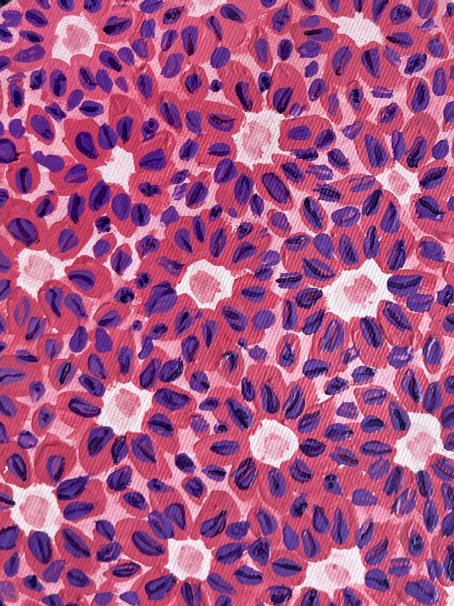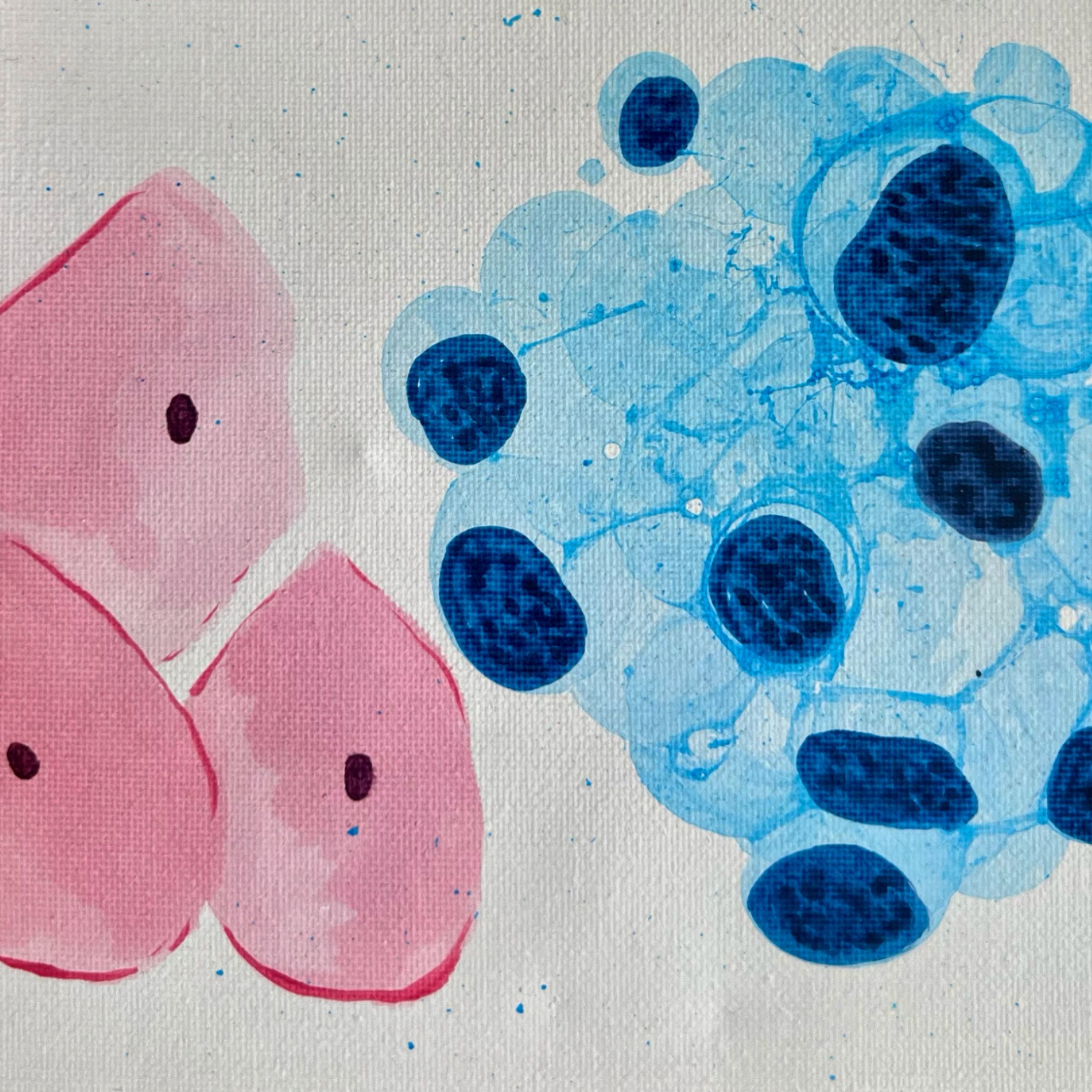 From Cell to Diagnosis by Nithya Jayakumar, Pathologist at Bettadur Diagnostics, Raichur, Karnataka, India. Original handmade painting in acrylic medium on canvas.