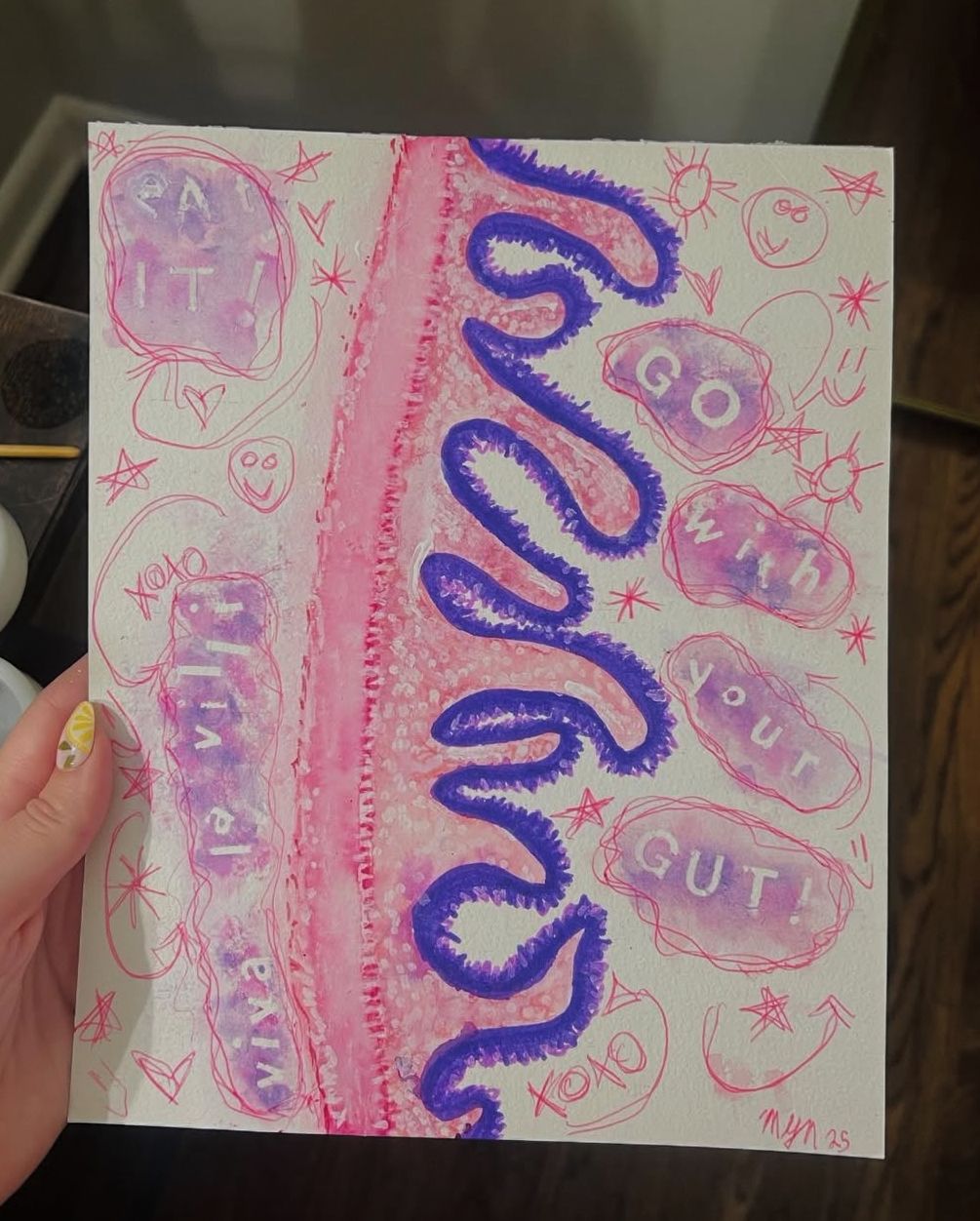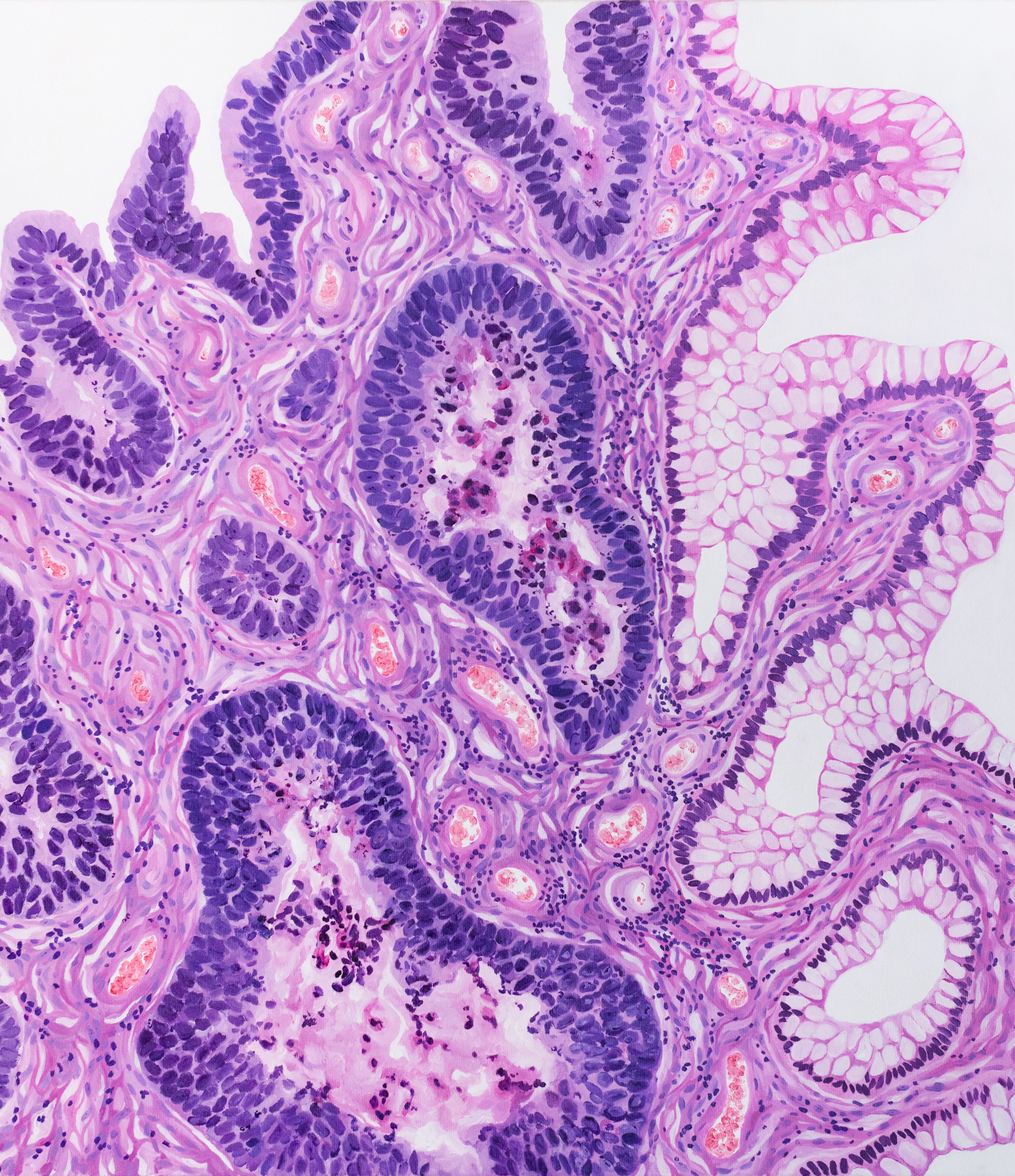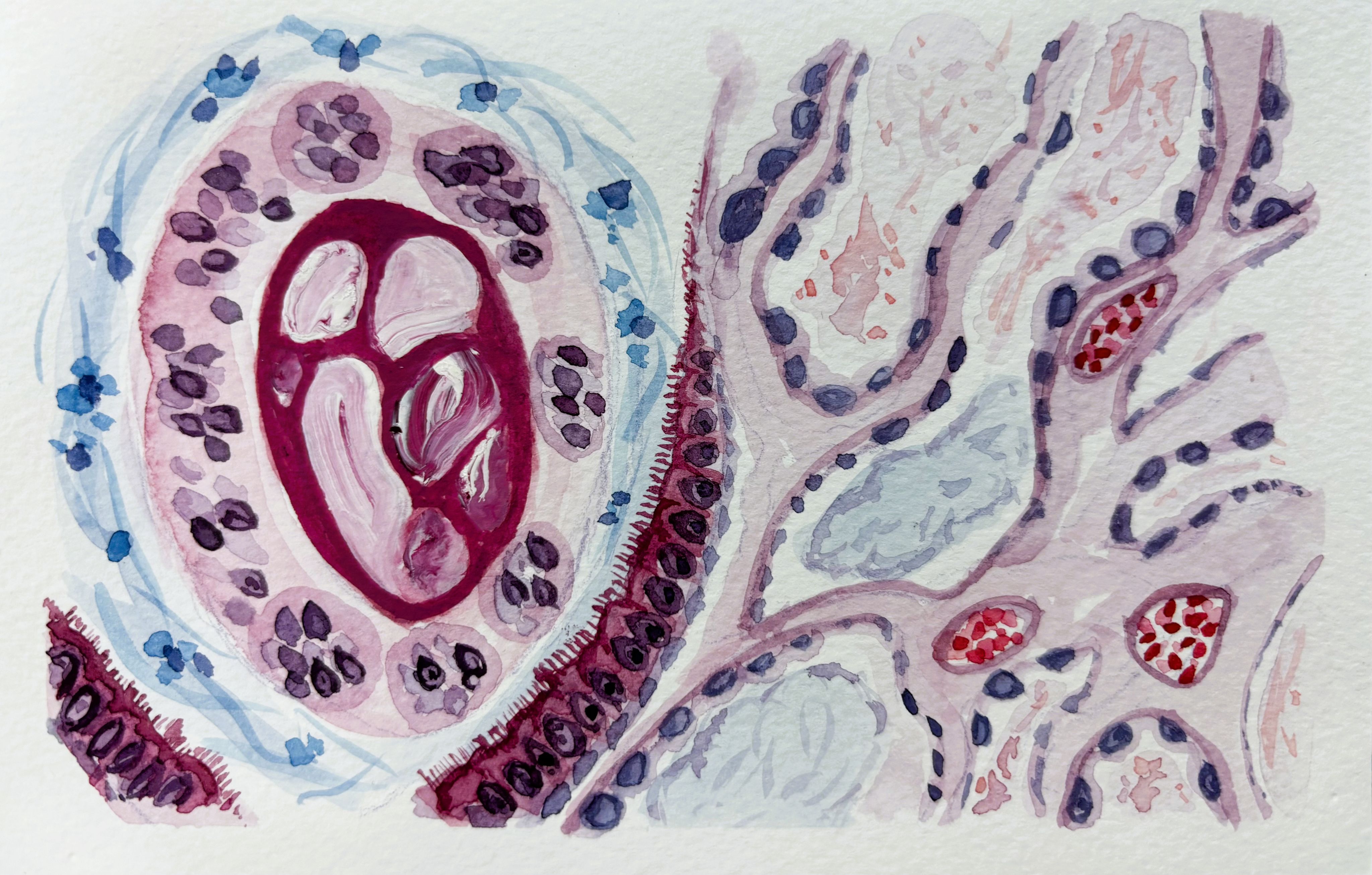 Viva La Villi by Mattie Grace Neighbors, first year medical student at the University of Arkansas for Medical Sciences, US. 8x10 watercolor depicting intestinal villi.