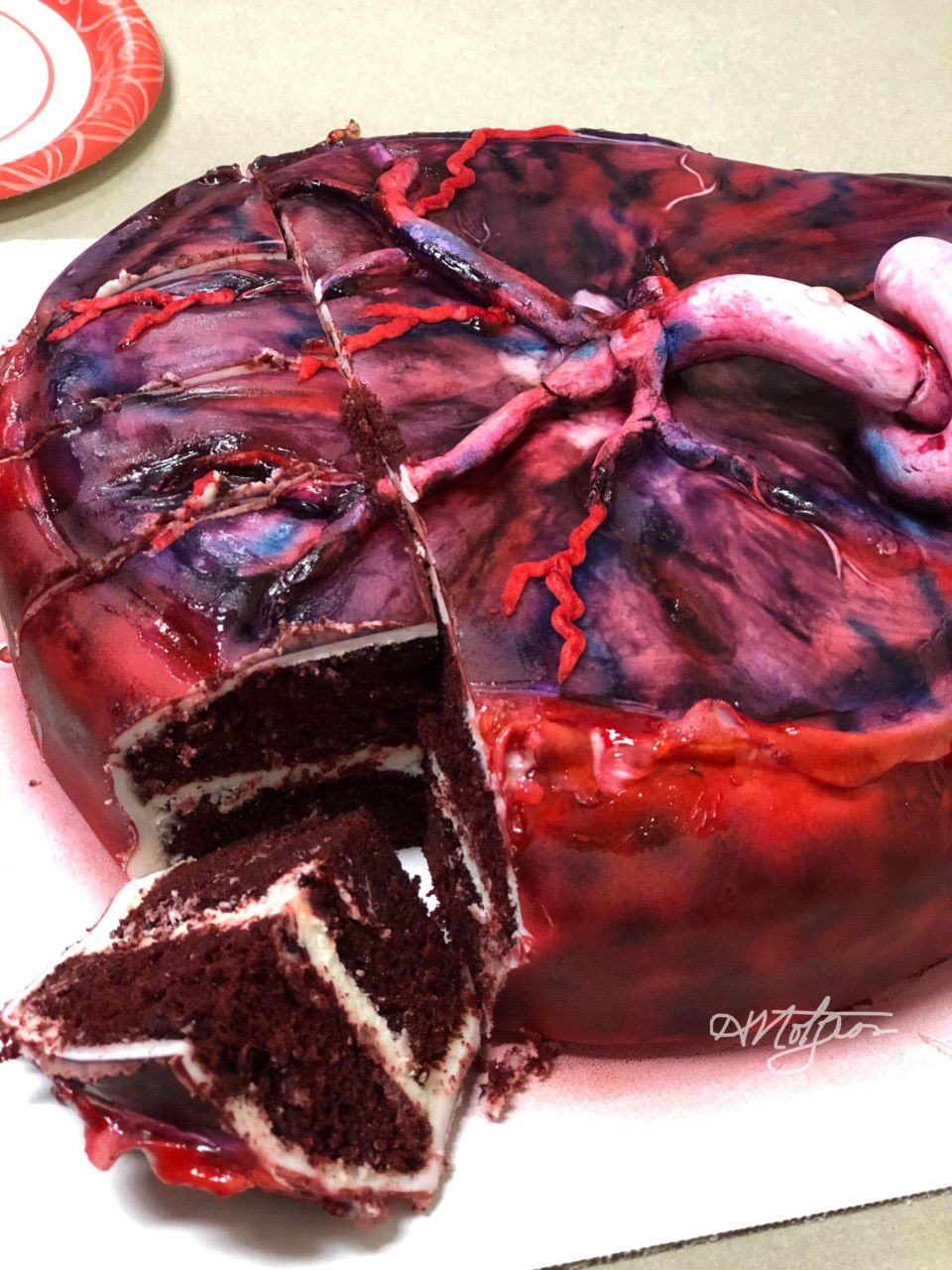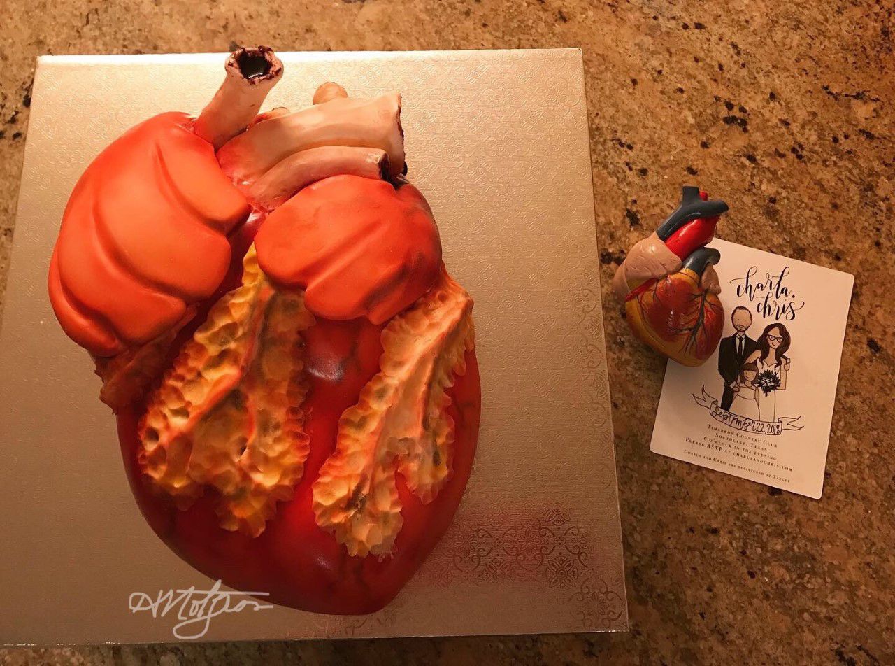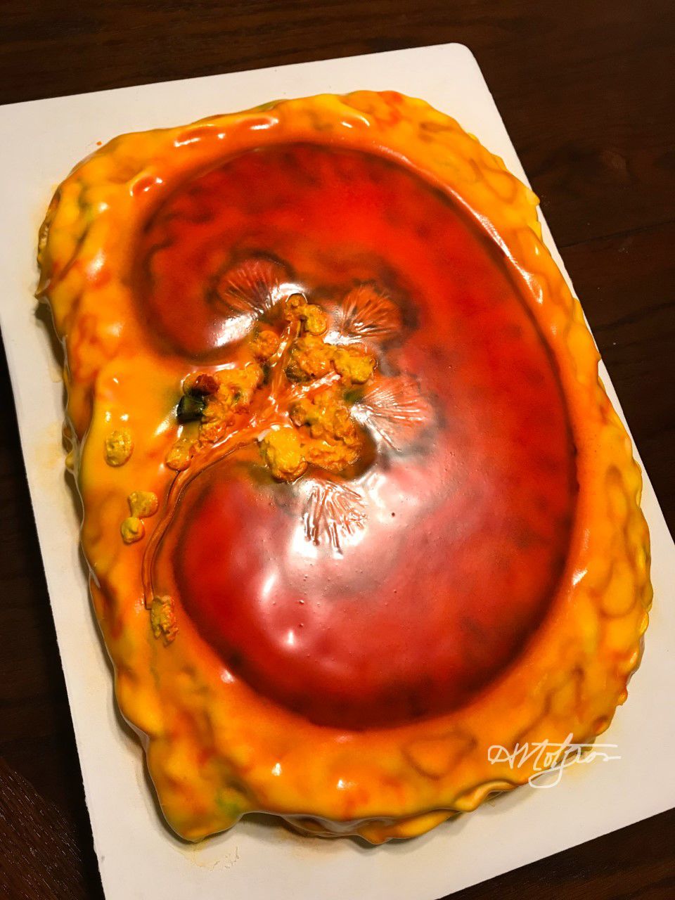 Placenta uncut cake by Hollis H. Notgrass, Lead Pathologists' Assistant, Tissue Lab/Frozen Room Supervisor, UT Southwestern, Clements University Hospital, USA. I have been a self-taught cake decorator for more than 20 years, alongside a career in pathology that is nearly as long. One of the most meaningful moments of my life was creating the groom’s cake for one of my PA students, who proposed to the love of his life in our laboratory using a heart-shaped anatomical “ring box.” They later asked me to recreate that heart in cake form for their wedding, which I made as a red velvet cake covered in fondant. Other favorite creations for our pathologists and staff milestones include a placenta cake, a kidney cake, a “cuterus” cake for one of our HTs, a mandible cake topper made of fondant, and a farewell cake for a PA colleague complete with fondant “tools.” I love the intersection of my lifelong hobby and my career in pathology, and I would be delighted to be part of the PathArt project – although I’m not sure how well it fits under “food safety,” except to say these are the only pathology “specimens” I’d ever consider bringing to a party.