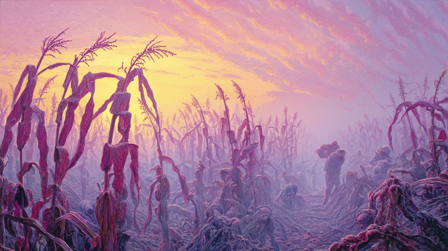 Famished Workers Harvesting Sick Corn During Sunrise by Aliosha Feuss, Paris, France. The image shows crop workers harvesting corn at sunrise – overworked and hungry – while much of the crop is blighted with Fusarium and only a few plants remain untouched. Interpreting “Food Safety” as the security of feeding all, the piece reflects how fungal resistance and climate change threaten that stability. Created from an original Midjourney prompt, it draws viewers in with warm sunrise tones before revealing a darker undercurrent of unease.