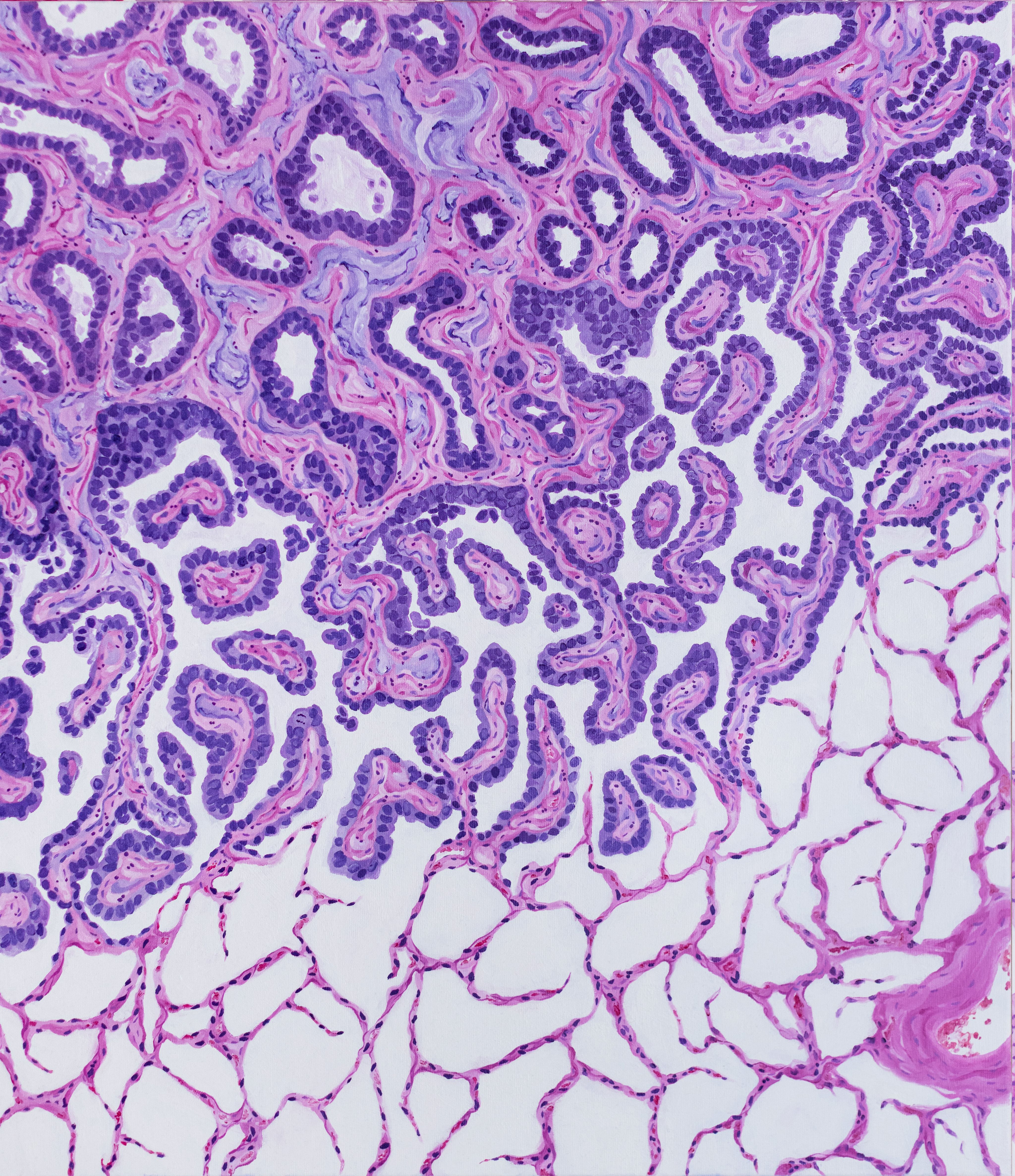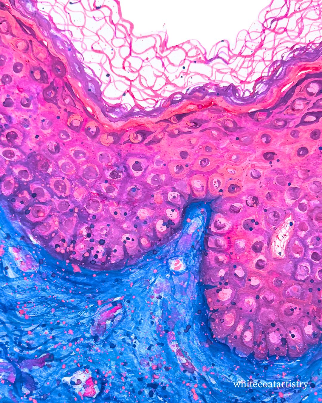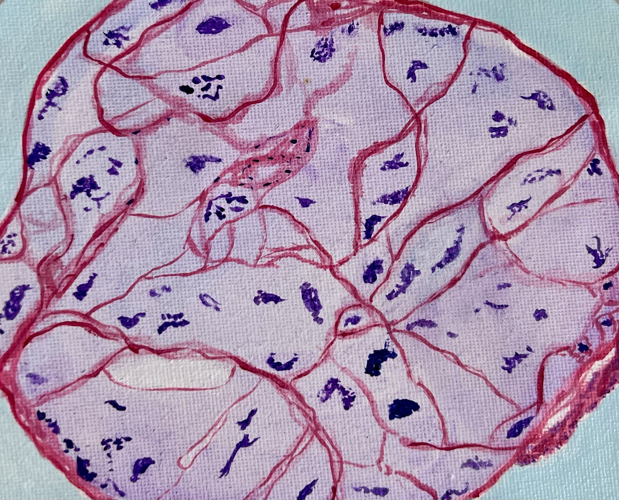 Collagen Currents & Epidermal Waves by Meredith K Herman, Pathology Resident at the University of Michigan, USA. This striking painting with gouache captures the nuanced architecture of skin as seen through a trichrome stain. Vivid pinks and purples depict the tightly packed layers of the epidermis, illustrating the protective outer barrier. Below, the intricate blue hues represent the collagen-rich matrix of the dermis, emphasizing the supportive framework and connective tissue vital for skin strength and resilience. The flowing boundaries between these layers reflect the harmonious relationship between the epidermis and dermis in maintaining the integrity of our body’s largest organ.
