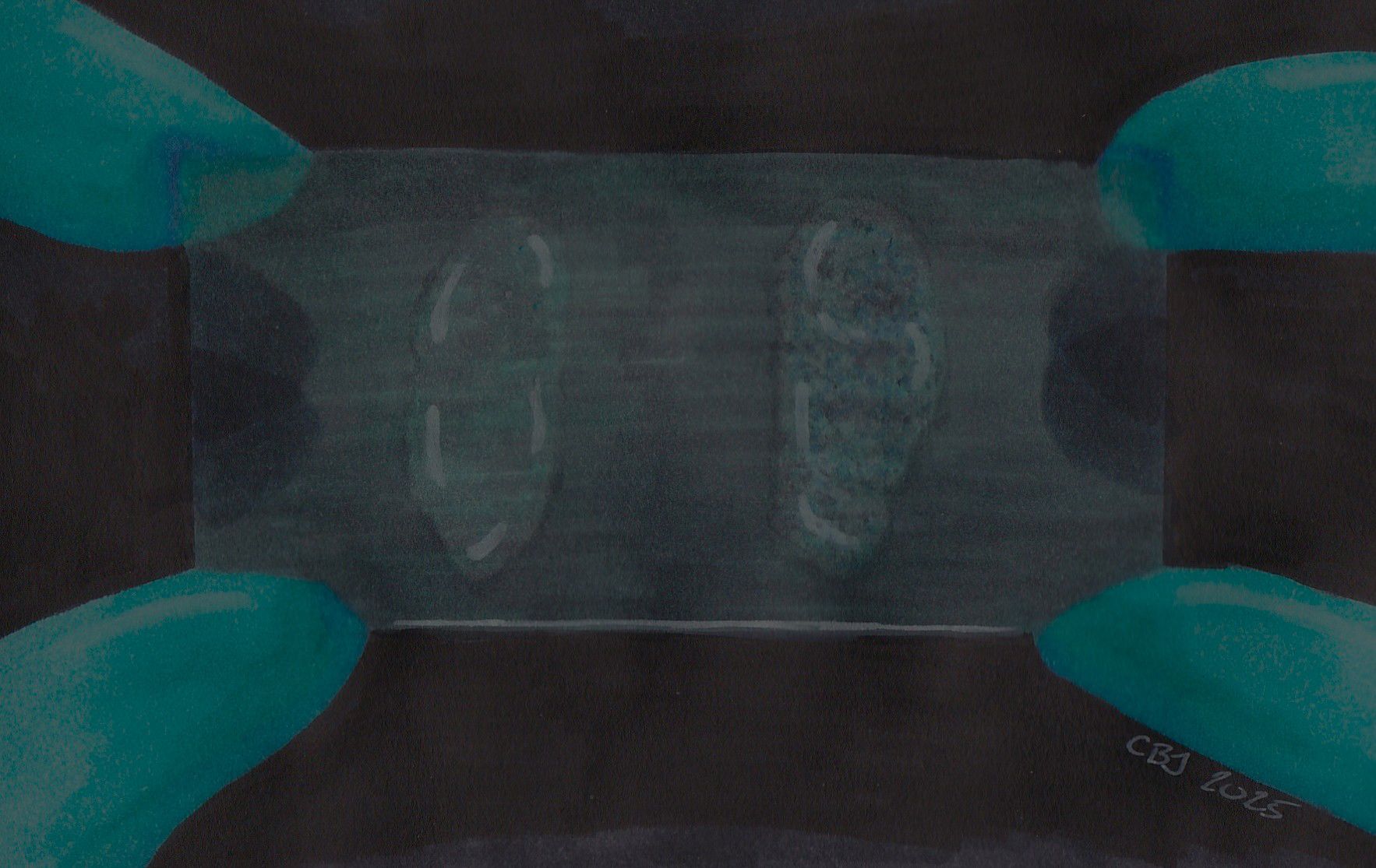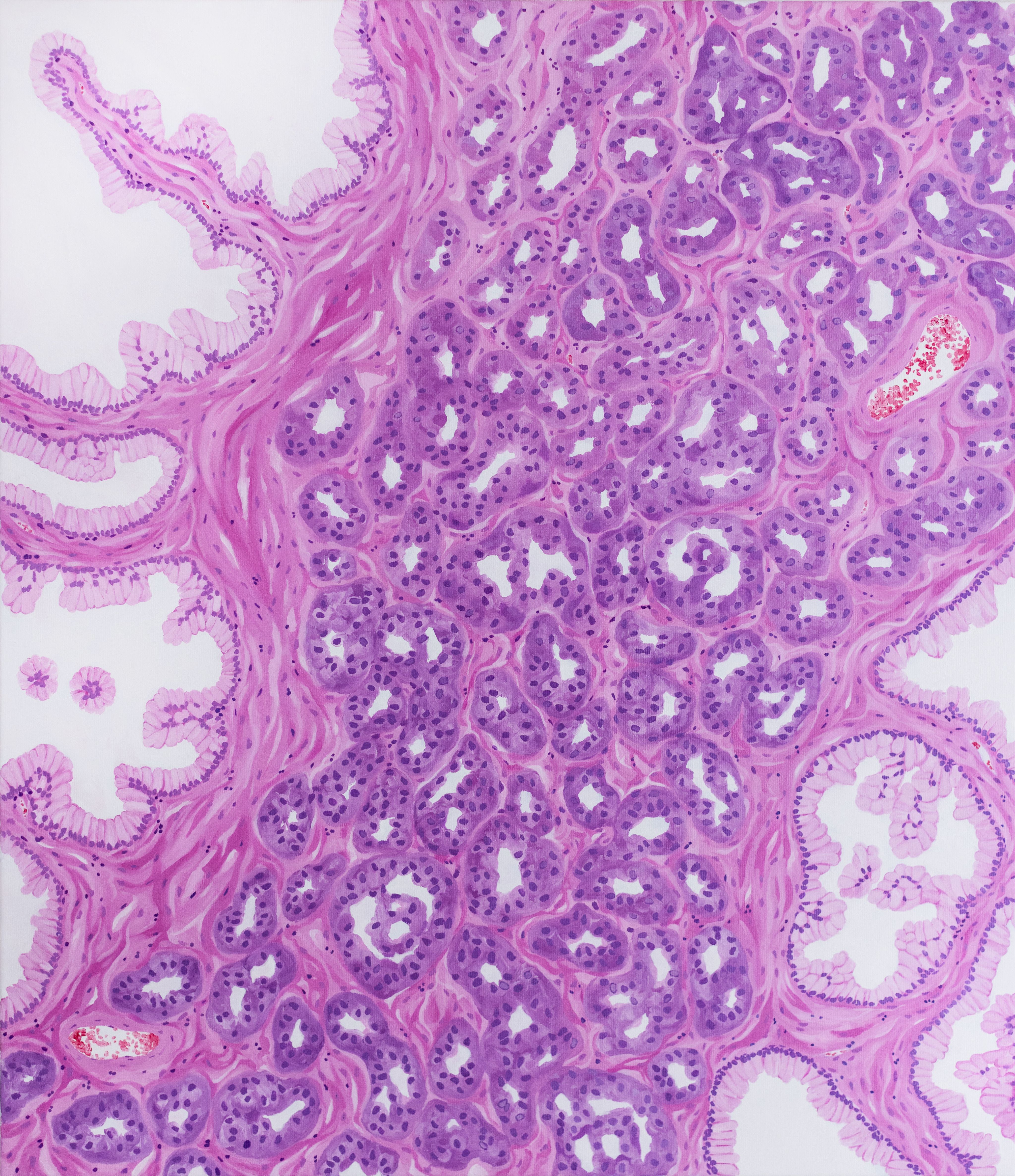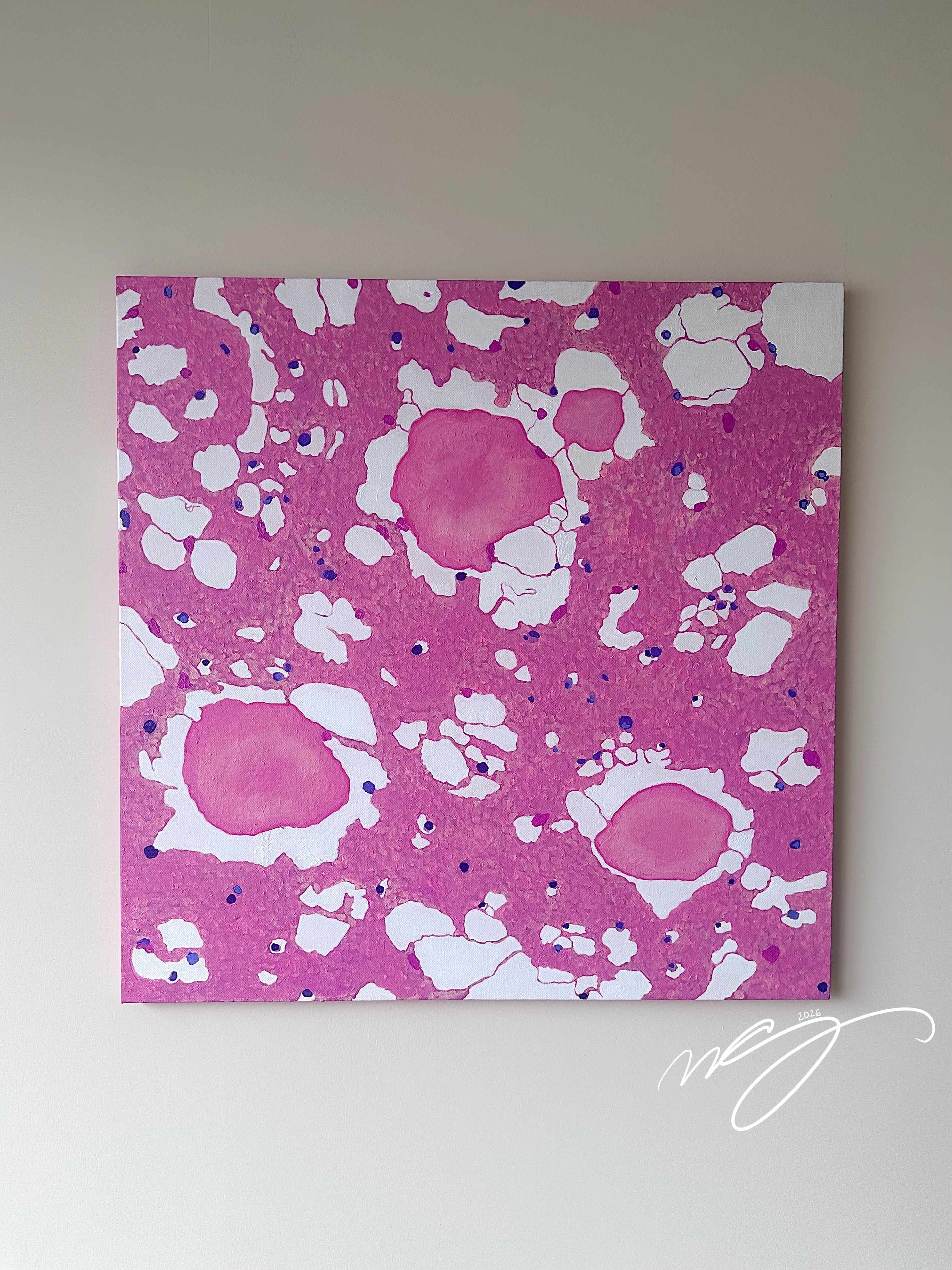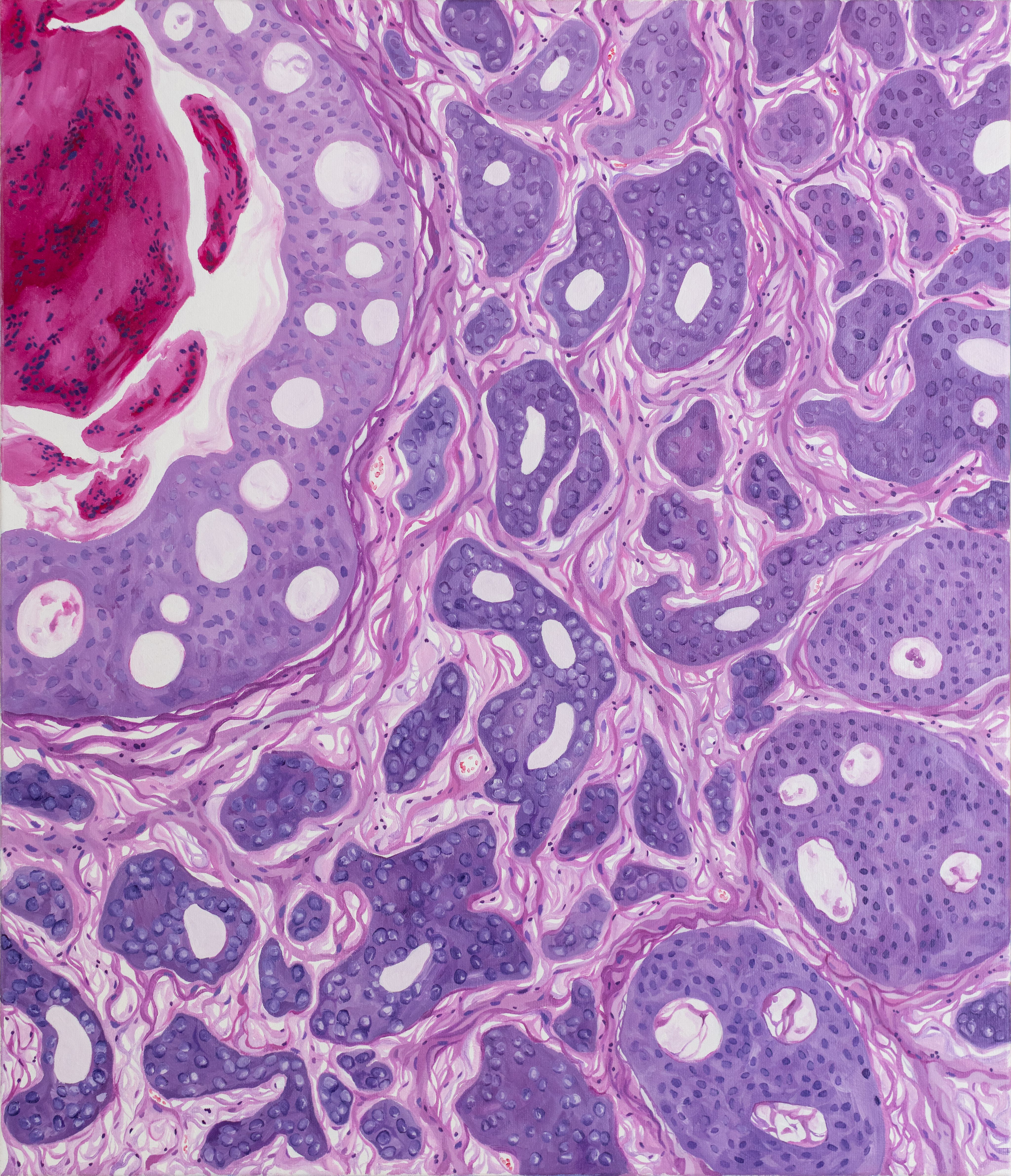 Collagen Currents & Epidermal Waves by Meredith K Herman, Pathology Resident at the University of Michigan, USA. This striking painting with gouache captures the nuanced architecture of skin as seen through a trichrome stain. Vivid pinks and purples depict the tightly packed layers of the epidermis, illustrating the protective outer barrier. Below, the intricate blue hues represent the collagen-rich matrix of the dermis, emphasizing the supportive framework and connective tissue vital for skin strength and resilience. The flowing boundaries between these layers reflect the harmonious relationship between the epidermis and dermis in maintaining the integrity of our body’s largest organ.