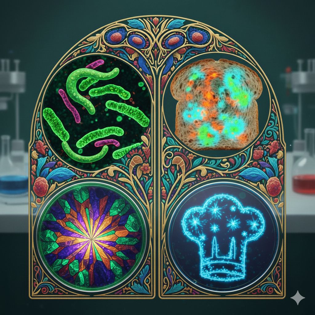 Safer at Home When Handled with Care, Safe Outside Only with Reliable Source by Fatma Erdem, Associate Professor, Department of Medical Microbiology, Eskişehir Osmangazi University Faculty of Medicine, Eskişehi, Turkey. This agar art explores food safety as a practice grounded in care and trust. By contrasting the home kitchen with its invisible microbial world, it suggests that safety depends on careful handling at home and reliable sources beyond it. The piece reframes food safety not as the absence of microbes, but as the result of informed attention.