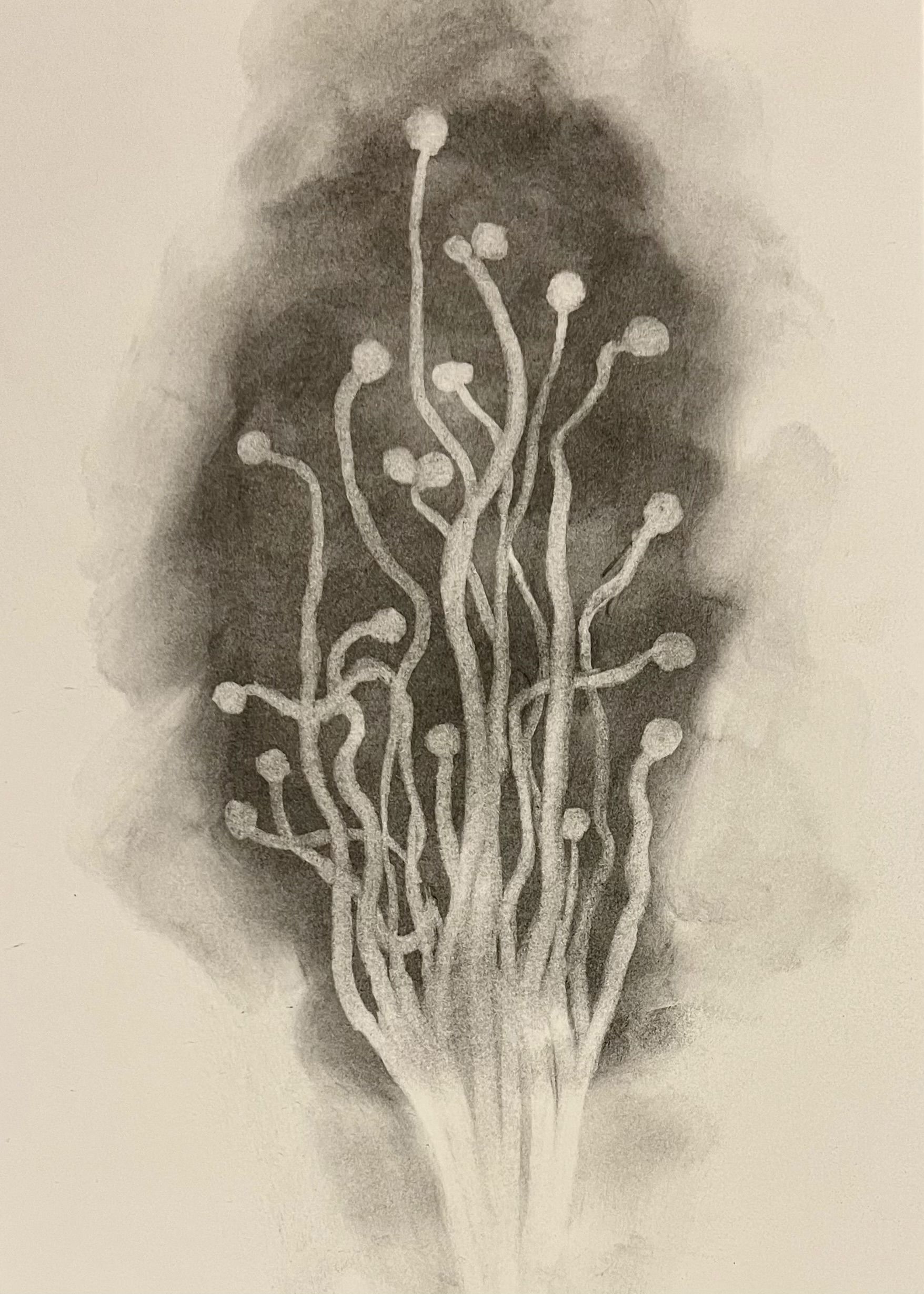 Ash Drawing: Claviceps (Ergot) by Anna Dumitriu, Artist in Residence, The Magan Centre for Applied Mycology, University of Cranfield, Brighton, UK. This drawing was created using charcoal made from incinerated ergot and a putty rubber. Ergot is a mold that infects cereal grains such as rye, wheat, and barley, forming hard, dark toxic structures called sclerotia that can contaminate food without rigorous testing. Ingesting ergot can cause ergotism, a potentially fatal poisoning marked by hallucinations, spasms, gangrene, and death, and historically linked to outbreaks such as the Salem witch trials. Rising temperatures and increased carbon dioxide levels may also boost mold growth and the production of dangerous mycotoxins in food.
