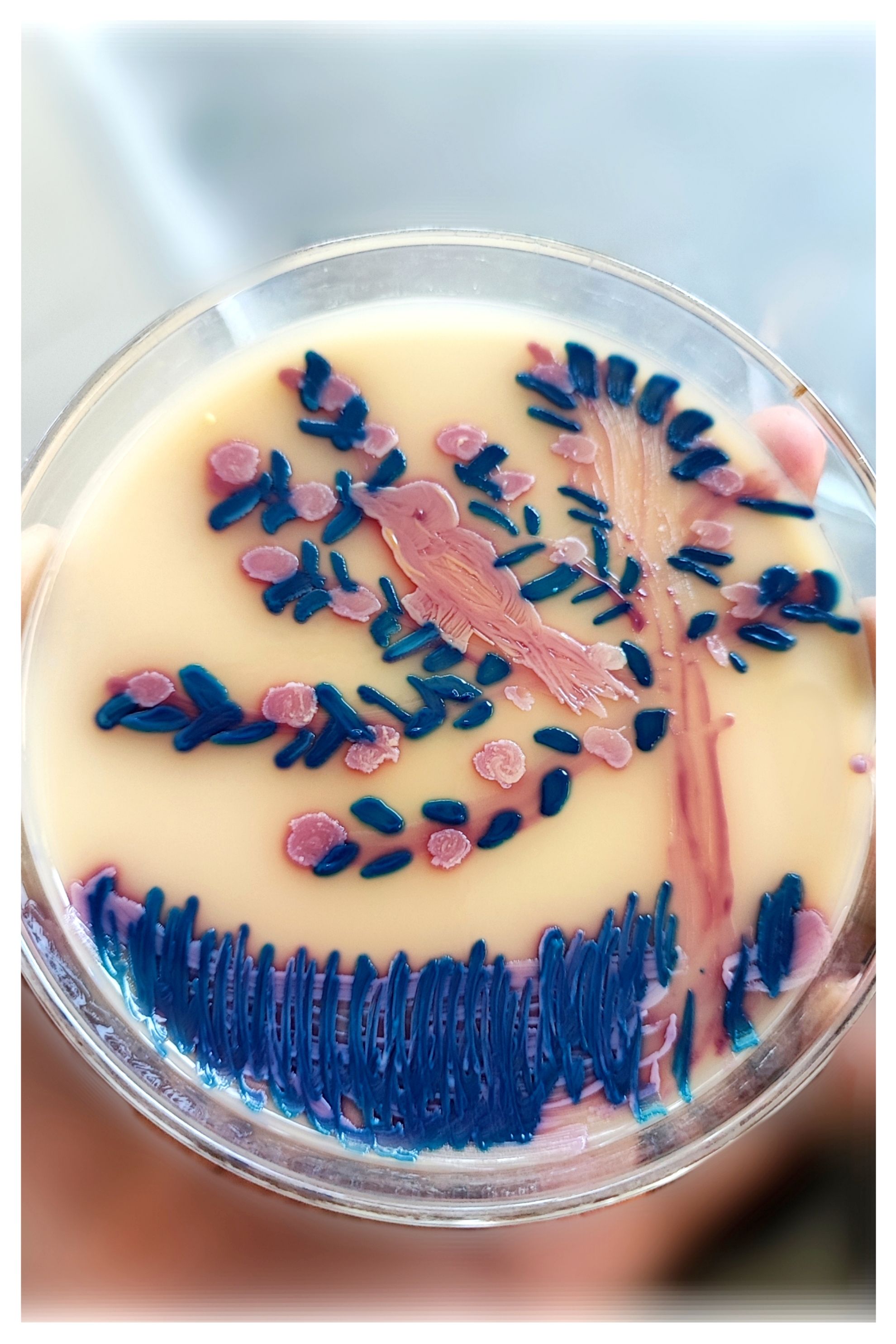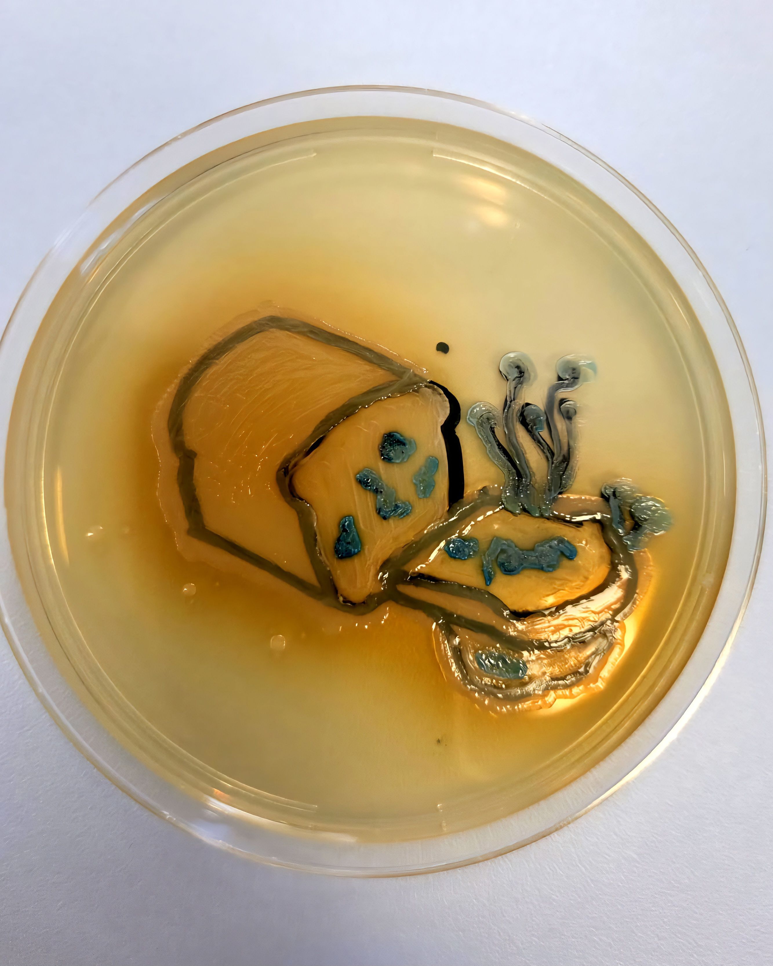 A Tribute to Serendipity: Fleming’s Bread by Alexandru Botan, Cluj-Napoca, Romania. For the “Food Safety” theme, this piece reflects the paradox of spoilage that saved millions. Depicting the accidental discovery of penicillin, it uses the biochemical reactions of UTI agar as a natural palette: Proteus mirabilis forms the toasted brown crust, Enterococcus faecium the turquoise “mold,” and Candida albicans the soft white dough. It captures the moment a biological hazard became a medical breakthrough.
