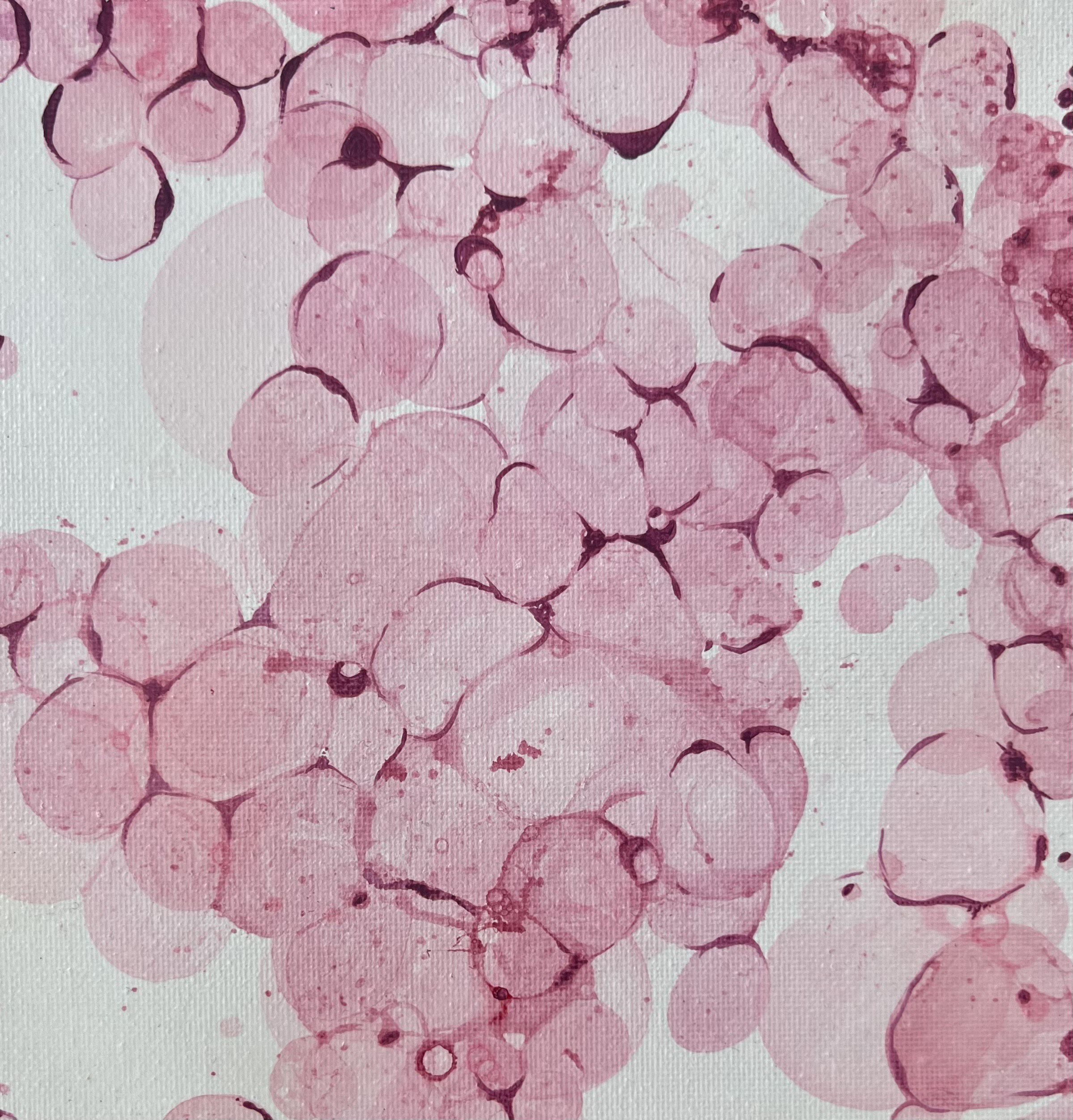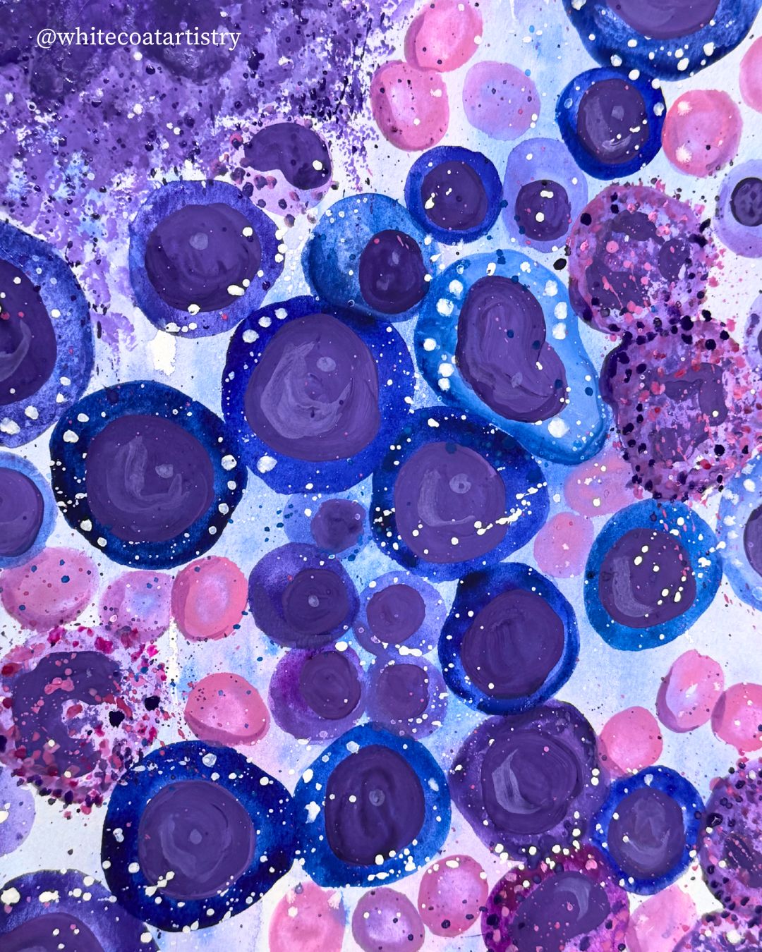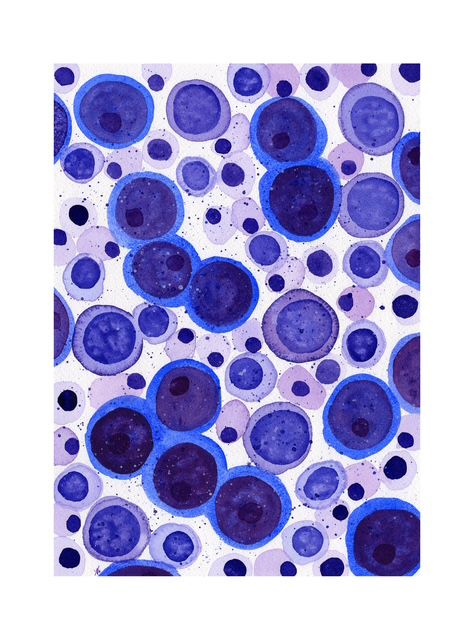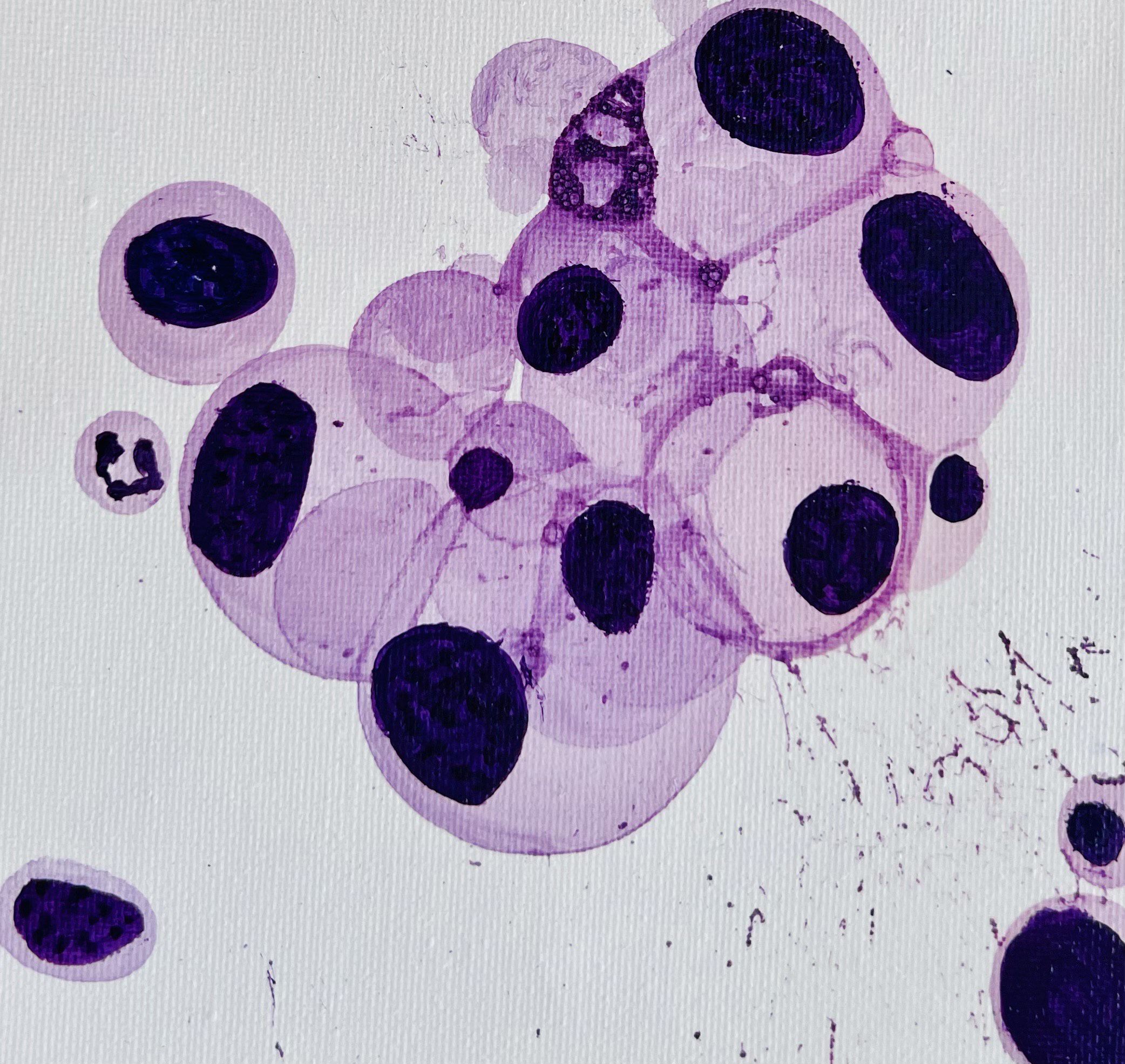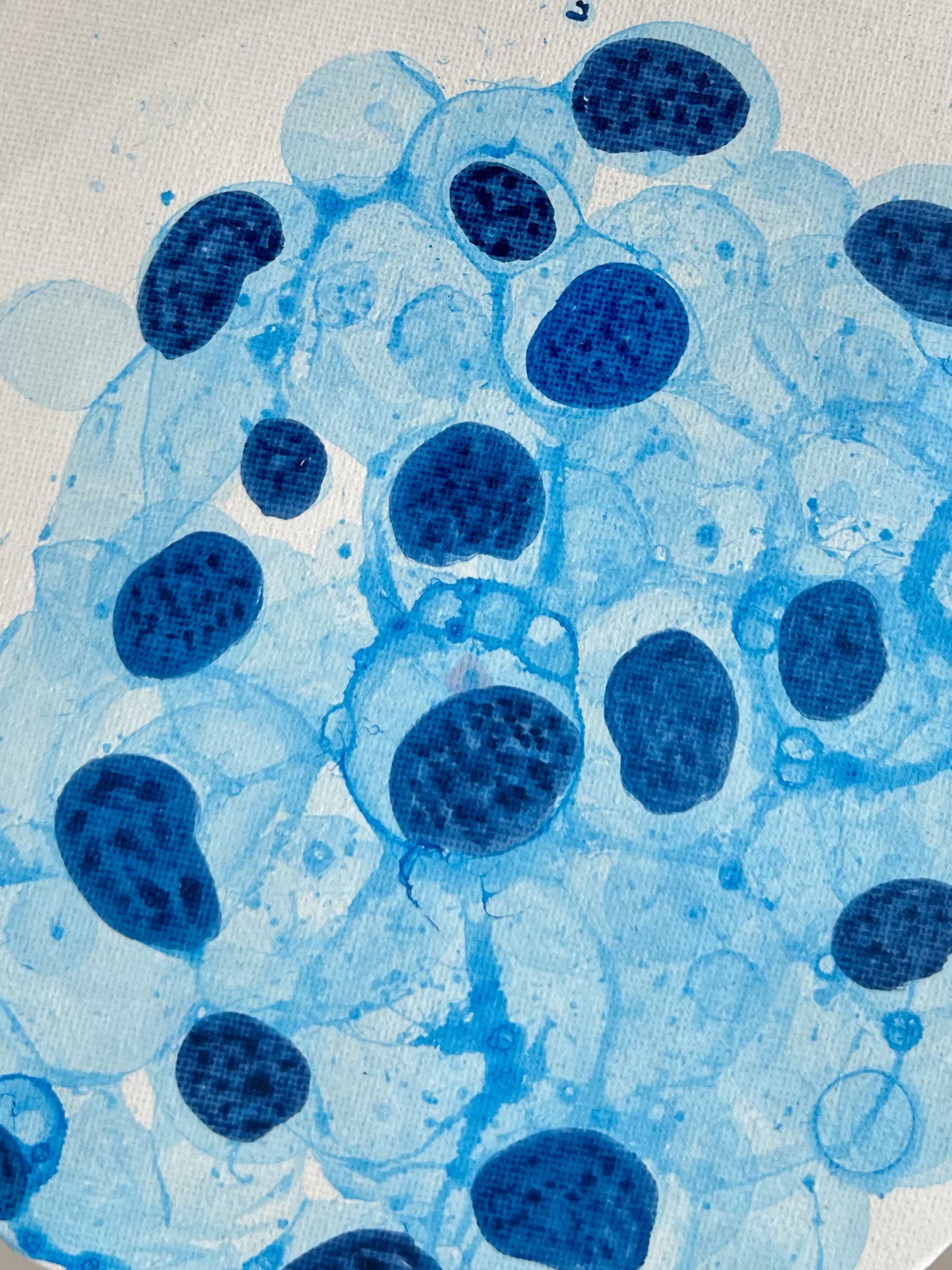 The Birth of Blood by Meredith K Herman, Pathology Resident at the University of Michigan, USA. This vibrant gouache artwork depicts the dynamic process of hematopoiesis, where new blood cells are born from hematopoietic stem cells. The purple and pink spheres represent developing blood cell precursors, clustered and layered in a lively dance reminiscent of bone marrow under a microscope. Splashes of blue and white evoke the ever-changing microenvironment, highlighting the diversity and energy within this essential site of cellular renewal.