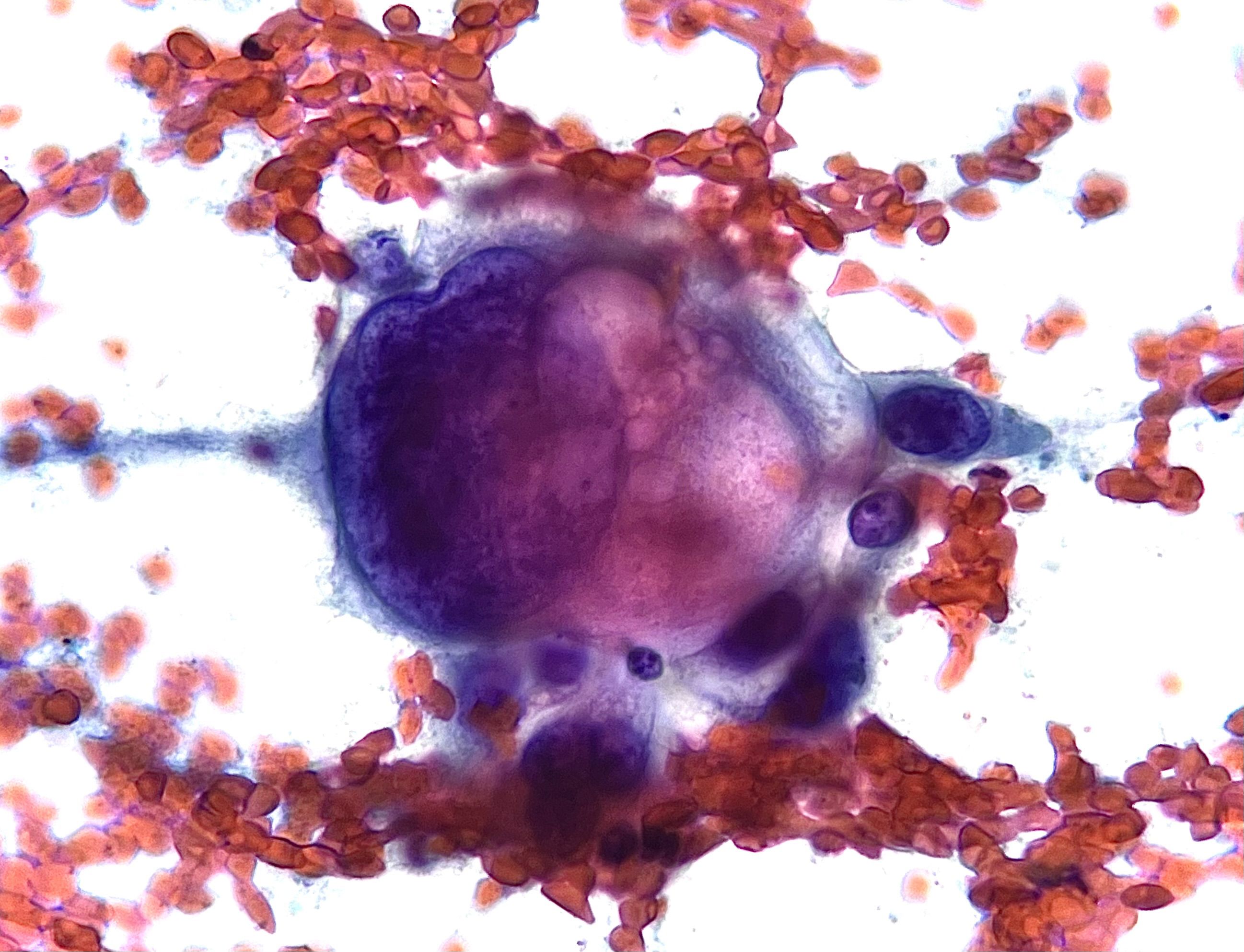 Malignant Colossus by Tania Labiano, Cytopathologist, Pamplona, Spain. This photomicrograph depicts an exceptionally large malignant cell from an EBUS-guided FNA cytology of lung adenocarcinoma.