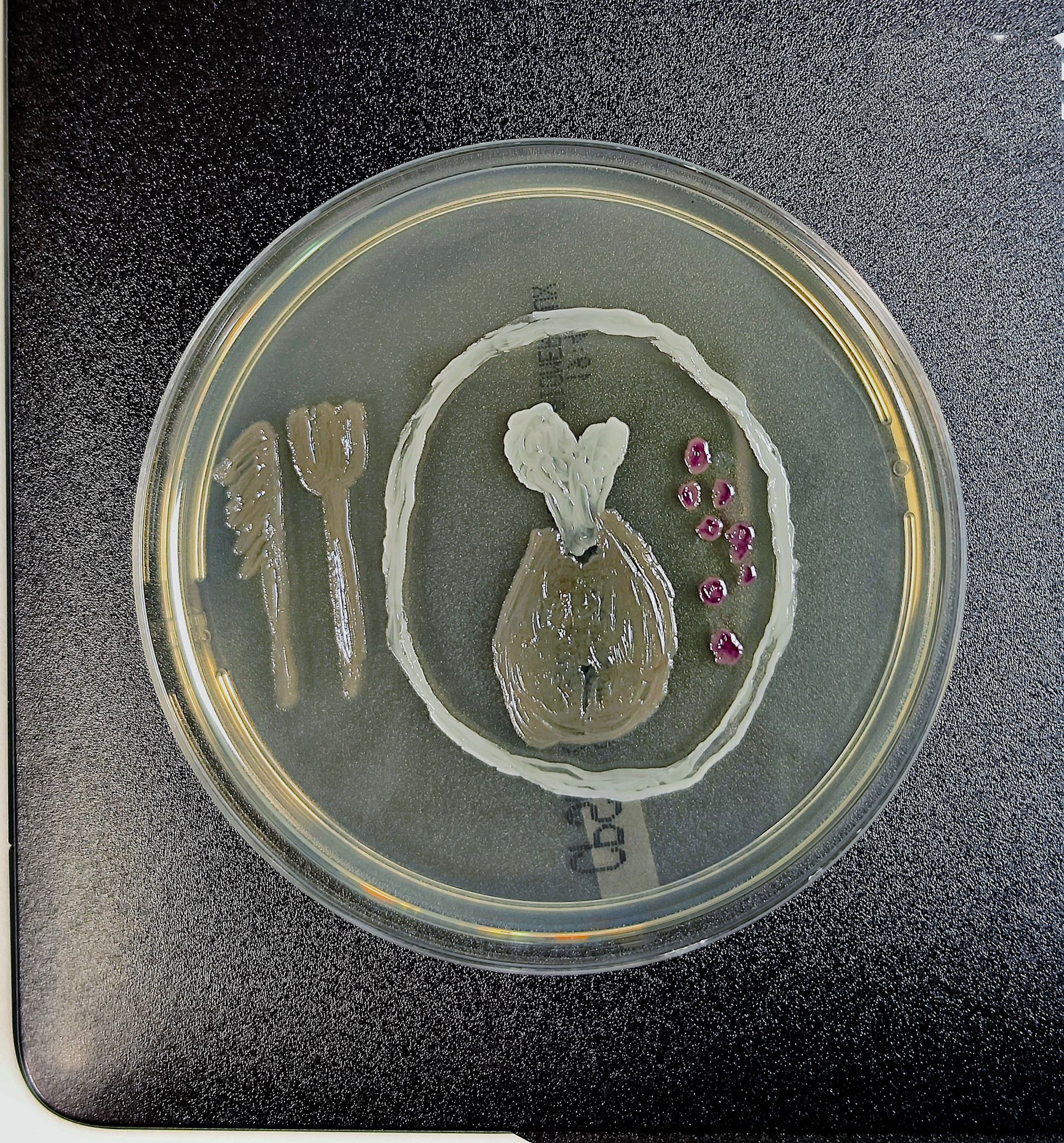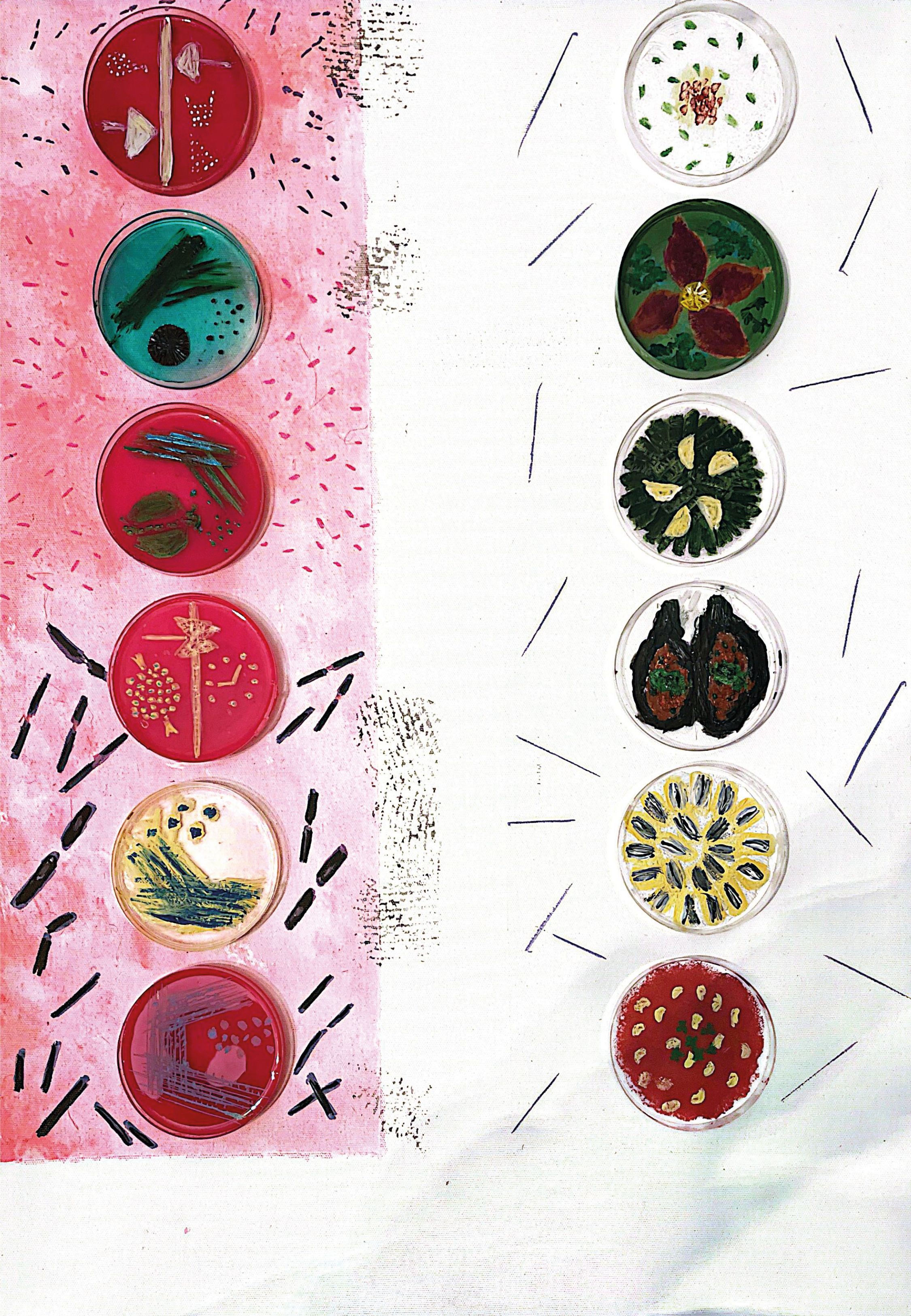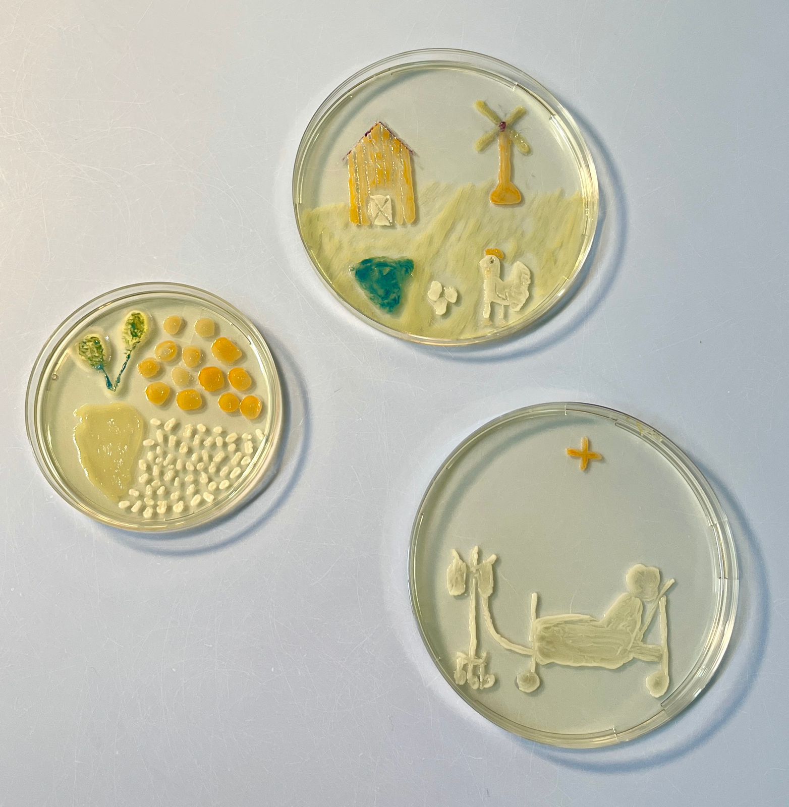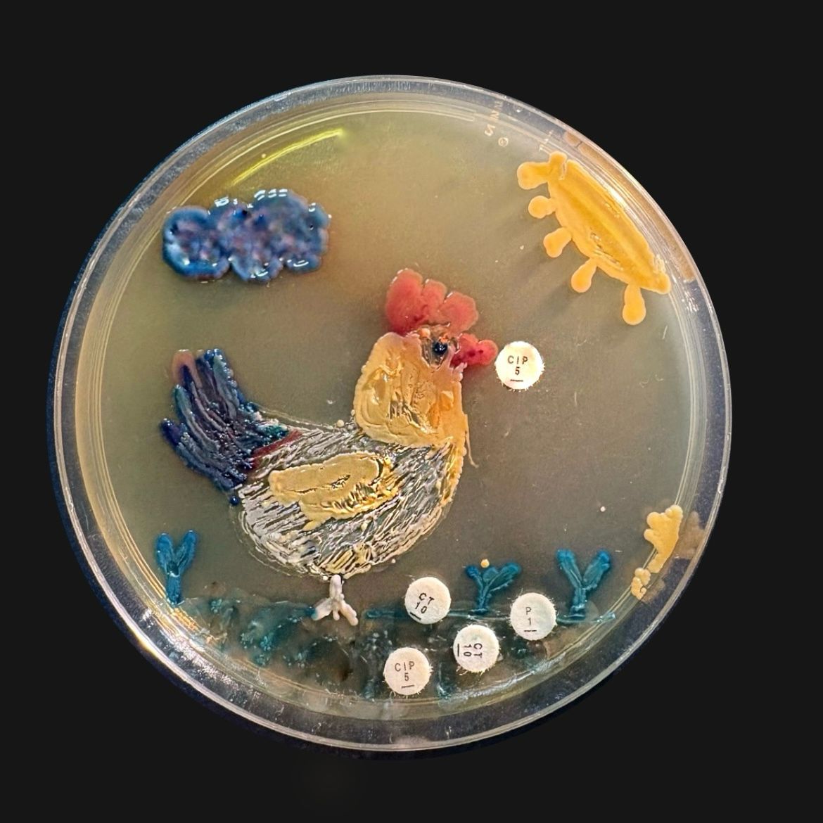 A Cultured Dinner by Carmen Palacios Clar, Clinical microbiologist, Hospital Universitario Nuestra Señora de Candelaria, Santa Cruz Tenerife, Spain. This piece contrasts the familiarity of a plated chicken with its unseen microbiological reality. By transforming the meal into a living agar culture, it merges laboratory imagery with everyday dining and invites viewers to look more closely at what is often taken for granted.