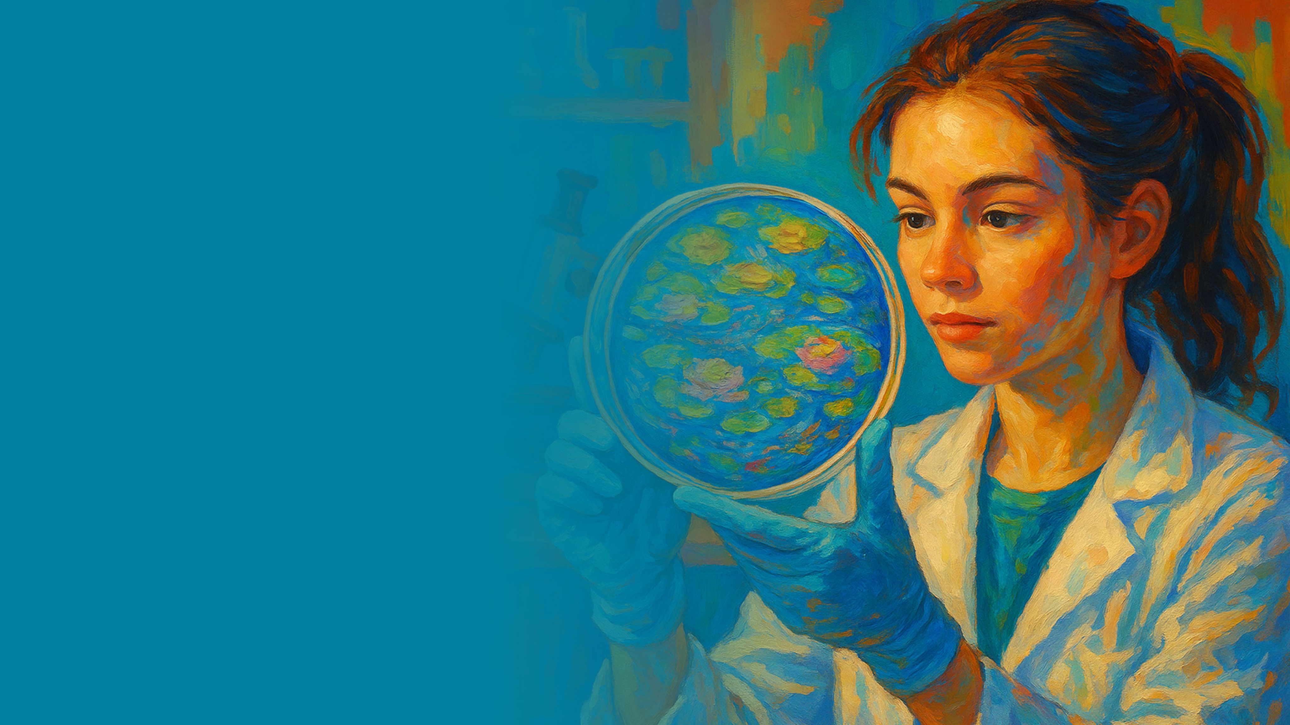 Guardians of Food Safety by Eren Öztürk, TAE National Representative for Infectious Diseases (Türkiye) and Steering Committee Member, Department of Infectious Diseases and Clinical Microbiology, Ankara University Faculty of Medicine, Ankara, Turkey. A laboratory scientist carefully examines a culture plate, symbolising the critical role of science in ensuring food safety. The vivid colours reflect the hidden microbial world within food, highlighting vigilance, precision, and responsibility in protecting public health from foodborne risks.