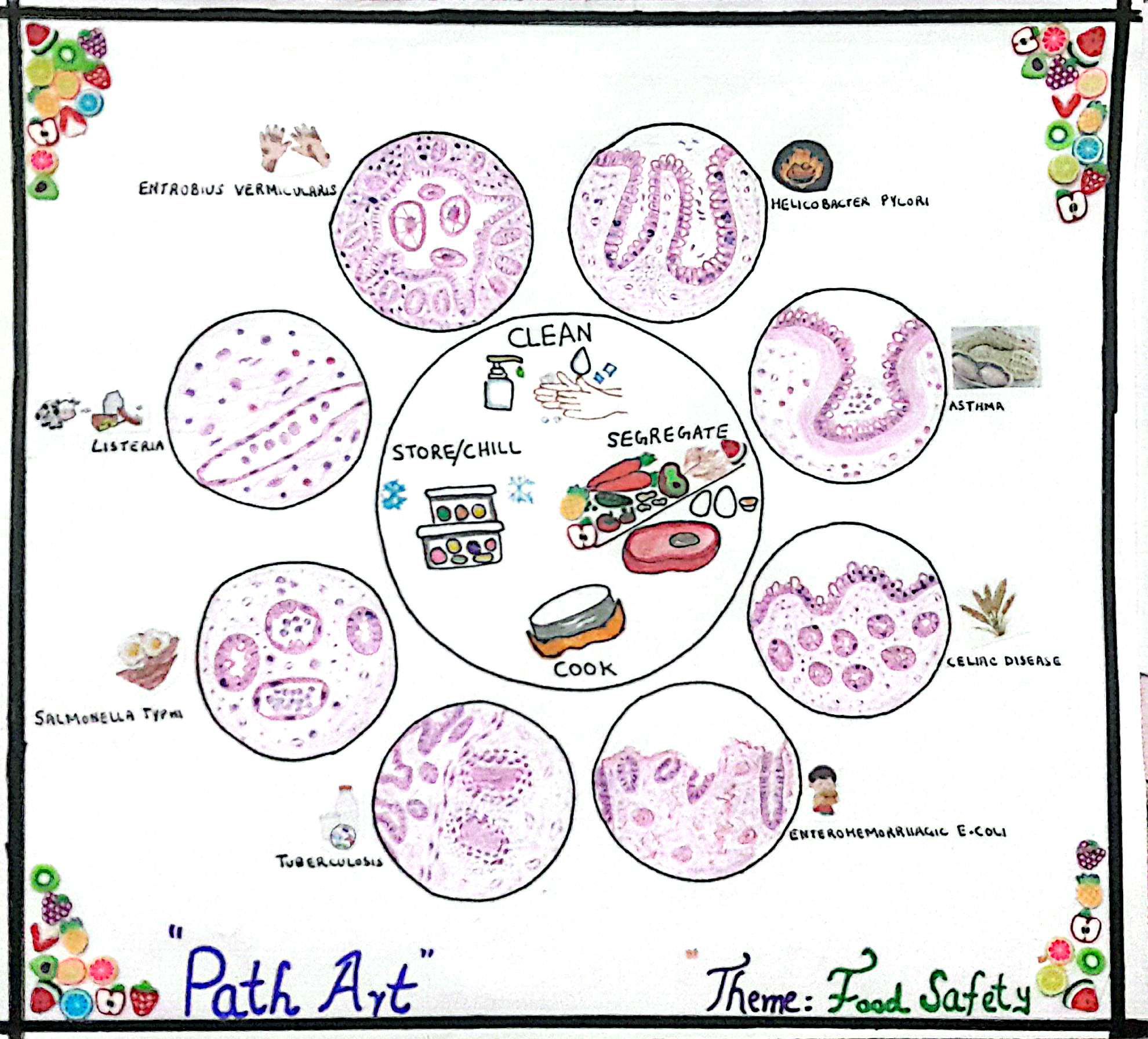 Food Safety Breach from a Histopathologist’s Microscope by Uzma Aslam, Consultant Histopathologist, Social Security hospital Multan Chungi, Lahore, Pakistan. My drawings focus on infectious and foodborne diseases that result from breaches in food safety. As a histopathologist, I encounter these cases in practice, some of them quite frequently. Through my artwork, I aim to show how these conditions appear under the microscope and how they damage different organs, alongside pictorial representations of selected etiologic sources.