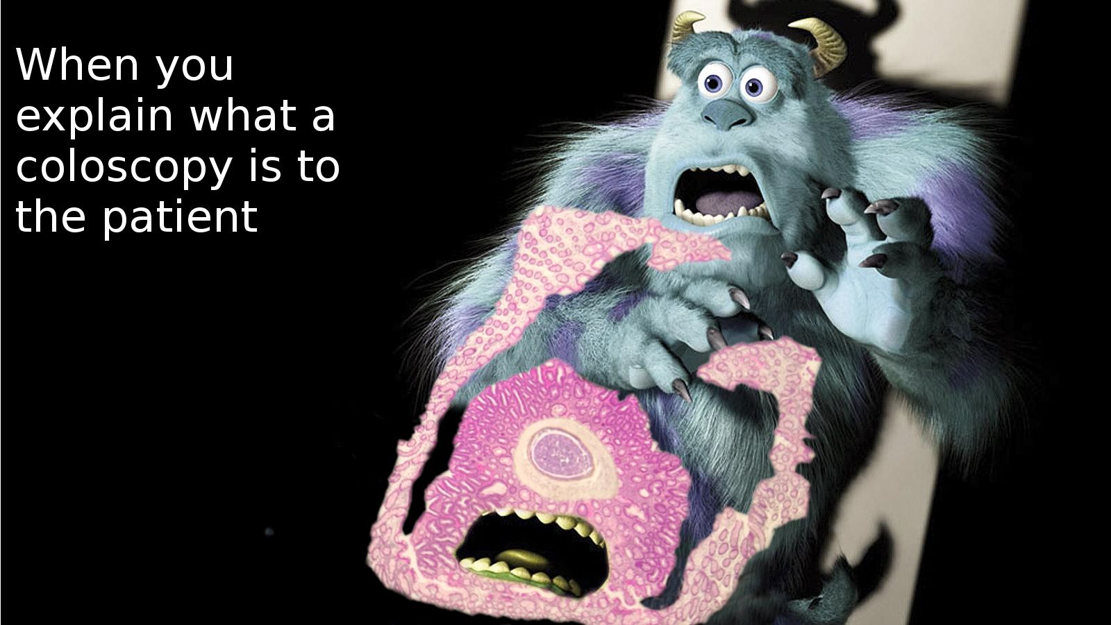 Colonoscopy Can Sometimes Be Scary by Ioana Dumitru, Freelance Pathologist, France. When Mike Wazowski, a one-eyed cyclops, incarnates a tubular colonic adenoma with low-grade dysplasia, his pal James P. Sullivan joins him for the ride during colonoscopy.