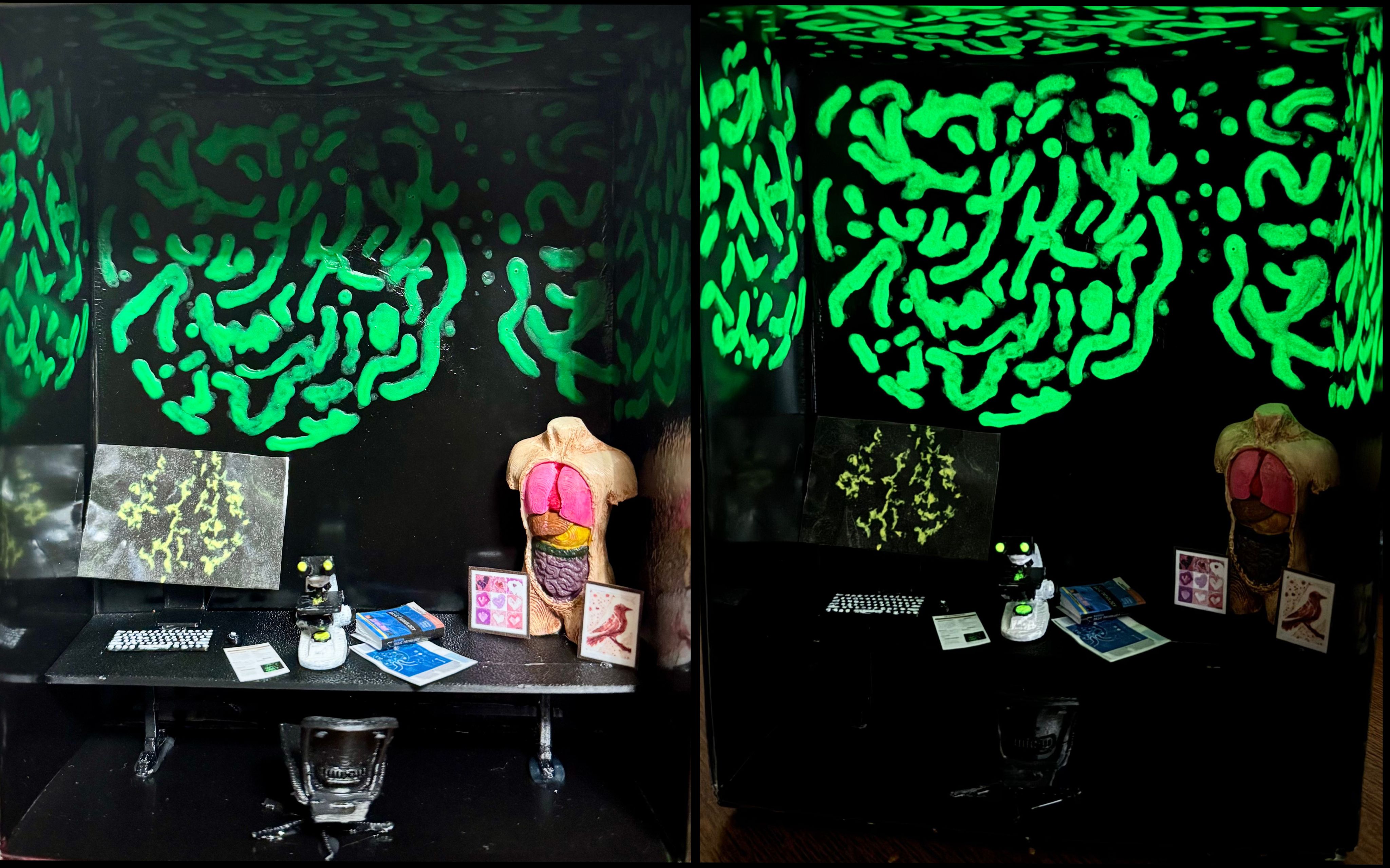 Through the Enchanted Microscope by Ancy Jenil-Franco, Internal Medicine Resident at McLaren Bay Region, Michigan, USA. This is a glow-in-the-dark, 3D-printed book nook that I created using 3D prints, glow paint, and cardboard. Building it felt like stepping into a pathologist’s secret lair. Under the microscope, the world transforms into a hidden universe of pathophysiology – cells seem to whisper, disease patterns come alive, and everything takes on an almost poetic rhythm. At the microscope, the ordinary world fades away and science becomes art: a place where curiosity glows and comes alive under the lens.