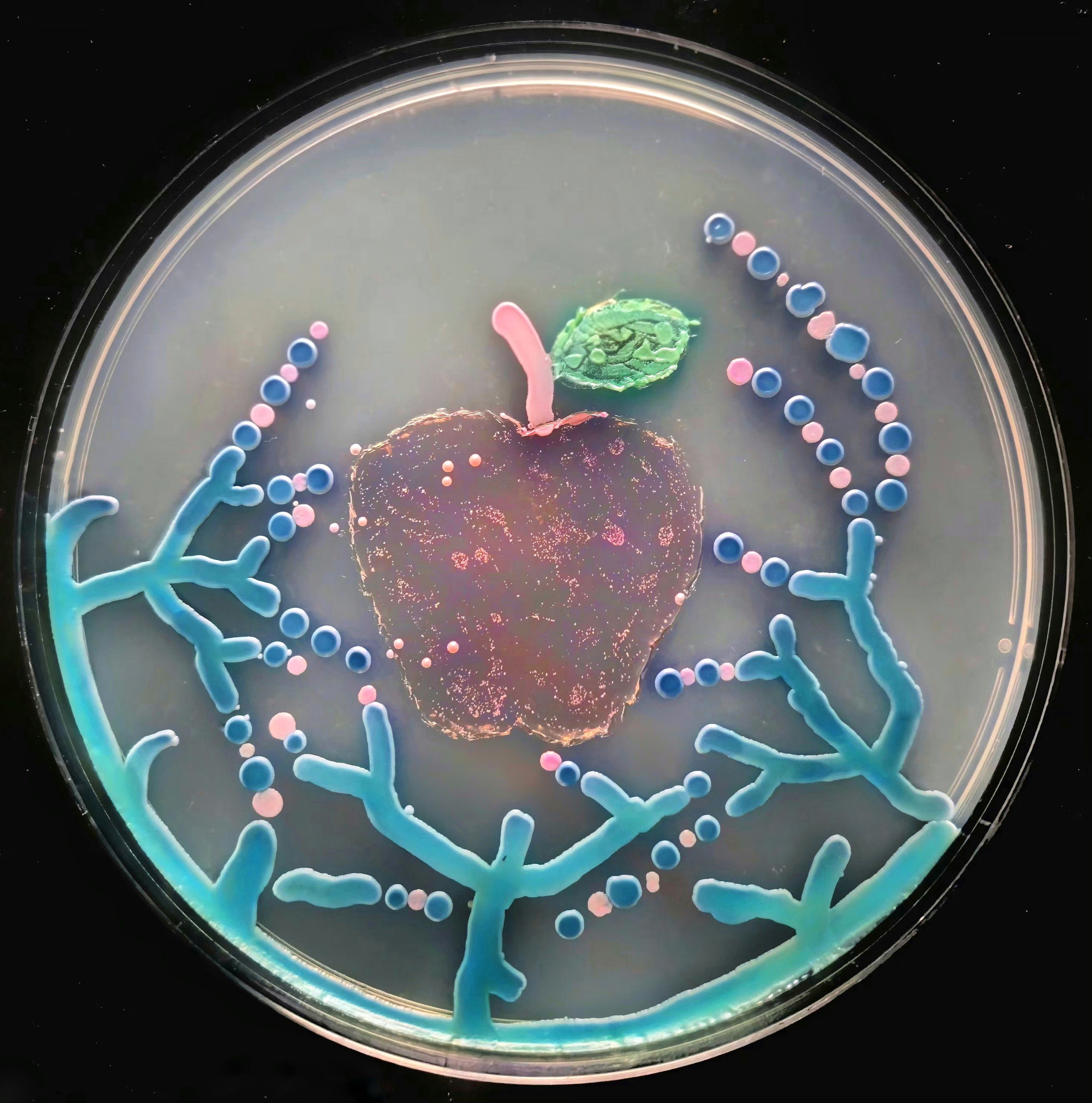 Invisible Guardians of Food Safety by Mihaela Ioana, Timișoara, Romania. This agar art reimagines everyday food safety practices from a microbial perspective. Dirty hands, unsafe water, undercooked ingredients, and kitchen tools emerge from pigmented bacterial cultures, reflecting critical control points where human behavior intersects with microbial life. The work underscores the fine balance between contamination and prevention, emphasizing that food safety is a shared responsibility grounded in microbiological awareness.