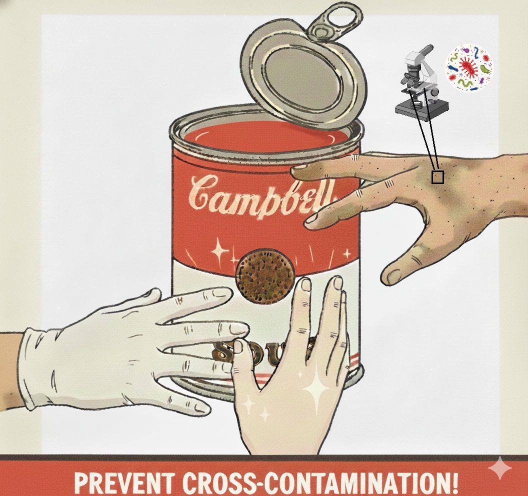 Campbell’s Soup or Bacterial Broth? by Valentina Antonelli, Rome, Italy. The image depicts a pop art–style soup can inspired by Andy Warhol, surrounded by three hands – clean, gloved, and dirty. The dirty hand links to a microscopic view of bacteria, while a stain on the can suggests contamination. Highlighting the risk of cross-contamination, a central food safety concern, the piece draws on laboratory experience to show how everyday moments – such as preparing or sharing meals – can carry unseen microbial risks.