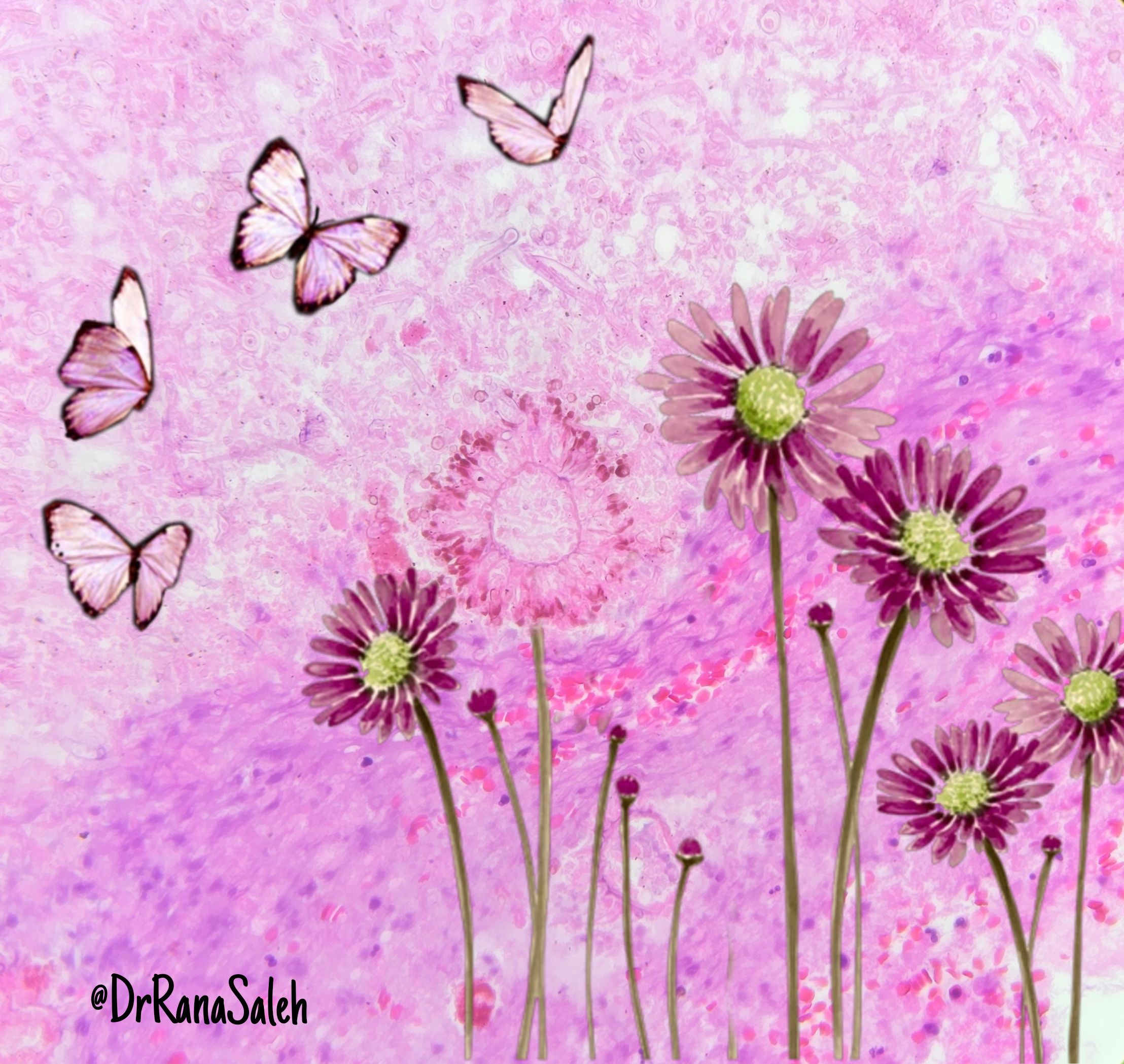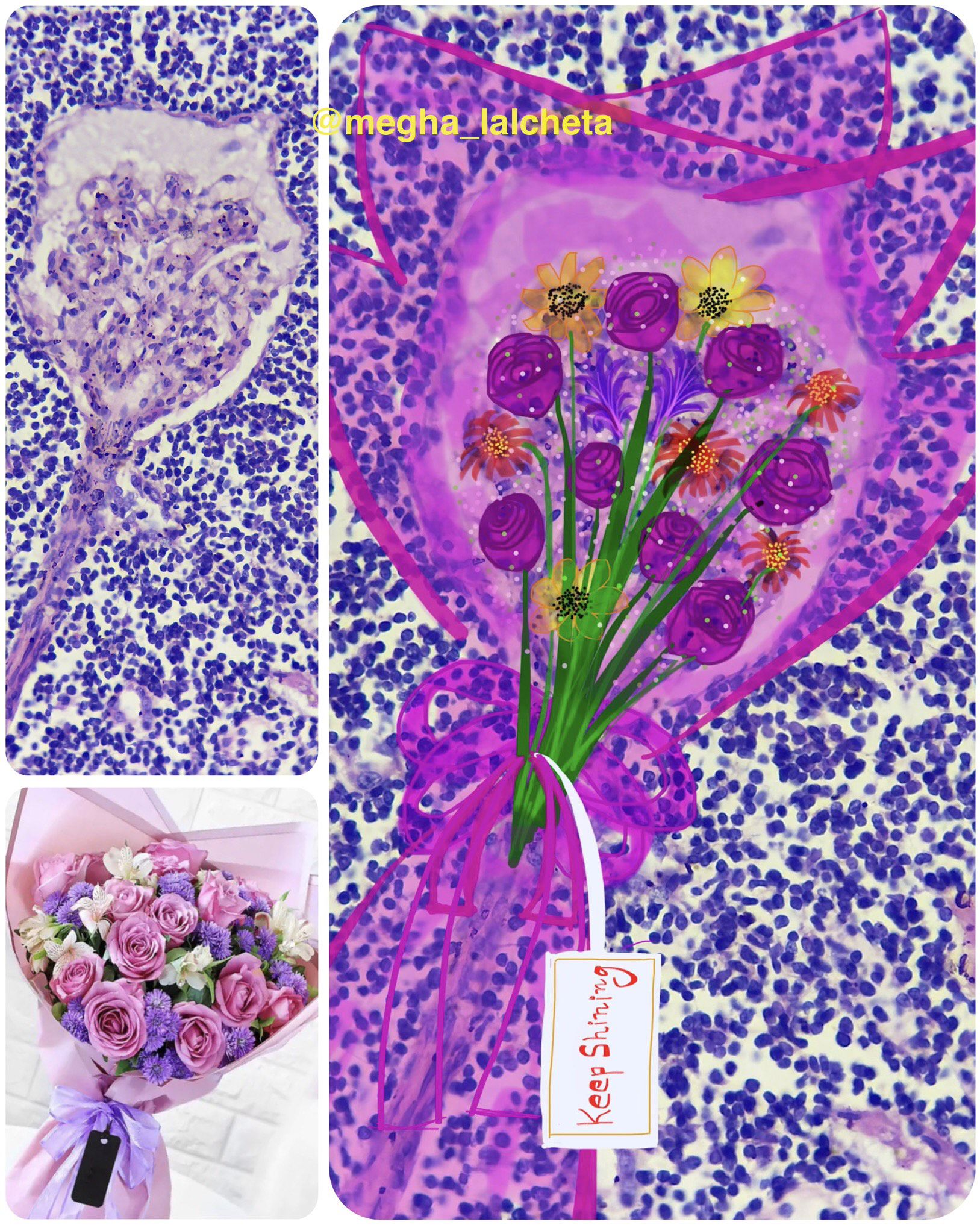 H&E Bouquet by Megha Lalcheta, MD Pathology Assistant Professor at MP Shah medical college, Jamnagar, India. The left upper image is from lymphoma of the kidney (normal glomerulus surrounded by sheets of malignant lymphoid cells). The left lower image is of a bouquet of beautiful purple and pink roses, alstroemeria, and daisies. And the right image is my #pathart. My ultimate imagination of making this glomerulus into a rose bouquet.