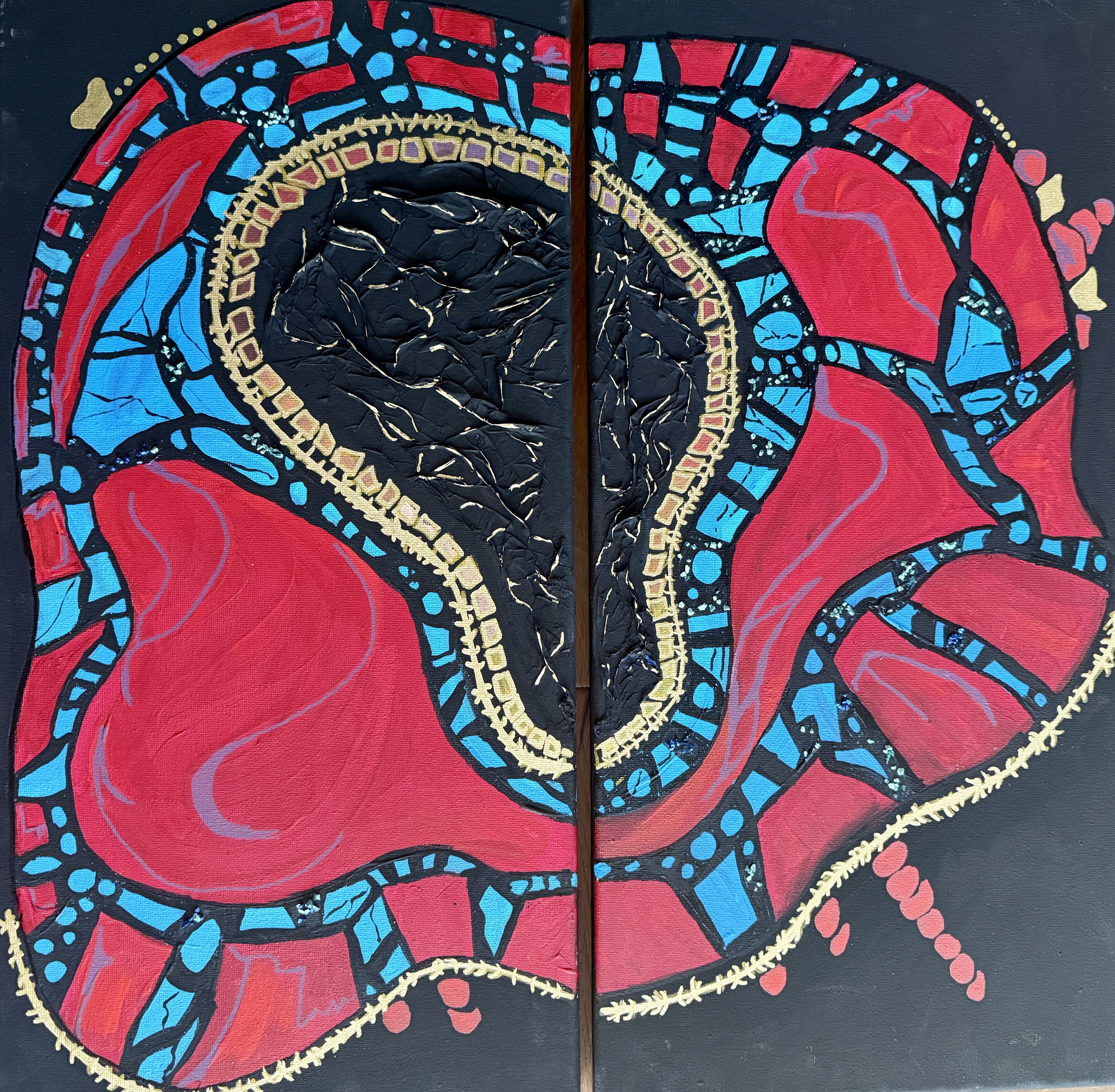 Core by Celia Marginean, Baylor College of Medicine, Houston, Texas, USA. My diptych painting is made with acrylic and mixed media and presents a stylized interpretation of a cell. Overall, it explores cellular structures and patterns through obstruction, without aiming for a literal representation.