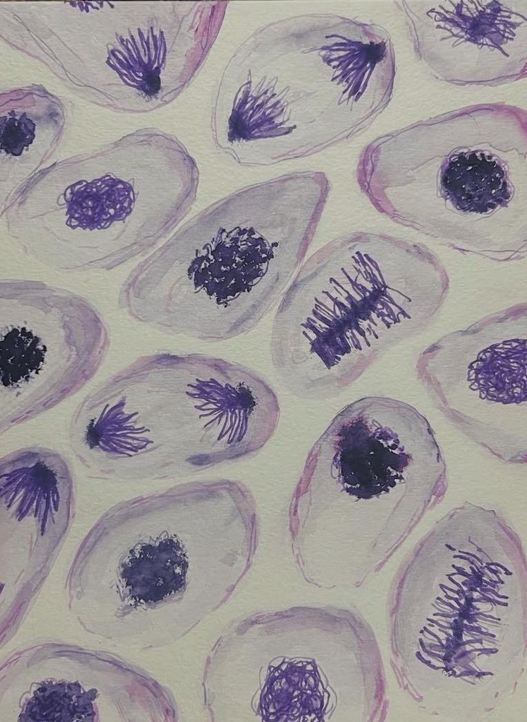 Divide & Conquer by Mattie Grace Neighbors, first year medical student at the University of Arkansas for Medical Sciences, US. 8x10 watercolor depicting mitosis.