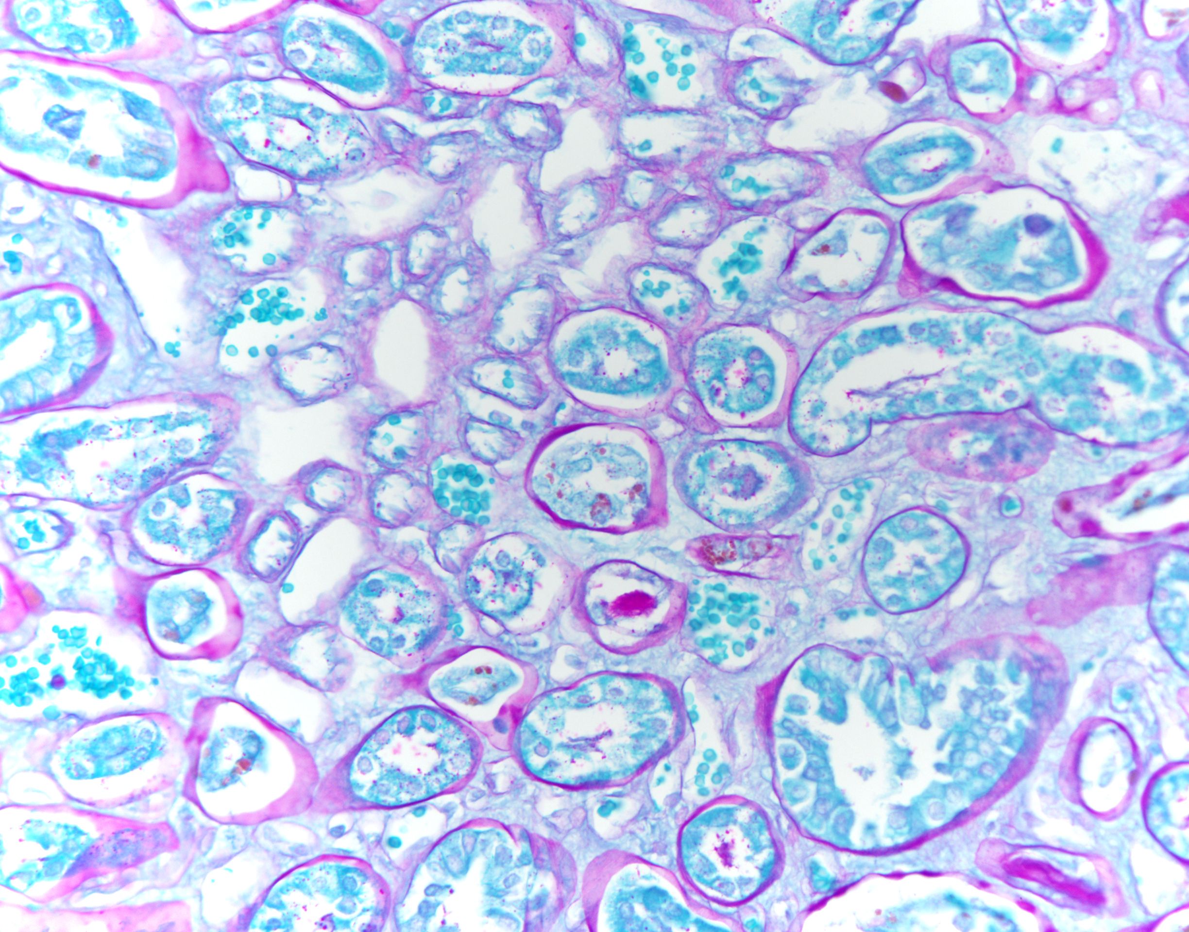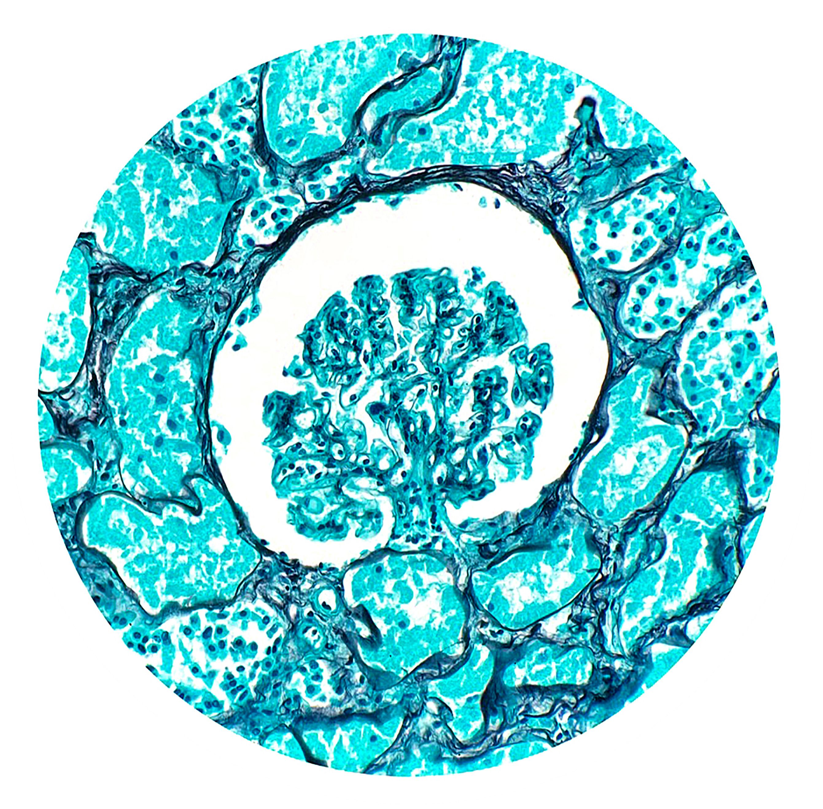 Green Glomerulus by Ziad El-Zaatari, Houston Methodist Hospital, Houston, Texas USA. During one case, we had problems with the usual Jones silver stain for renal tissue, so we used a GMS stain instead. The result is this striking green-stained glomerulus, since the GMS counterstain is green rather than the typical pink. The glomerulus – the tree- or mushroom-like structure – is centered in the image. The surrounding white area is the urinary space within Bowman’s capsule, and the renal cortical tubules line the periphery. This photo was taken with a smartphone through the microscope eyepiece, showing the full circular field of view.