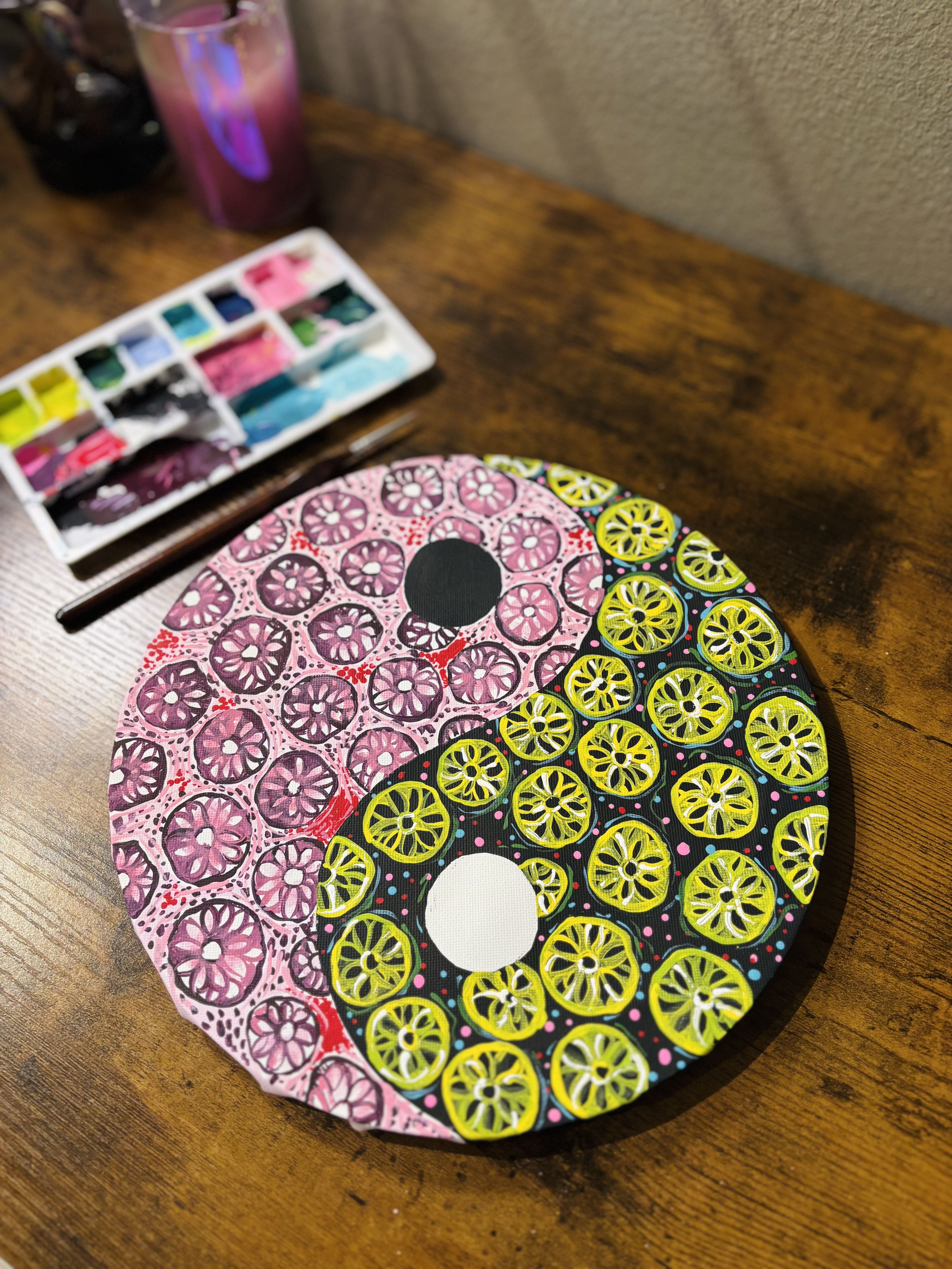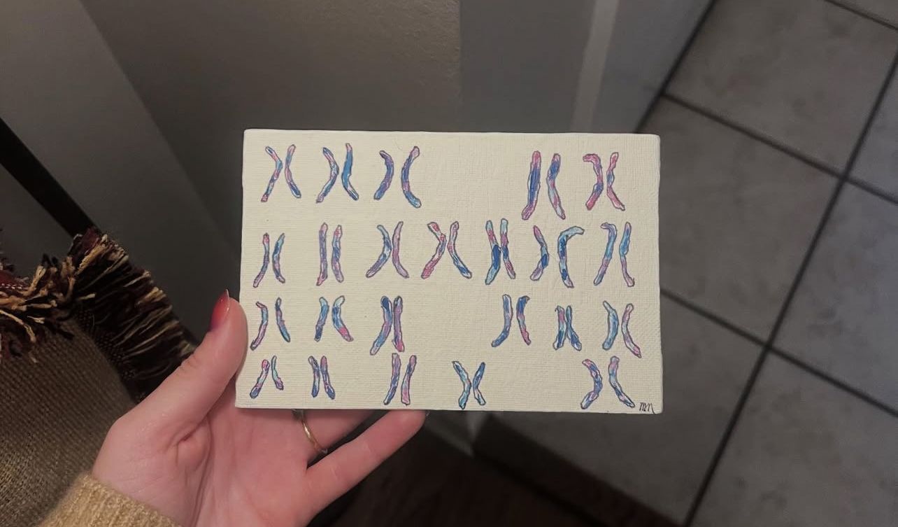 Kary on by Mattie Grace Neighbors, first year medical student at the University of Arkansas for Medical Sciences, US. 4x6 acrylic depicting a human karyotype.