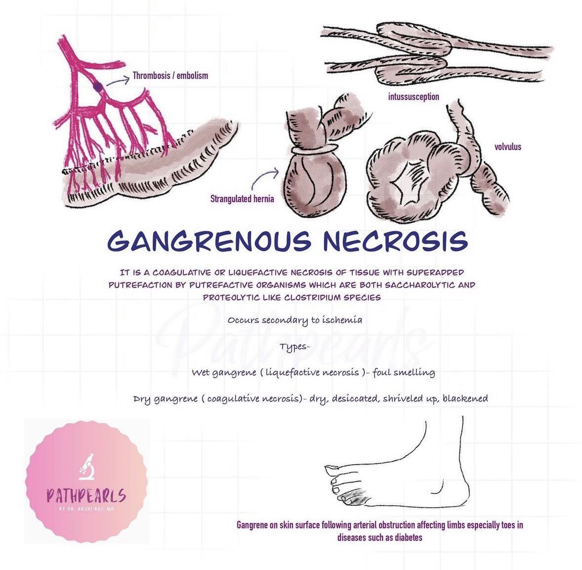 Gangrenous Necrosis by Akshi Raj, MD pathology, Assistant Professor at DR. DY Patil Medical College, Hospital and Research Center, Pune Maharashtra, India. A collection of illustrations showing various forms of necrosis.