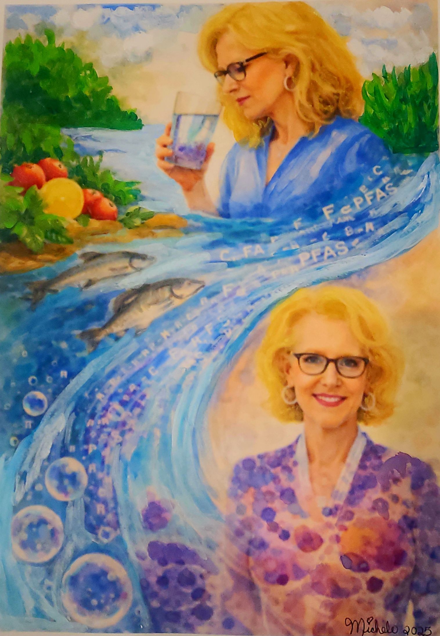 From Source to Cell: What Food Safety Leaves Behind by Michele Mitchell, Patient Advocate, ASCP Patient Champion, Michigan, USA. This artwork reflects the hidden journey of environmental contaminants through food and water systems and into the human body. The composition moves from natural abundance – fish, fruit, and flowing water – to microscopic cellular patterns shaped by persistent chemical exposure. What appears safe and nourishing at the surface slowly transforms into digitized pathology within her body, revealing the unseen consequences of what we consume. The patient figure anchors the work, representing lived experience as a breast cancer survivor and intersecting with scientific discoveries that forever chemicals and plastics may bring to her life. Subtle molecular and cellular motifs evoke PFAS exposure, emphasizing persistence rather than toxicity alone. Pathology serves as the bridge between environment and understanding – translating invisible risk into evidence that patients and clinicians can see, interpret, and act upon. This piece honors pathology’s essential role in food safety: safeguarding public health by uncovering what inspection cannot, tracing exposure from source to cell to cancer causing diseases giving patients clarity where uncertainty once lived.