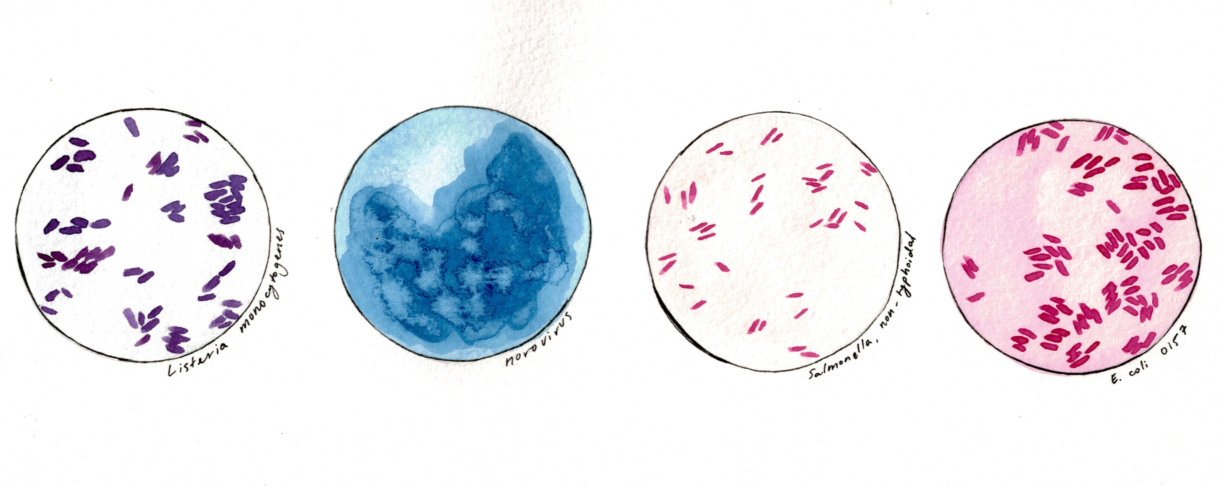 Pathogen Quartet by Lynne Altow, Medical Student, University of British Columbia, Canada. This watercolour piece highlights the four leading causes of food-borne deaths in Canada. These include Listeria monocytogenes, norovirus, non-typhoidal Salmonella spp., and Escherichia coli 0157 (Public Health Agency of Canada, 2016).