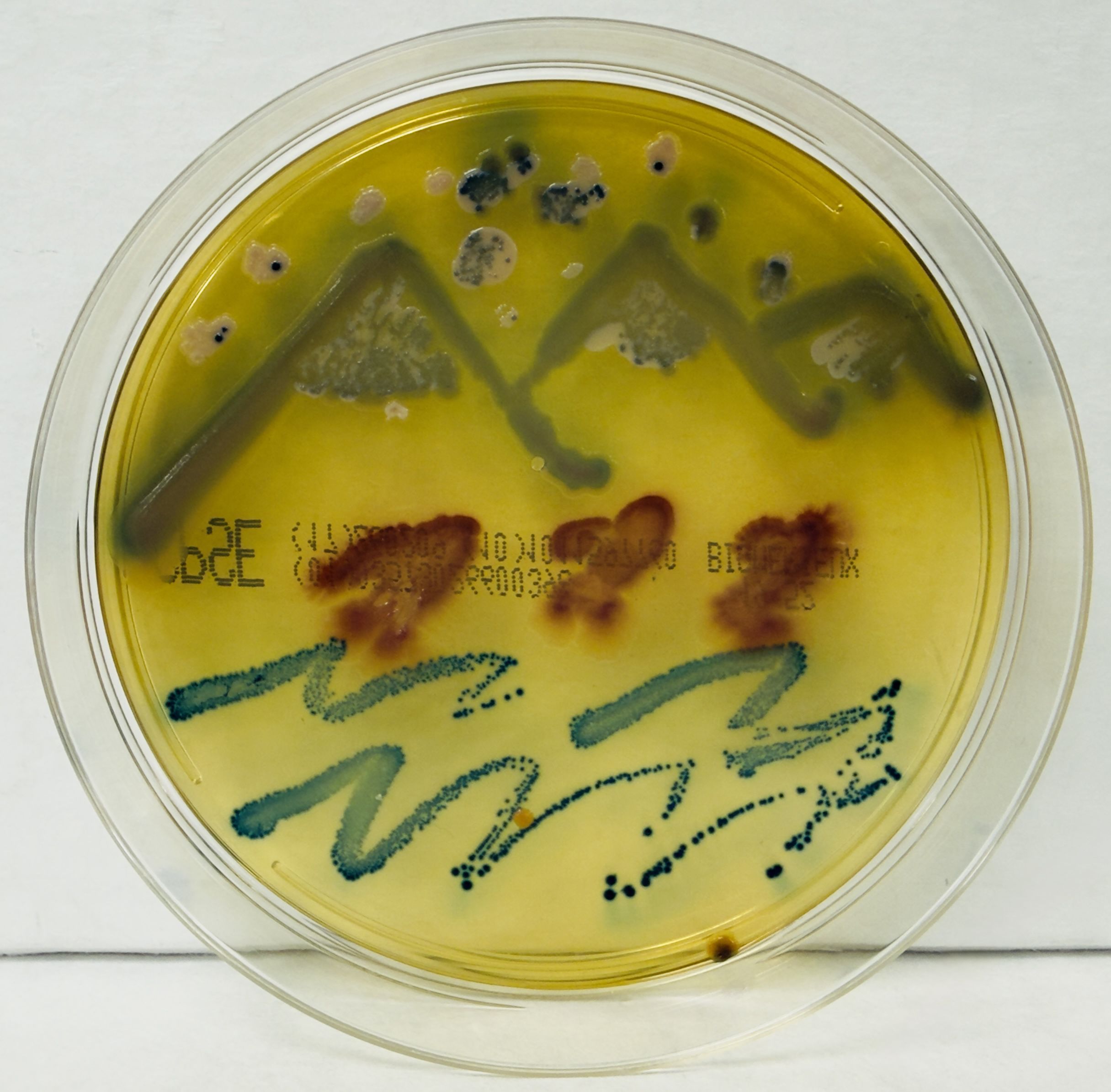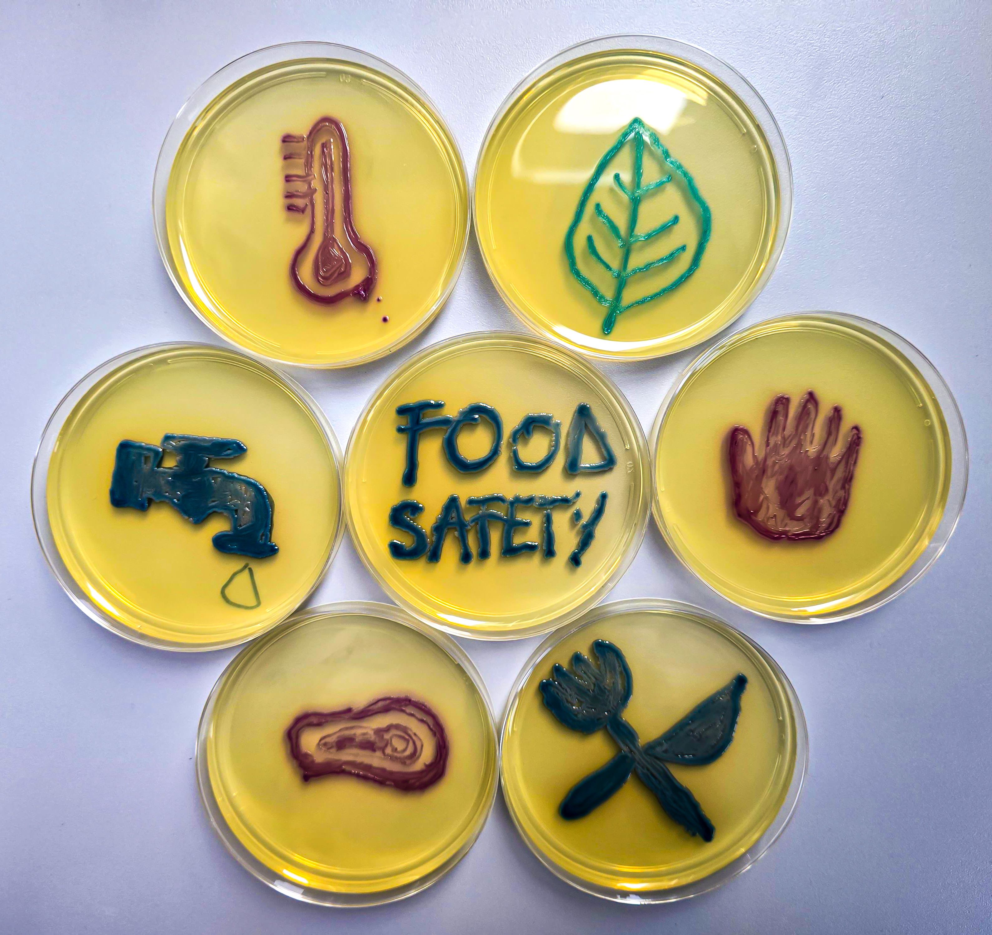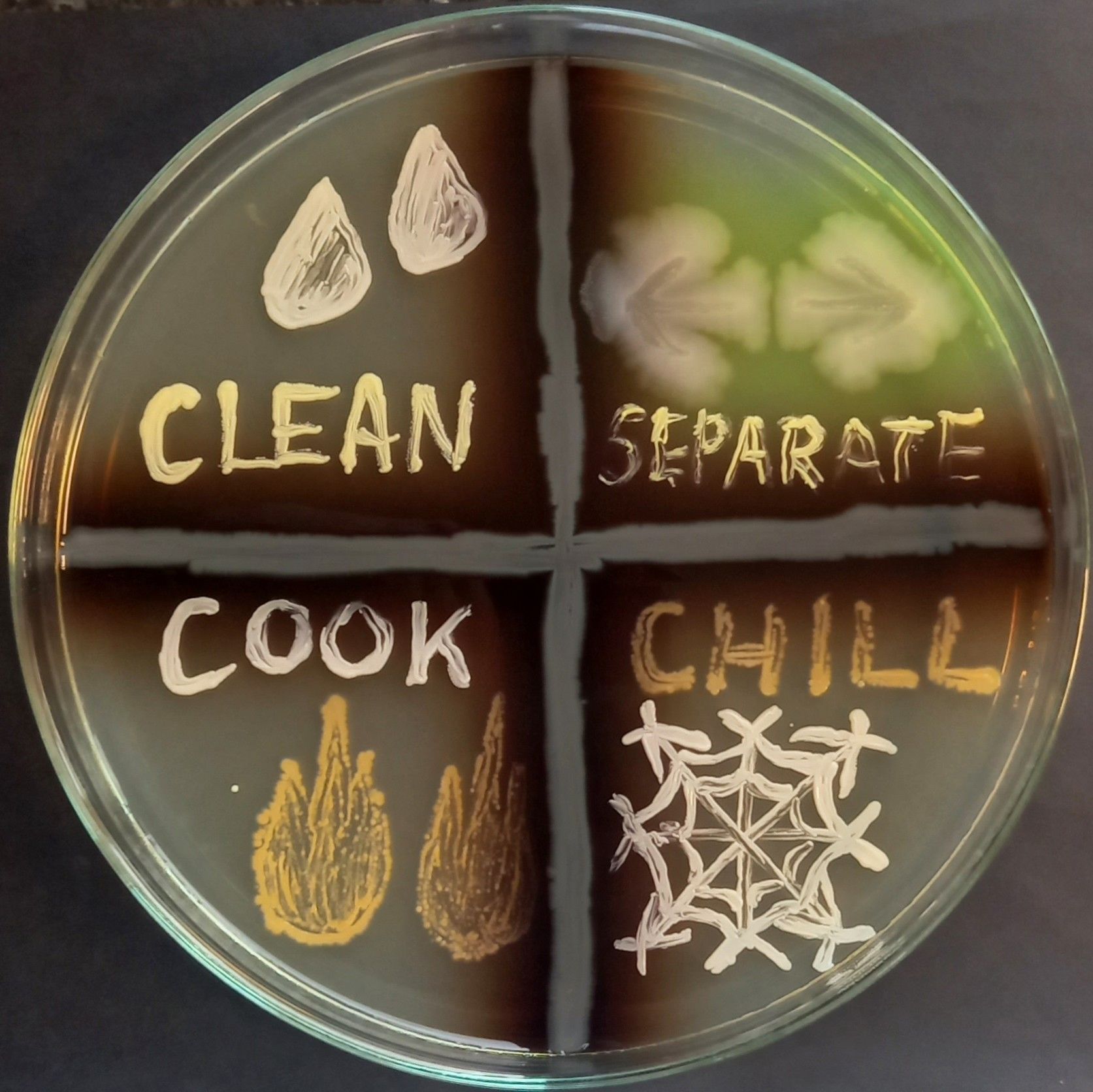 Food Safety Scheme by Karolina Dydak, Wrocław, Poland. This image is inspired by the FDA’s safe food handling guidance: Clean – wash hands and surfaces often; Separate – keep raw meats apart from other foods; Cook – to the correct temperature; and Chill – refrigerate promptly. It was created on tryptone soya agar using Micrococcus luteus (yellow), Pseudomonas aeruginosa (brown and green), Staphylococcus equorum (white), and Microbacterium hydrocarbonoxydans (orange).