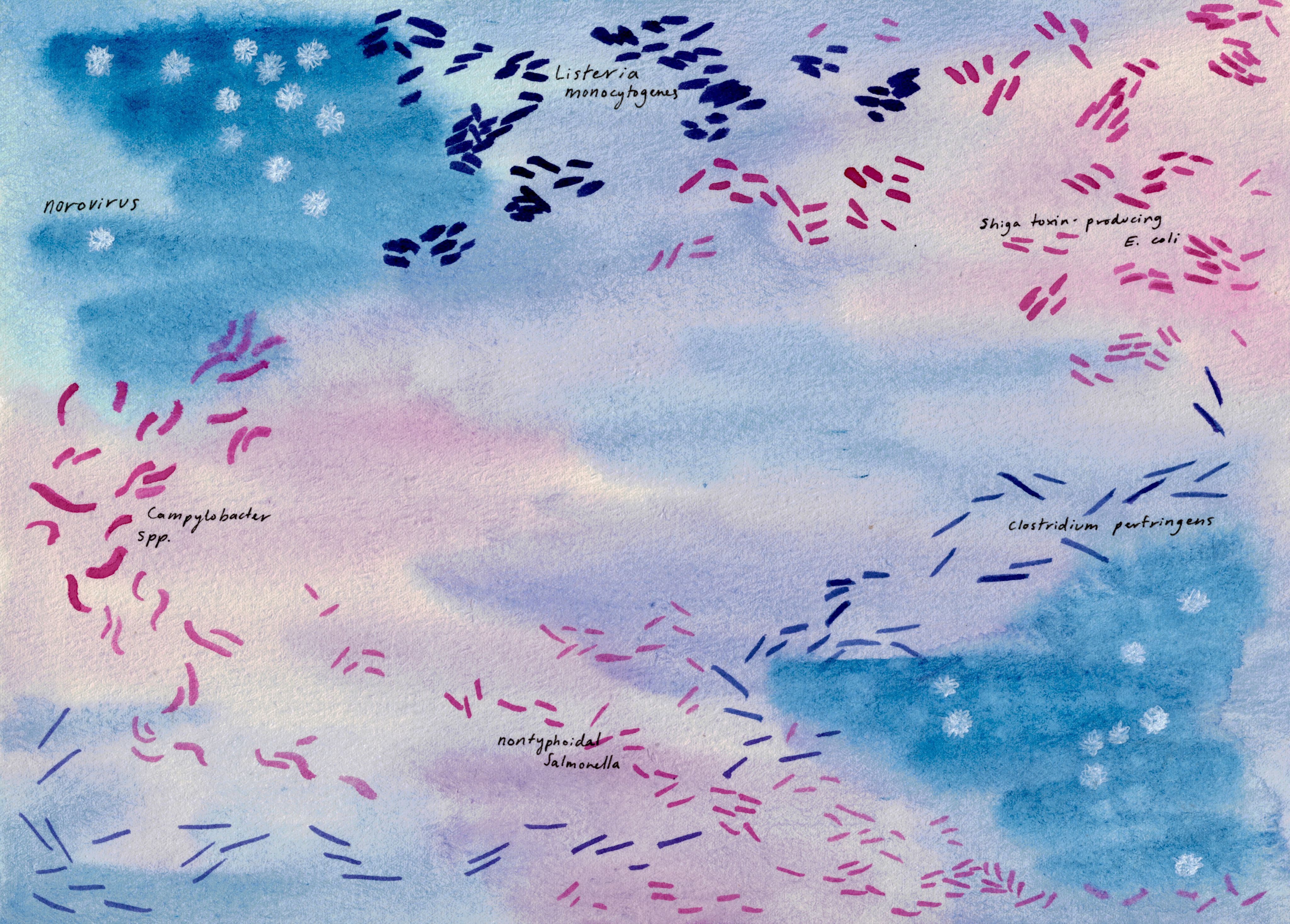 Pathogens Mosaic by Lynne Altow, Medical Student, University of British Columbia, Canada. This watercolour piece displays common food-borne pathogens in gram-stain and electron micrograph form across washes of pinks, purples, and blues.