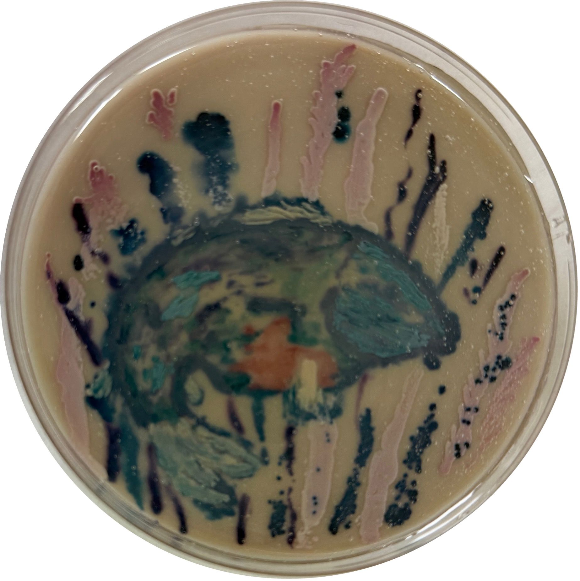 Food Choice, Microbial Consequence: Aquaculture and Food Safety on Chromogenic Media by Iacob Ana Maria, “Ion Ionescu de la Brad” University of Life Sciences, Iași, Romania. This work presents a microbiological view of food safety at the aquaculture–consumer interface using chromogenic media. A carp, recreated on UriSelect agar, forms a polymicrobial landscape reflecting contamination, handling, and animal health. Bacterial and yeast isolates were pre-identified by MALDI-TOF MS (Zybio) and selected for characteristic chromogenic reactions and pigment expression. Rather than highlighting a single pathogen, the image shows how risks arise from multiple microbial actors. For biosafety and preservation, the plate was permanently sealed with epoxy resin after incubation.