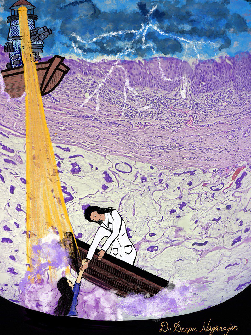Diagnosis: True saviour of life by Deepa Nagarajan, Resident DM Oncopathology third year, Gujarat cancer and research institute, Ahmedabad, Gujarat, India. A patient is lost in a pool of mucin, symbolizing diagnostic uncertainty, and is guided to safety as the microscope transforms into a lighthouse – casting the light of diagnosis that leads the doctor to save a life.