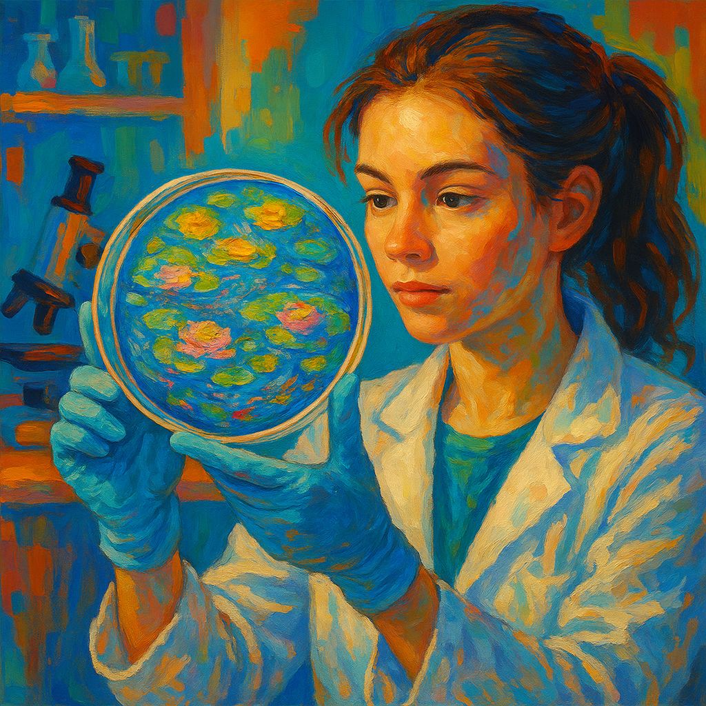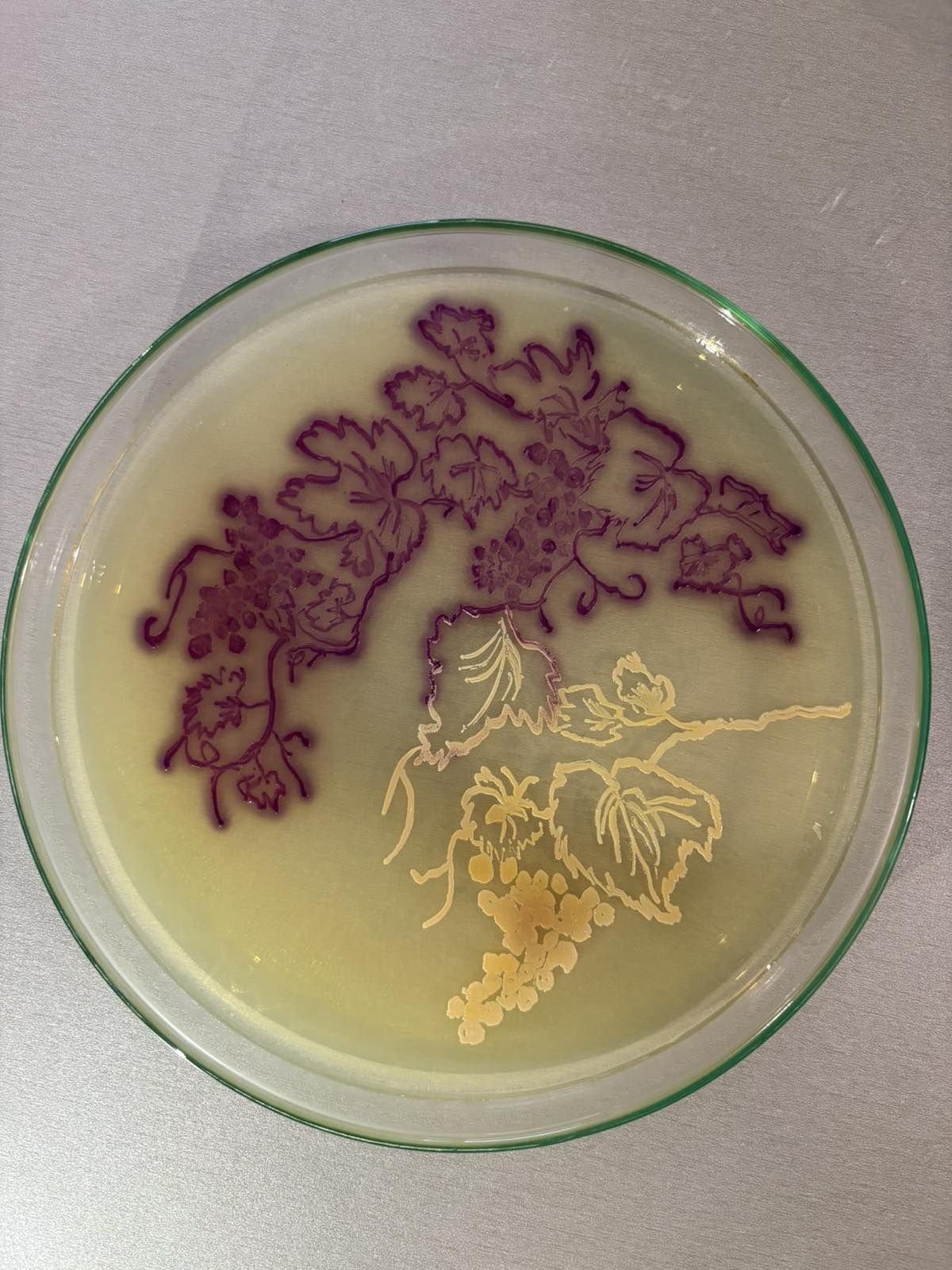 Grapes Through a Microbiologist’s Eye by Selma Habibović, Specialist in Medical Microbiology, Institute of Public Health Novi Pazar, Serbia. Food safety depends on microorganisms, which quietly shape quality and hygiene. On HiMedia Blood Agar, Staphylococcus aureus, forming its typical grouped colonies, creates a grape-like shape – symbolizing fertility and fermentation. Beside it spreads a leaf formed by Pseudomonas aeruginosa, reflecting microbial flows during food processing and storage. The grape and leaf merge the aesthetics of produce with microbial risks and benefits. Inspired by European food culture, this work highlights the crucial role of microorganisms in food safety, reminding us that hygiene and quality begin long before food reaches the table.