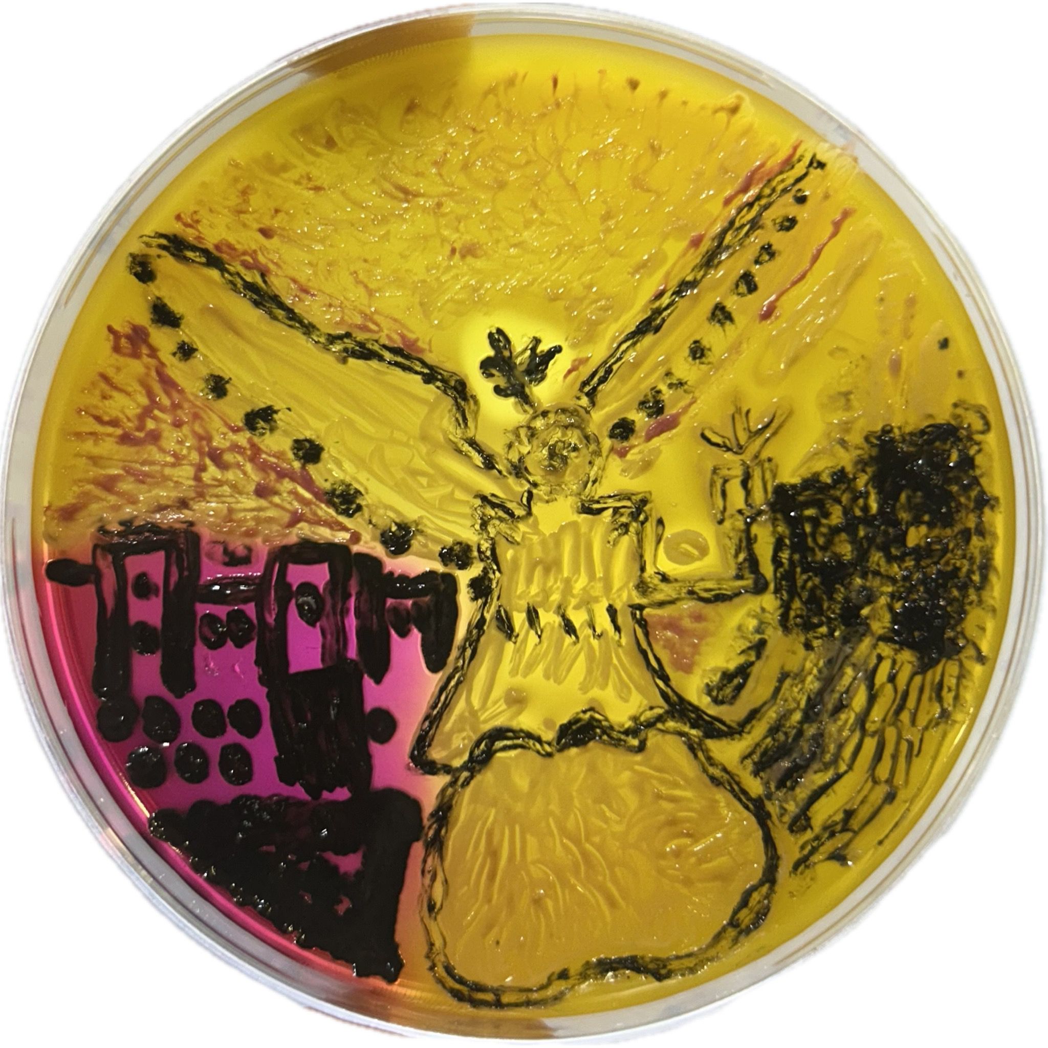 Angel of Peace by Aleksandra Jovanović, Specialist in Medical Microbiology, General Hospital Valjevo, Belgrade, and Institute for Laboratory Diagnostics Biomedica, Belgrade, Serbia. Perched on a pedestal, the Angel of Peace (Friedensengel) overlooks the city. Created on XLD medium from Salmonella Enteritidis, Klebsiella pneumoniae, Proteus mirabilis, and Pseudomonas aeruginosa, it represents bacteria that can contaminate food and threaten health. Just as the angel guards the city, food safety protects consumers from unseen risks.