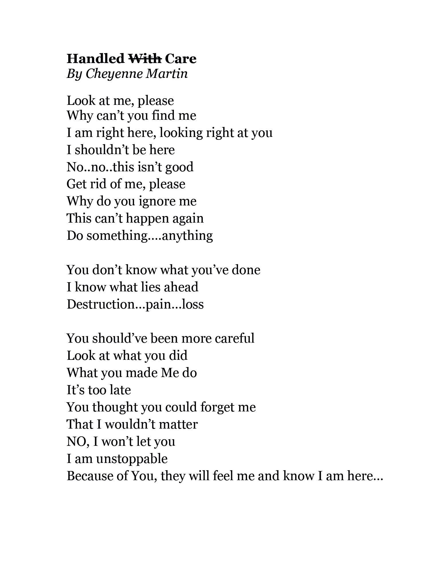 Handled with Care by Cheyenne Martin, Second-Year Medical Student at Ponce Health Sciences University, St. Louis, Missouri, USA. Through dark imagery and unsettling dialogue, this poem personifies a pathogen in conversation with a food handler who has compromised food safety. It reveals how neglected sanitation allows contamination to flourish and harm future consumers. The work highlights the fragile boundary between routine behavior and public health risk, urging greater mindfulness in everyday food-handling practices.