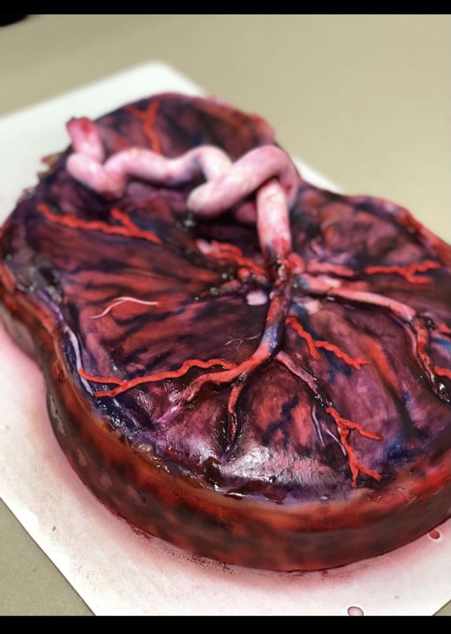 Placenta cake by Hollis H. Notgrass, Lead Pathologists' Assistant, Tissue Lab/Frozen Room Supervisor, UT Southwestern, Clements University Hospital, USA. I have been a self-taught cake decorator for more than 20 years, alongside a career in pathology that is nearly as long. One of the most meaningful moments of my life was creating the groom’s cake for one of my PA students, who proposed to the love of his life in our laboratory using a heart-shaped anatomical “ring box.” They later asked me to recreate that heart in cake form for their wedding, which I made as a red velvet cake covered in fondant. Other favorite creations for our pathologists and staff milestones include a placenta cake, a kidney cake, a “cuterus” cake for one of our HTs, a mandible cake topper made of fondant, and a farewell cake for a PA colleague complete with fondant “tools.” I love the intersection of my lifelong hobby and my career in pathology, and I would be delighted to be part of the PathArt project – although I’m not sure how well it fits under “food safety,” except to say these are the only pathology “specimens” I’d ever consider bringing to a party.