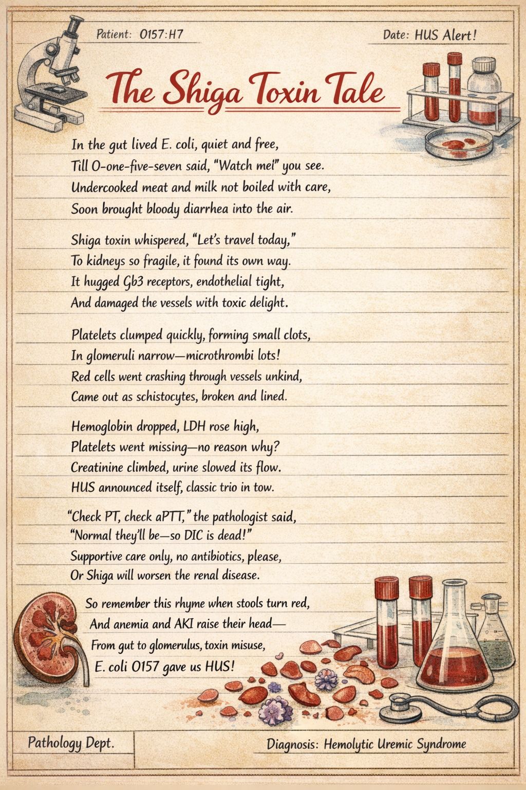 The Shiga Toxin Tale by Smitirupa Mishra, Consultant Pathologist, Sparsh Hospital, Bhubaneswar, India. This is my creative food safety-themed poem that vividly explains E. coli O157:H7-induced hemolytic uremic syndrome, tracing the journey of Shiga toxin from gut infection to microangiopathic hemolysis, thrombocytopenia, and acute kidney injury in a memorable, educational rhyme.