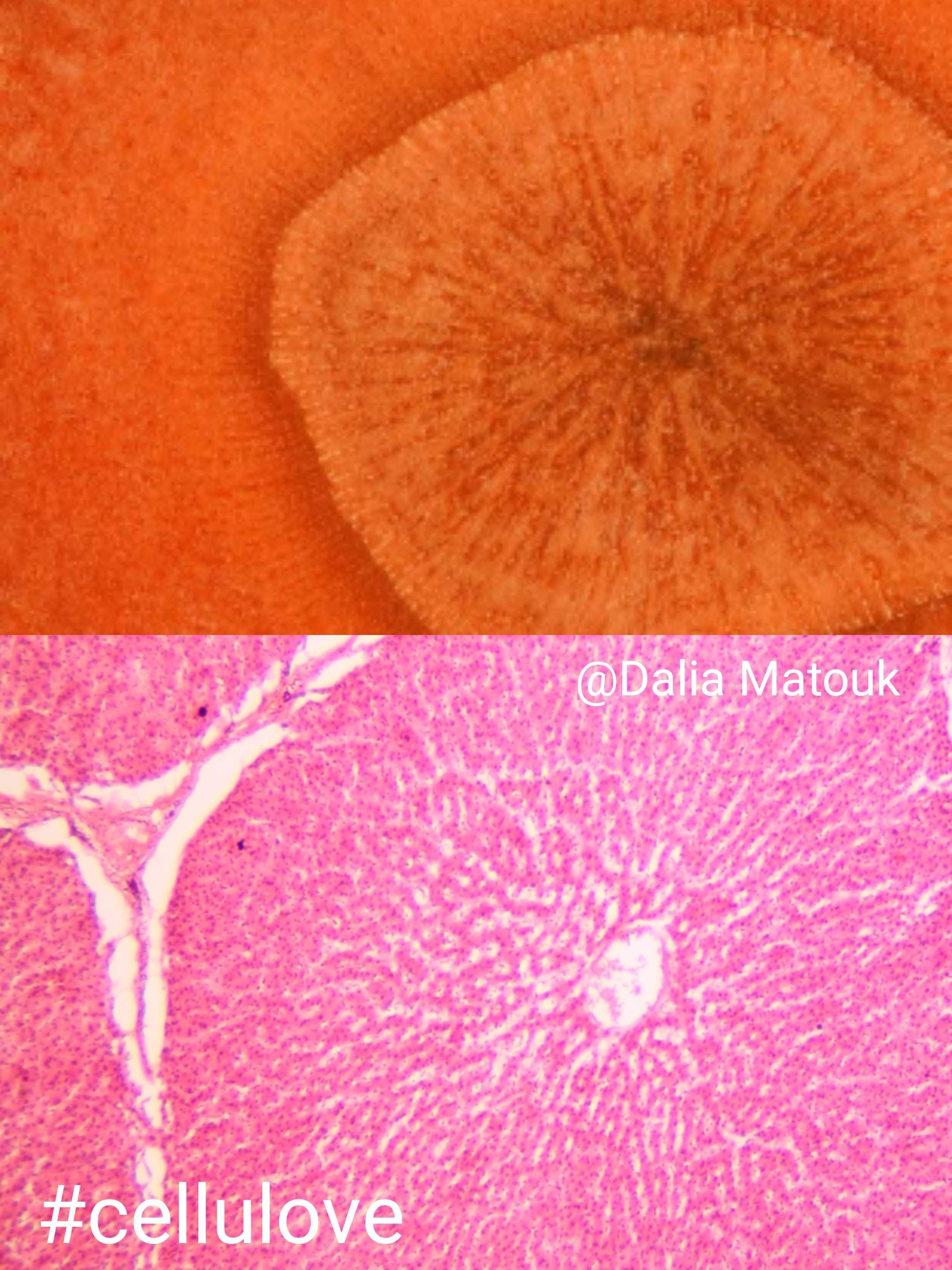 The Classic Carrot Lobule by Dalia Ahmed Yousef Yehia, Lecturer of Medical Histology and Cell Biology, Faculty of Medicine at Ain Shams University, Cairo, Egypt. Liver H&E x100. Patterns are the same everywhere! The classic hepatic lobule is the unit block of the liver tissue, it has a central vein and hepatocytes arranged in linear cords from the central vein in the same pattern of the heart of the carrot.