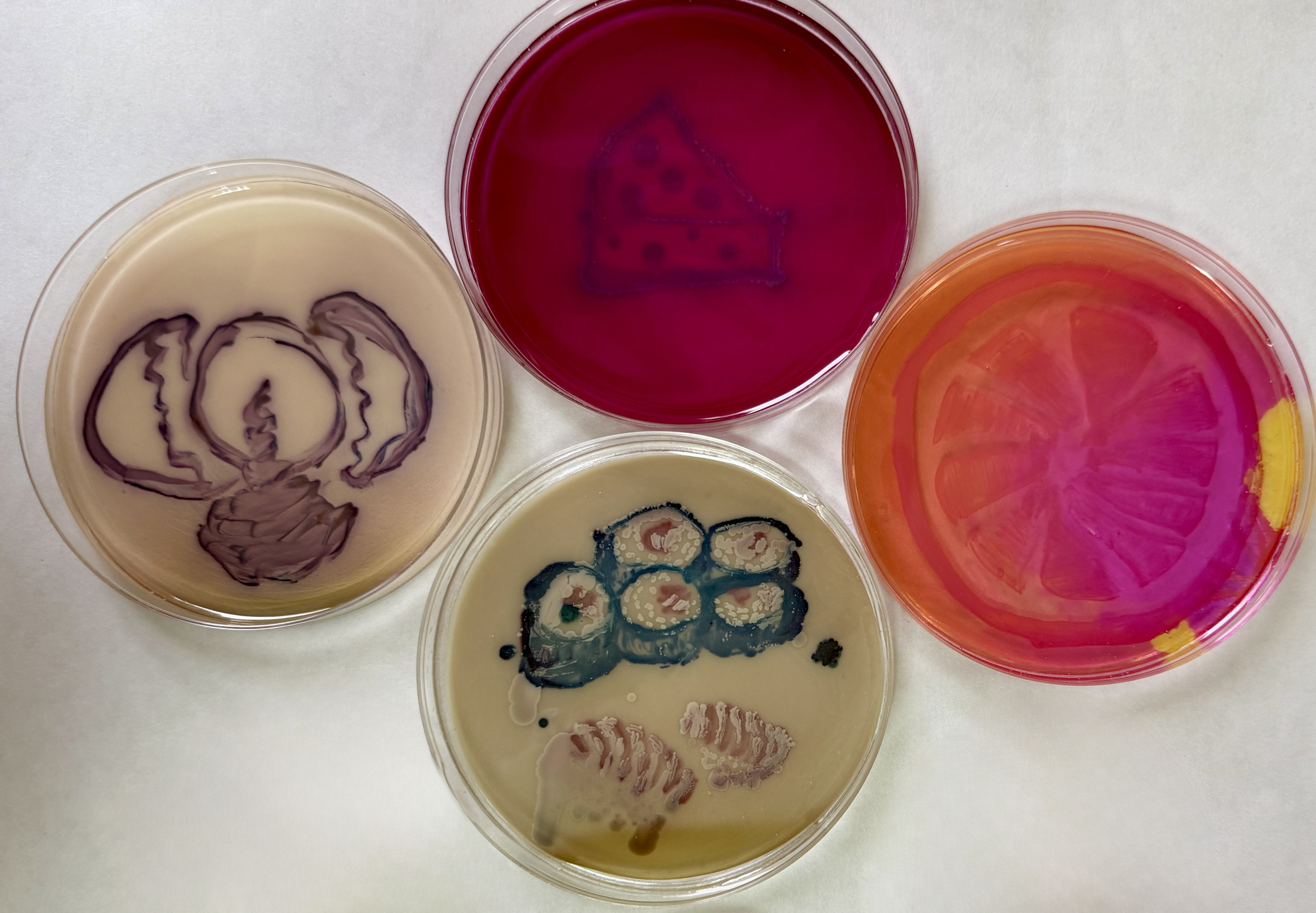 Everyday Food, Invisible Risk: Food Safety on Selective Media by Dana Ciausu-Sliwa, PhD student and research assistant at “Ion Ionescu de la Brad” University of Life Sciences, Iași, Romania. This series offers a microbiological interpretation of food safety using selective and chromogenic culture media. Familiar foods – egg, fermented cheese, citrus fruit, and sushi – are recreated with bacteria linked to foodborne transmission and hygiene control. Color changes and colony morphology reflect metabolic reactions within each medium, serving as diagnostic indicators rather than artistic effects. The work highlights how everyday foods and routine handling practices can carry risk. For biosafety, all plates were permanently sealed with epoxy resin after incubation.