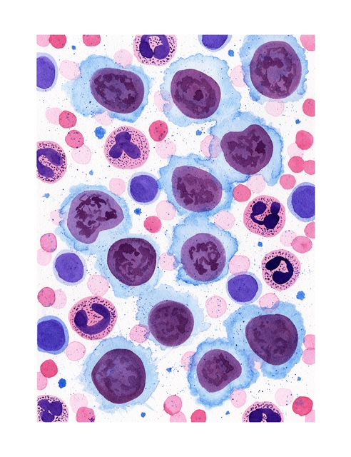 Acute Leukemia by Virginia Fernandez, Pathology Resident, Department of Pathology and Laboratory Medicine, University of Miami Health System/Jackson Memorial Hospital, USA. Large immature blasts crowd the field, replacing normal bone marrow cells. Their dark nuclei and minimal cytoplasm reflect rapid, uncontrolled growth and a failure of normal white blood cell maturation. Watercolor illustration.