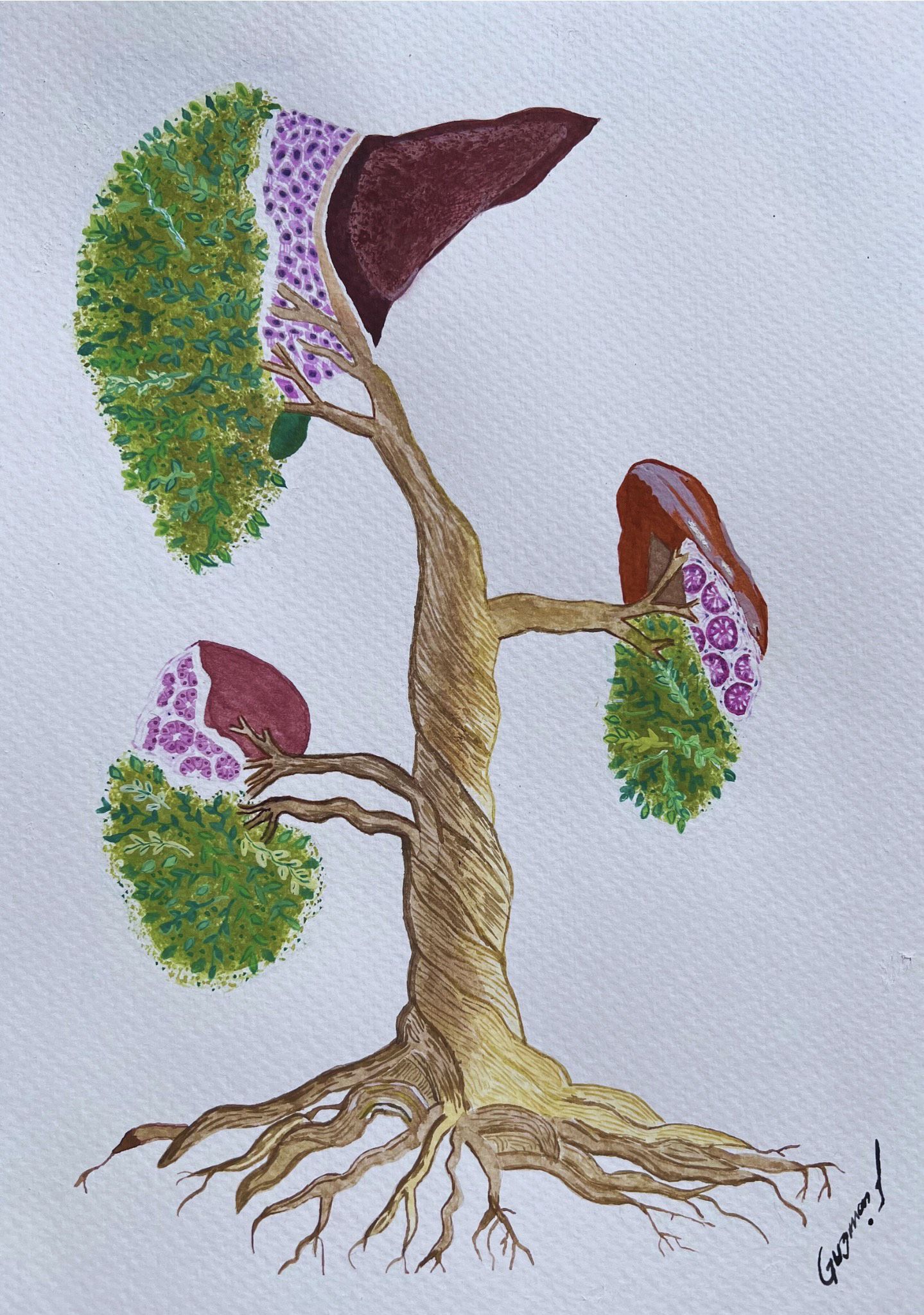 Health Grows from What We Cultivate by Jessica Guzmán, Pathologist, Department of Anatomical Pathology, Hospital Julio Méndez, Buenos Aires, Argentina. Through this piece, I aim to raise awareness about food-related health through art. The painting reflects the idea that the food chain begins with environmental hygiene – care for the environment, soil protection, water quality, and responsible pesticide use – all of which are essential to preventing foodborne disease, a persistent global public health challenge. The image features a large, healthy tree whose branches form shrubs shaped like infradiaphragmatic organs involved in digestion, detoxification, and absorption. Each organ is divided into three sections, with histological tissues from other organs depicted within them, symbolizing interconnection – for example, pancreatic tissue within the kidney and colonic tissue within the spleen. I hope this work resonates with viewers worldwide, particularly patients and public authorities responsible for safeguarding food and environmental health.
