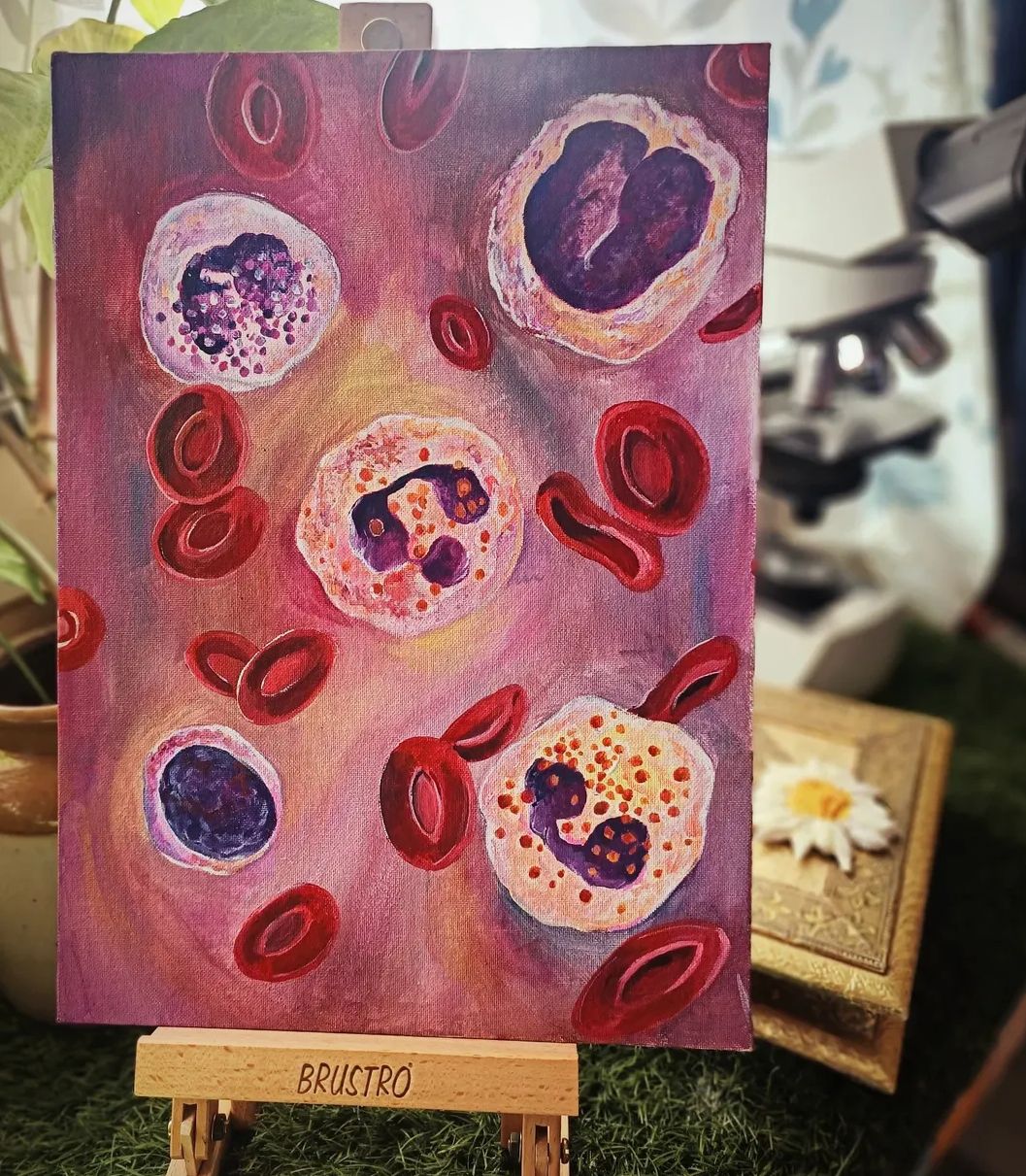 Symphony of Blood Cells by Nithya Jayakumar, Pathologist at Bettadur Diagnostics, Raichur, Karnataka, India. Original handmade painting in watercolor.