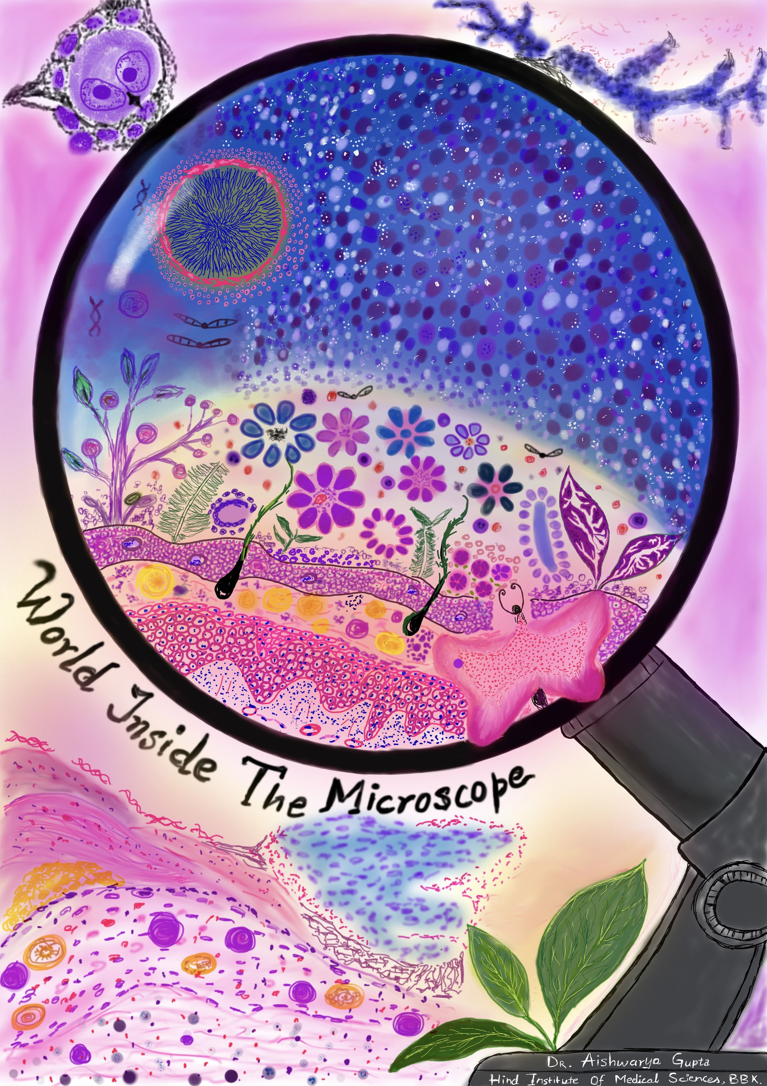 Microscopic Earth: A Pathologist’s Landscape by Aishwarya Gupta, 3rd year Junior Resident at Hind Institute of Medical Sciences, Barabanki, India. As our professors say, there is a whole new world inside the microscope, so I have depicted how nature and pathology are inseparably linked. This artwork reveals how microscopic patterns mirror the shapes and rhythms of the natural world. Within the microscope’s lens, realistic H&E-stained cells transform into a living landscape like epidermis becomes rolling land, hair follicles rise like climbing vines, rosette formations bloom into flowers, phyllodes patterns unfold into leaves, and actinomycetes radiate like the sun, with more waiting for the eyes to discover. This piece celebrates the beauty of pathology and the universe hidden within every slide and disease.