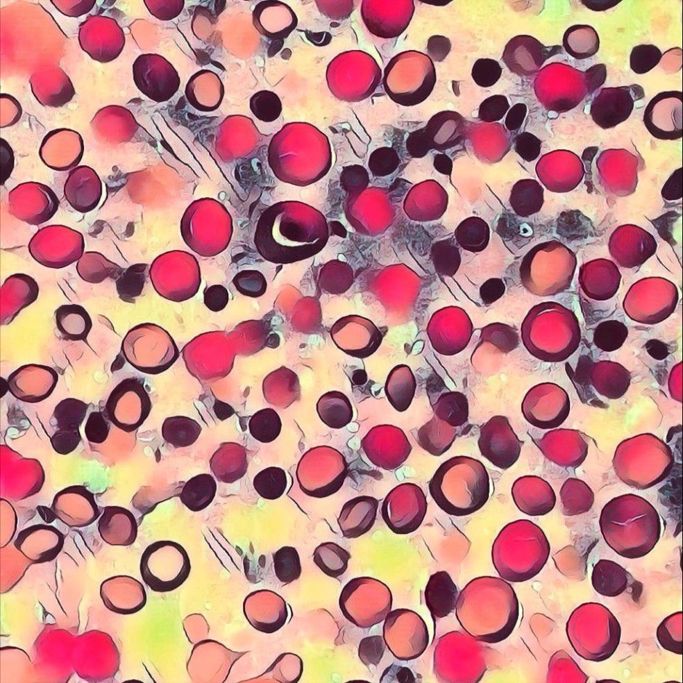 Pop-pathart by Aurélien Morini, Hospital Practitioner and Head of the Pathology Laboratory Department (Biopathology Division), GHEF, Marne-la-Vallée, Jossigny, France. This image merges a photo of red blood cells – enhanced with an app filter – that gives it the feel of a pop art–style painting.