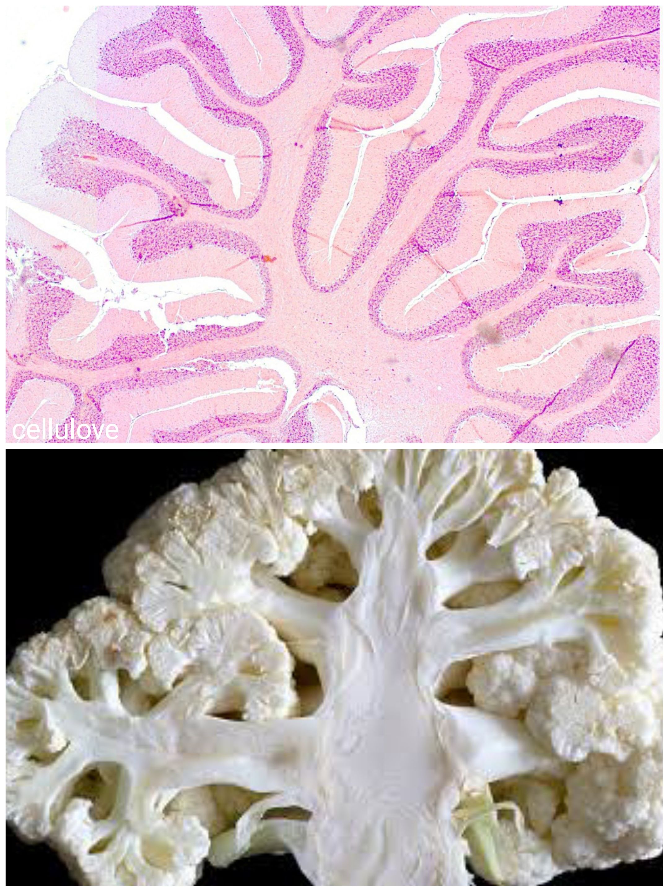 CauliBrain by Dalia Ahmed Yousef Yehia, Lecturer of Medical Histology and Cell Biology, Faculty of Medicine at Ain Shams University, Cairo, Egypt. Brain H&E x100. The resemblance between the cauliflower cut section and the brain cut section is amazing.